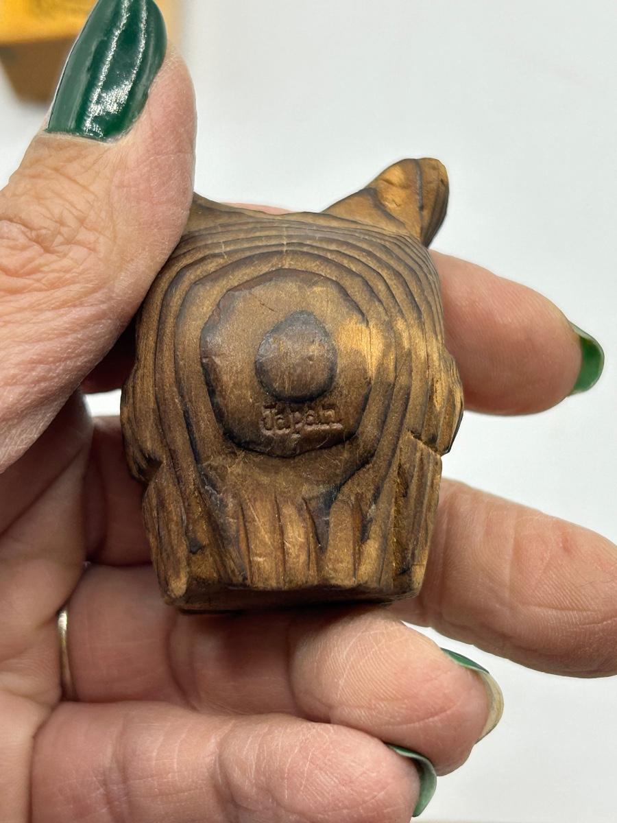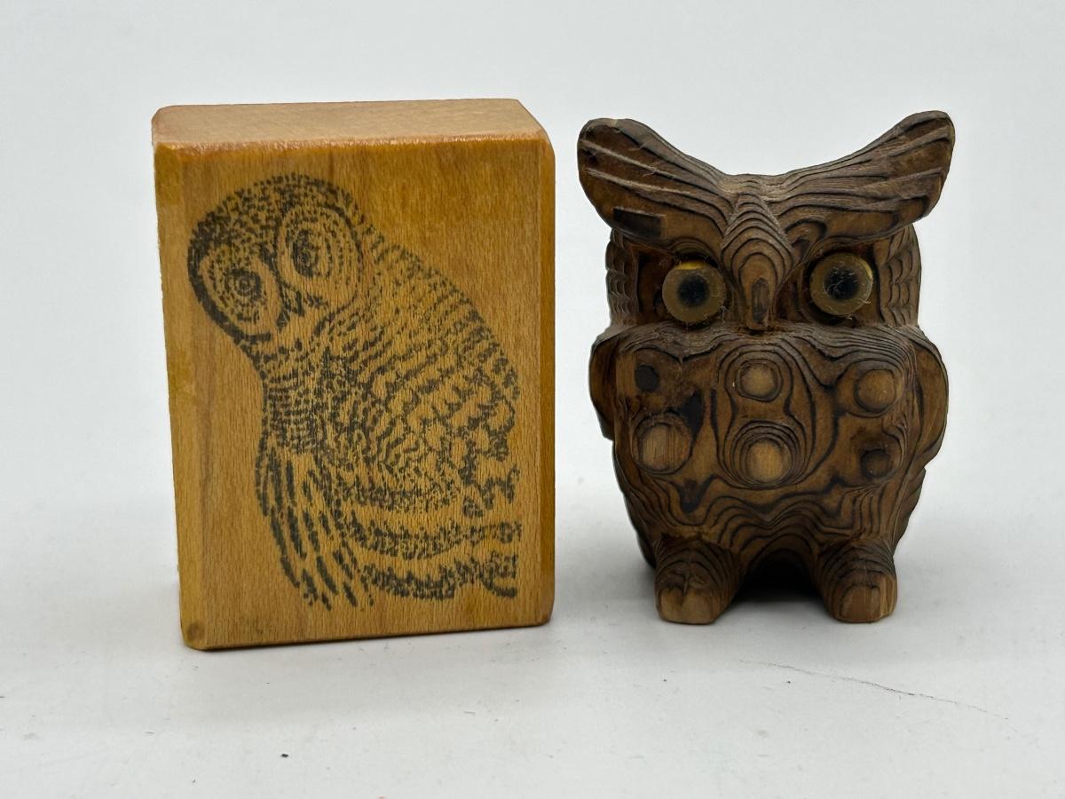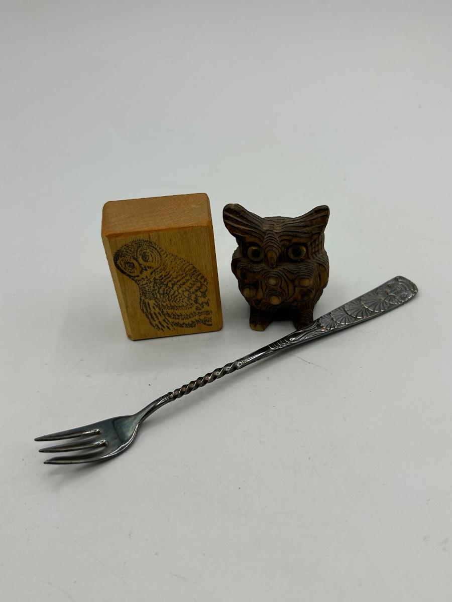 Owl Lovers trinket Lot Rubber Stamp Wooden Figurine and Small Fork. Cocktail fork has an owl image on the handle. In good vintage conditions.