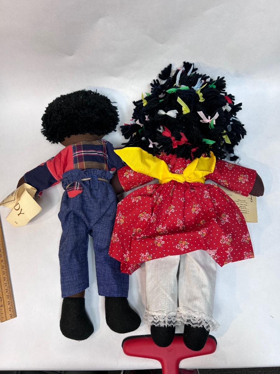 Vintage Original Gambina Dolls Ninkie and Jody African American Rag Doll Plush with Tags. Very similar to Raggedy Ann and Andy. Both have their original hang tags attached. About 16" size. In good condition.