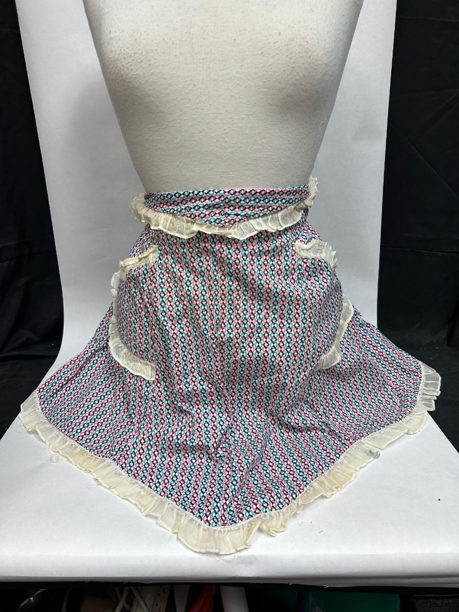 Vintage Pink Turquoise Blue and Black Geometric Mod Eyelet Lace Edged Half Apron