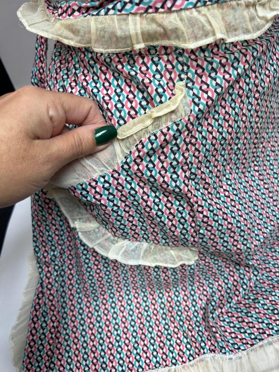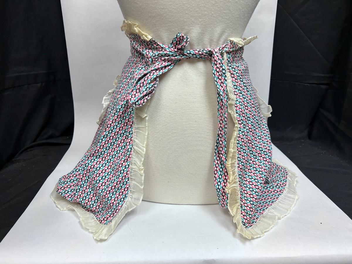 Vintage Pink Turquoise Blue and Black Geometric Mod Eyelet Lace Edged Half Apron. In good vintage condition. May have some light discoloration from use but no spots or stains.