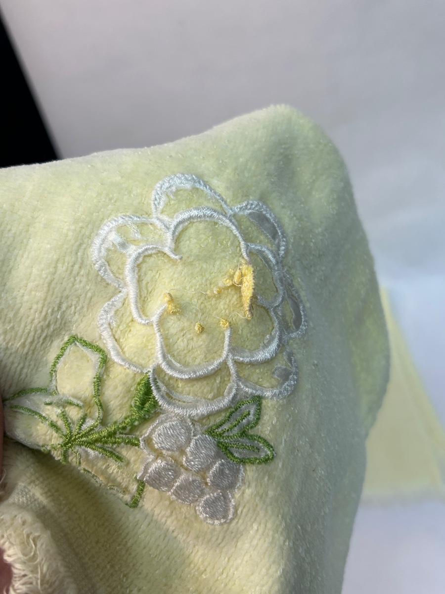 Lot of Three Flower Embroidered Hand Fingertip Towels. In vintage condition. No stains but some wear to the flowers, more so on the yellow towels. See photos.