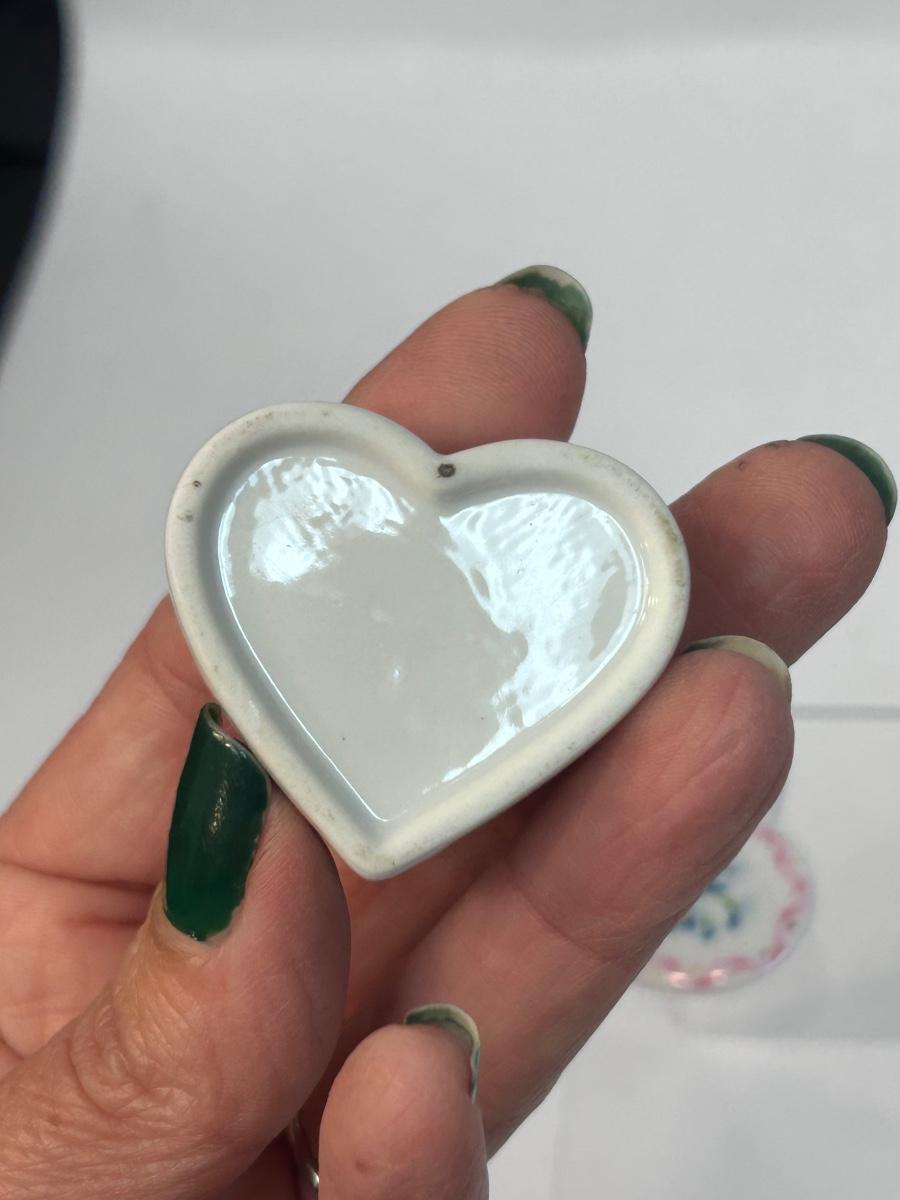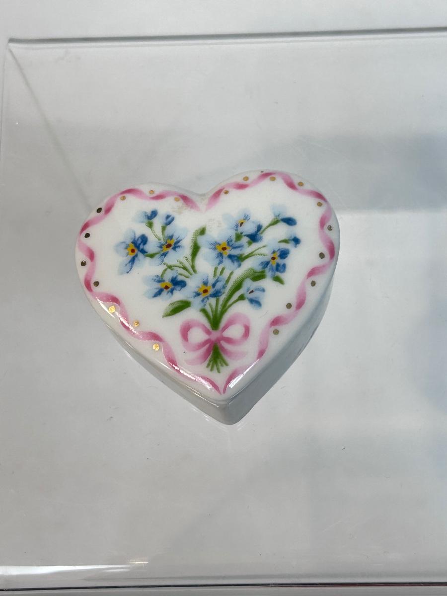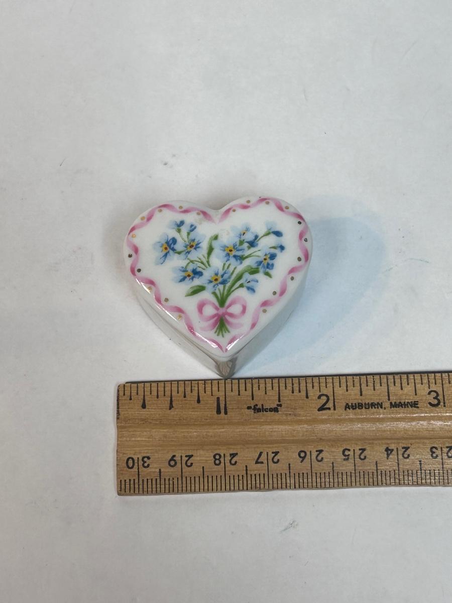 Vintage Retro Porcelain Heart Shaped Forget Me Not Flower Trinket Dish with Pin Lid