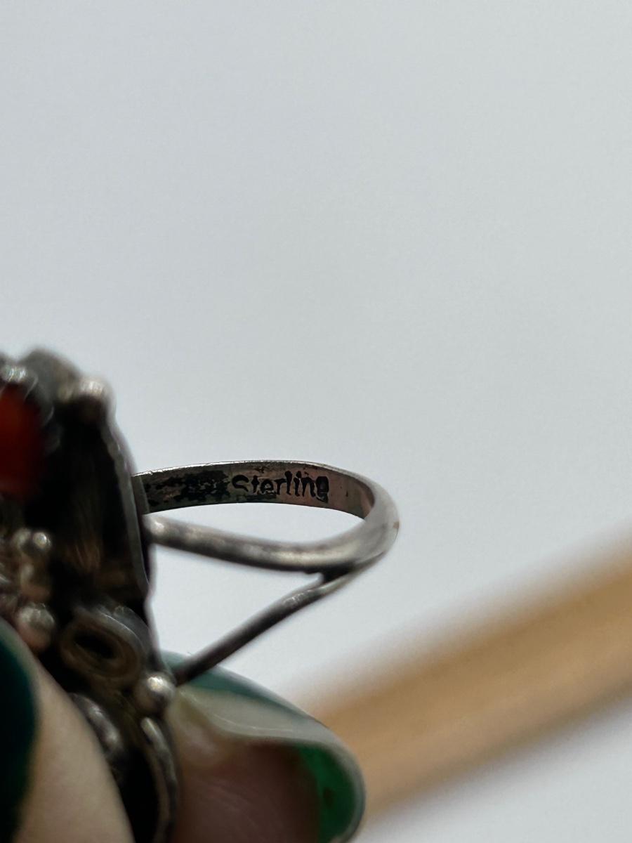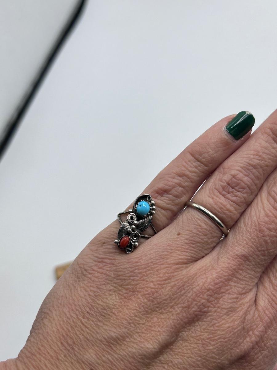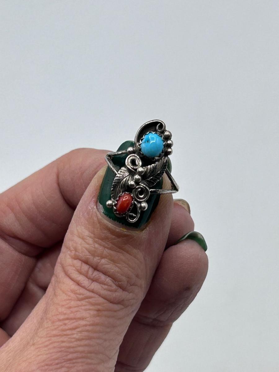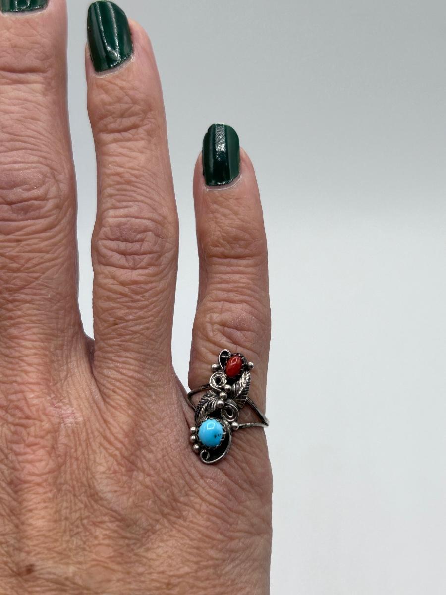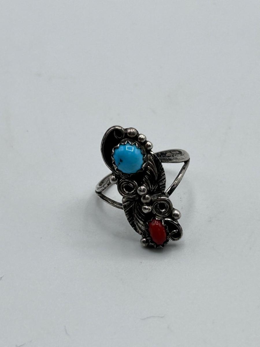 Sterling Silver Southwestern Style Turquoise and Red Coral Ring Size 5. Small size. In good condition.