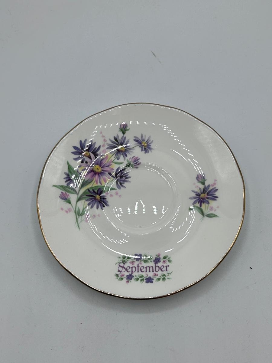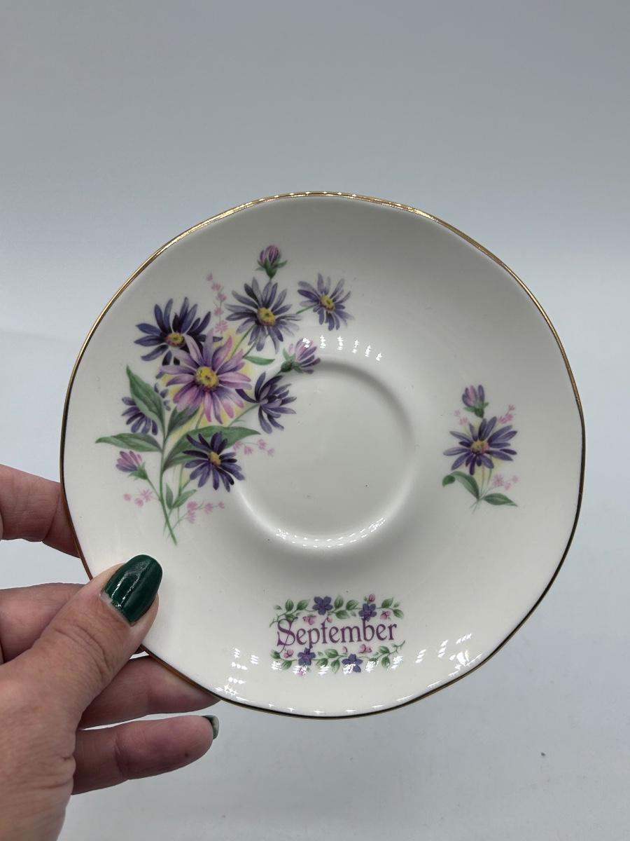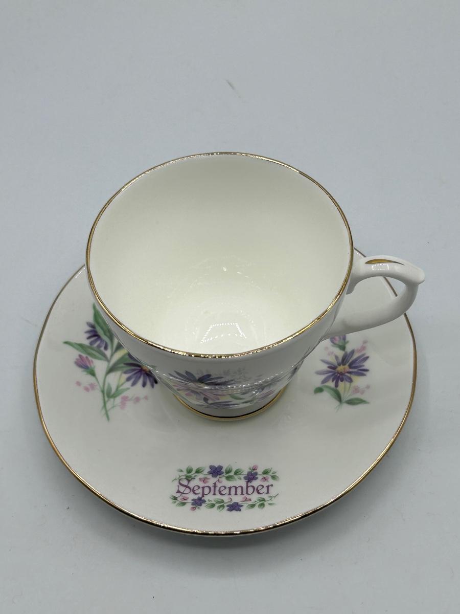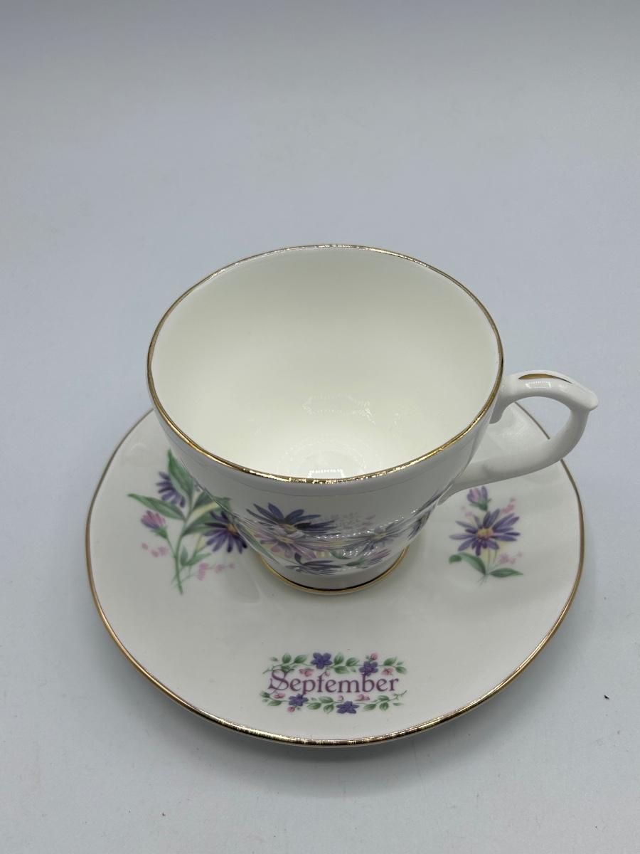 Royal Winchester Bone Chine Purple Flower September Teacup and Saucer. In good condition, no chips or cracks.