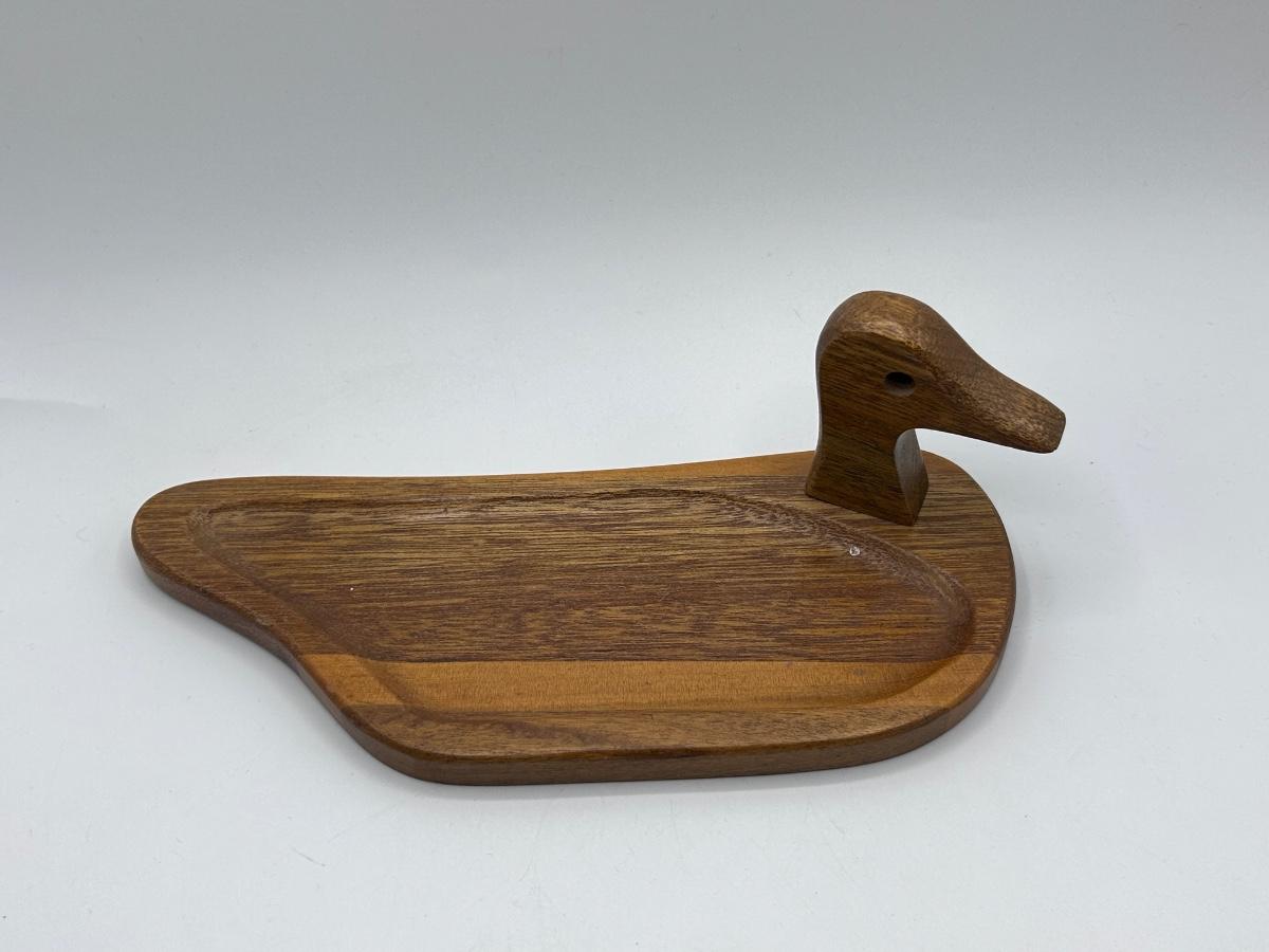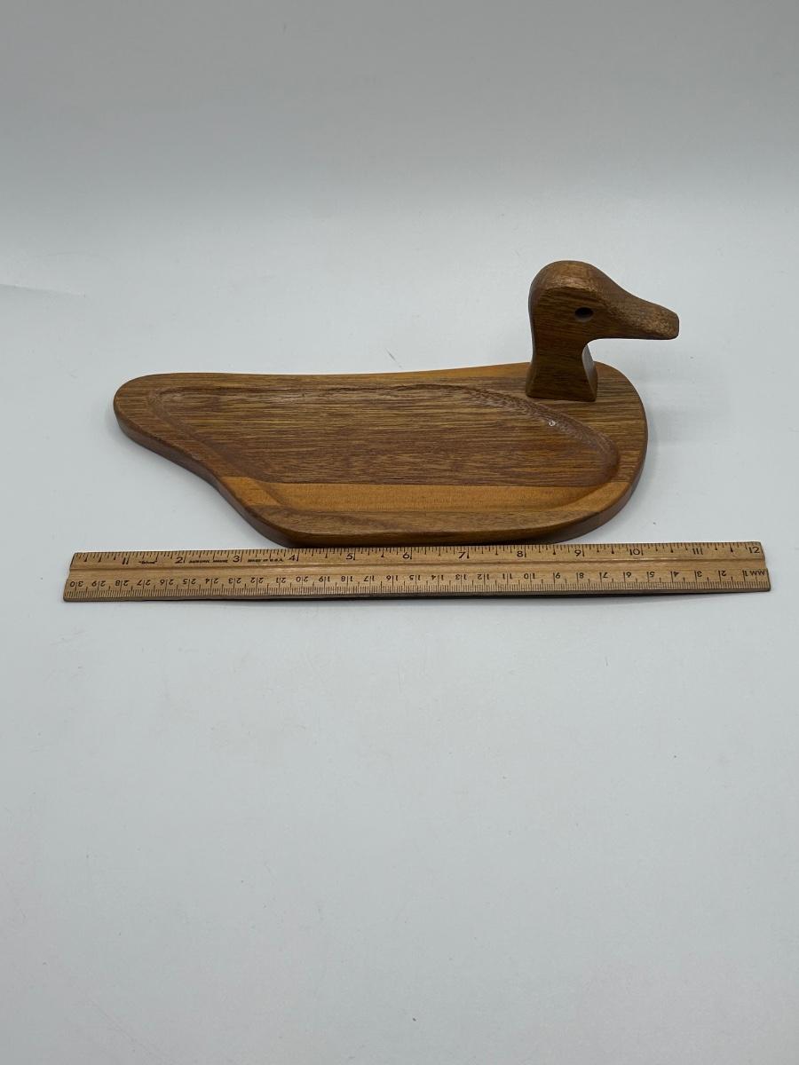 Wood Duck Shaped Wallet Valet Key Change Dresser Tray. In good condition. About 12" size.