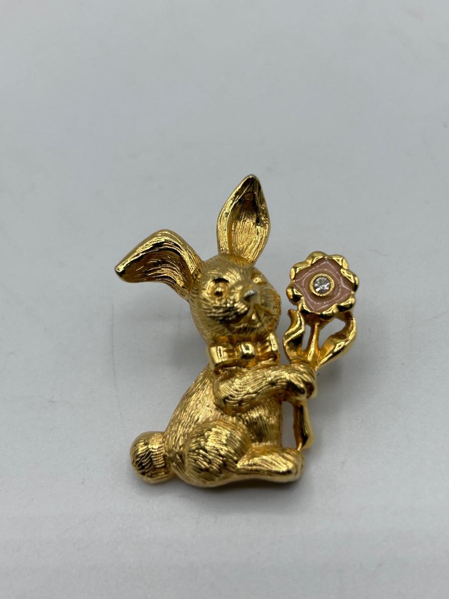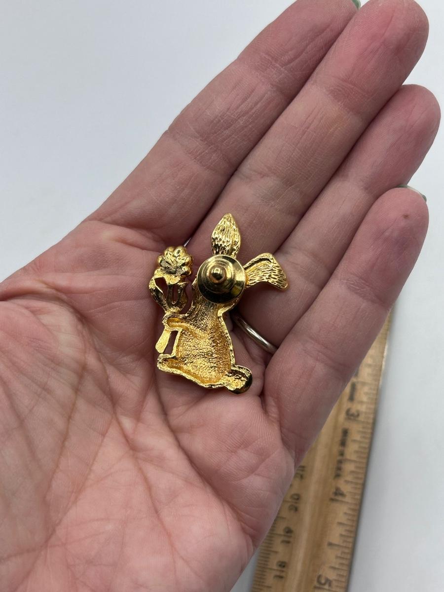 Vintage Gold Tone Easter Bunny Rabbit Holding Flower Lapel Pin