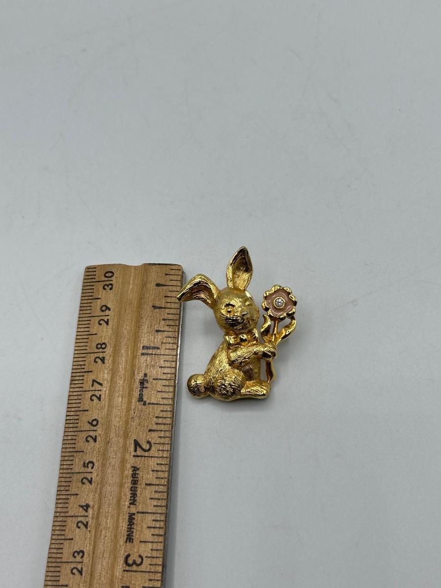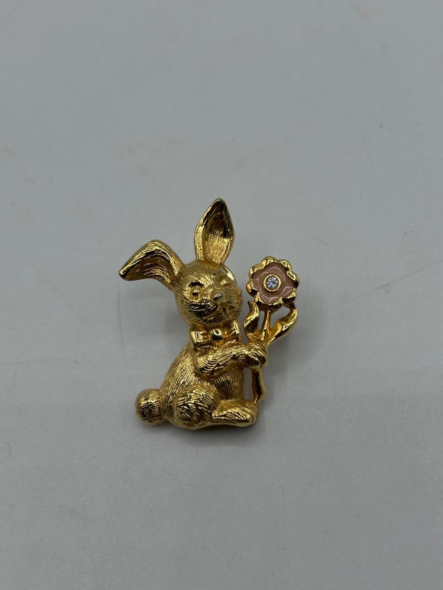 Vintage Gold Tone Easter Bunny Rabbit Holding Flower Lapel Pin. In good condition.