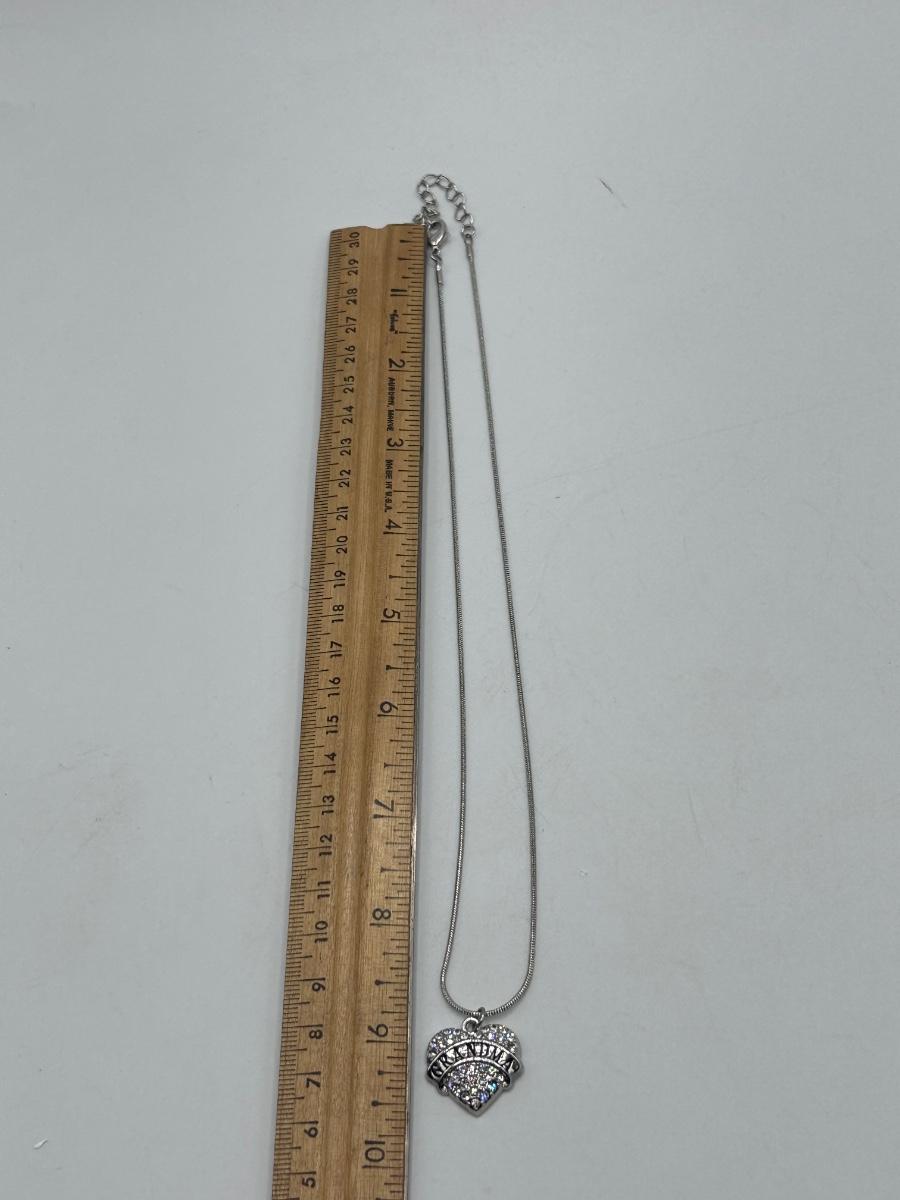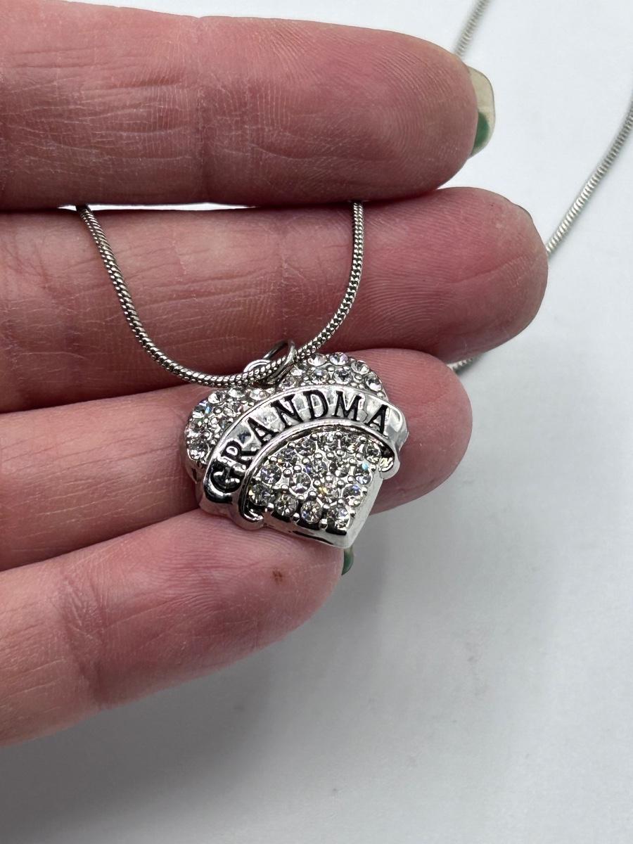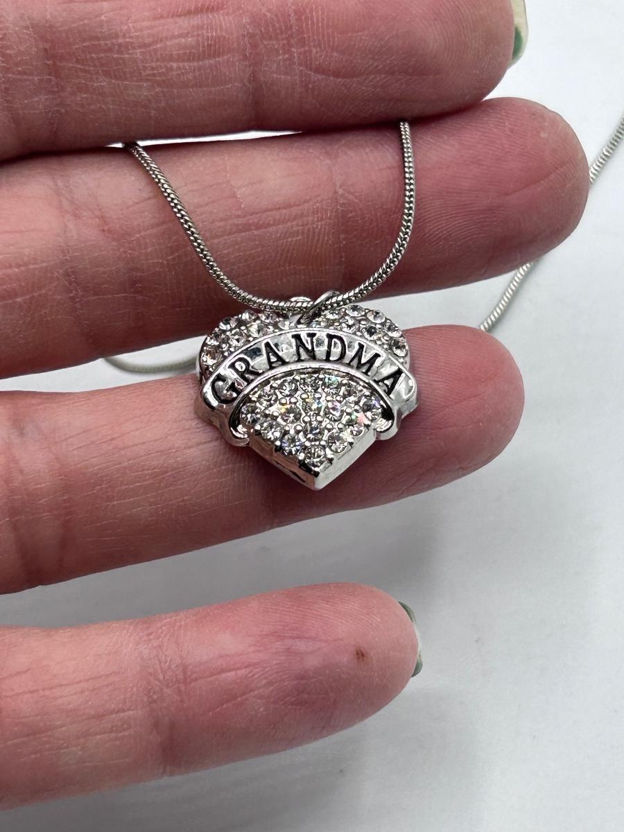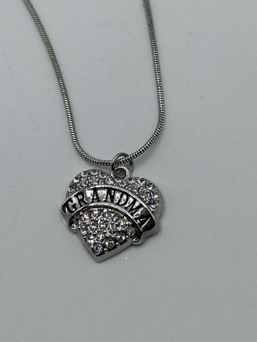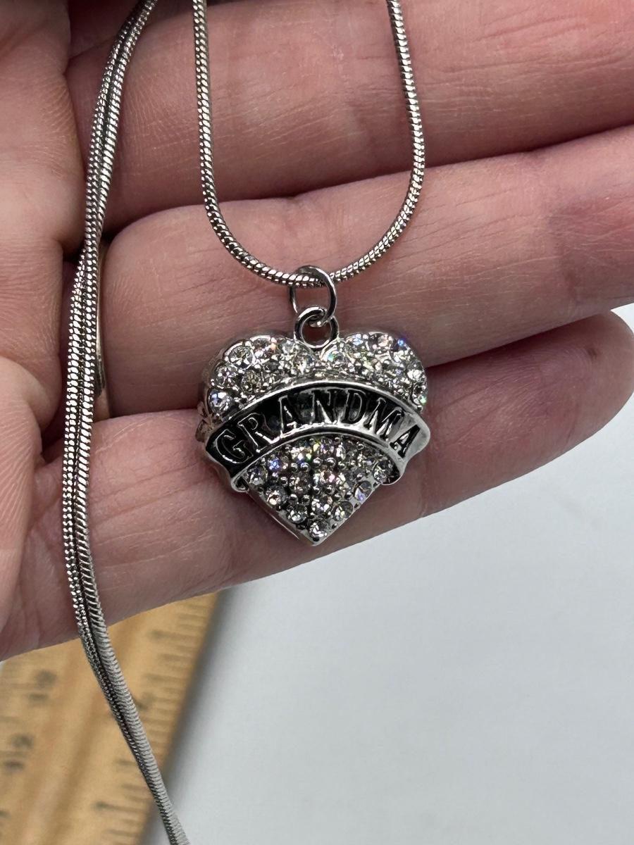 Silver Tone Rhinestone Covered Heart Shaped Grandma Pendant Necklace