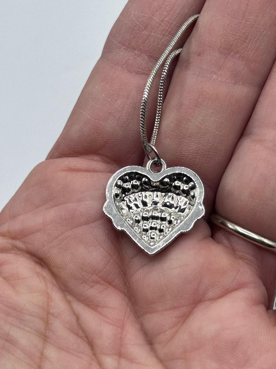 Silver Tone Rhinestone Covered Heart Shaped Grandma Pendant Necklace. Great sparkle, hard to capture on camera. In good condition, no sterling marks found though.