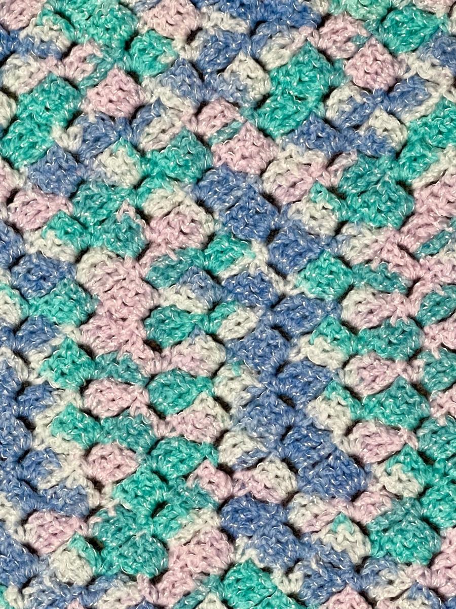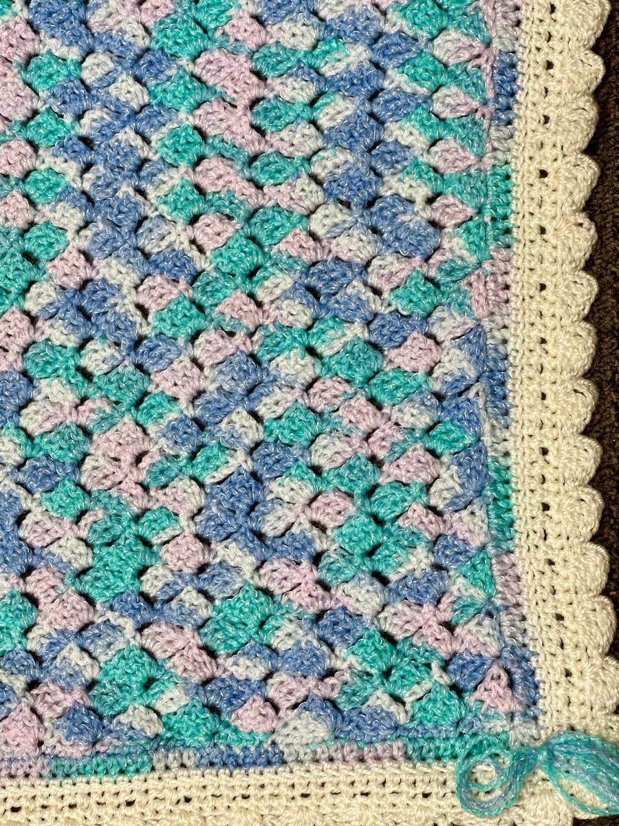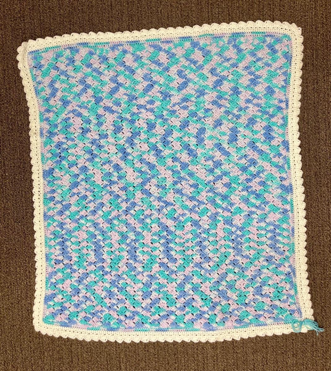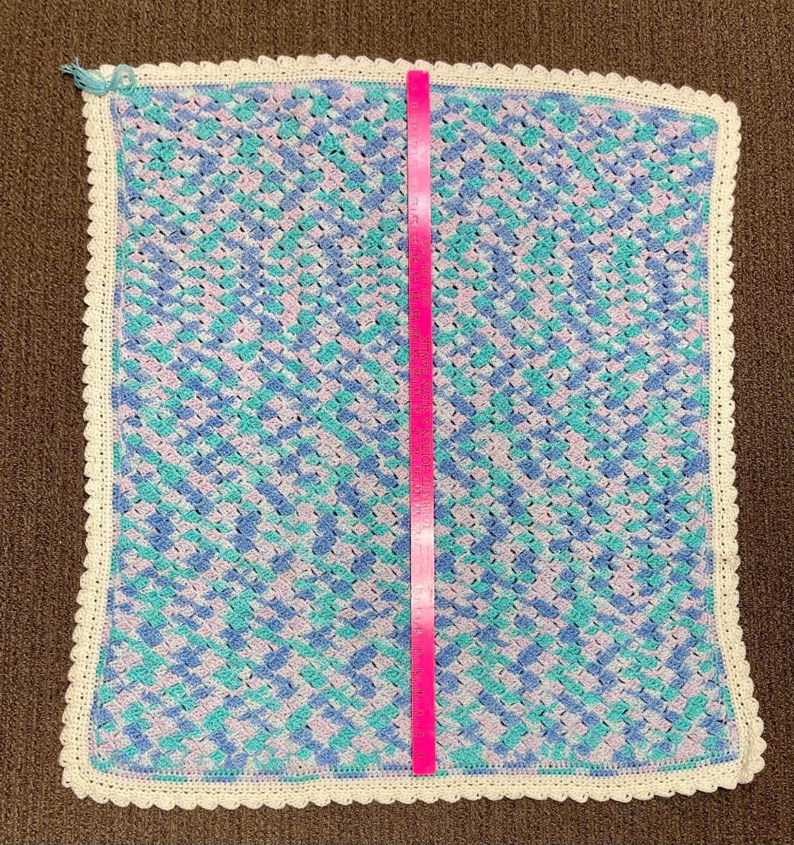 Hand Crocheted Baby Blanket or Lap Blanket - blue purple pink, white border