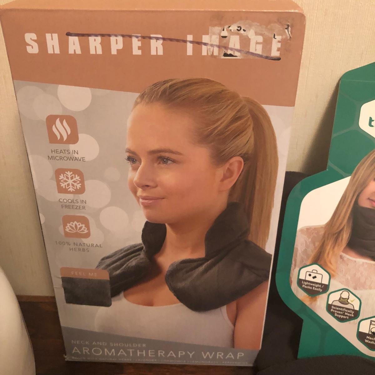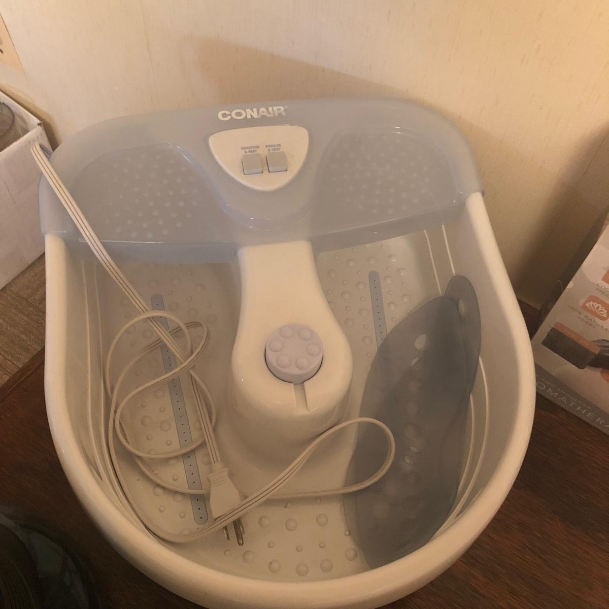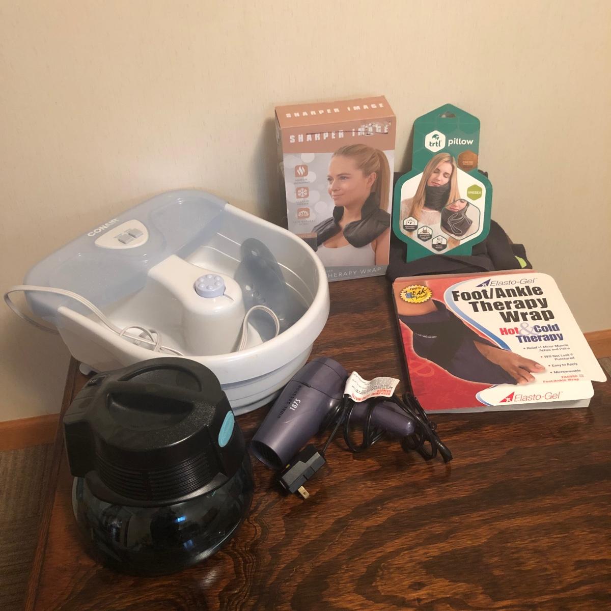 The health and comfort collection includes a Conair foot massage bath, Sharper Image Aromatherapy neck and shoulder wrap, Trtl pillow for travel sleep, foot/ankle therapy wrap, Rainmate IL humidifier, plus a Vidal Sassoon blow dryer. The humidifier measures 9.5" diameter x 9" tall. Shipping available.
