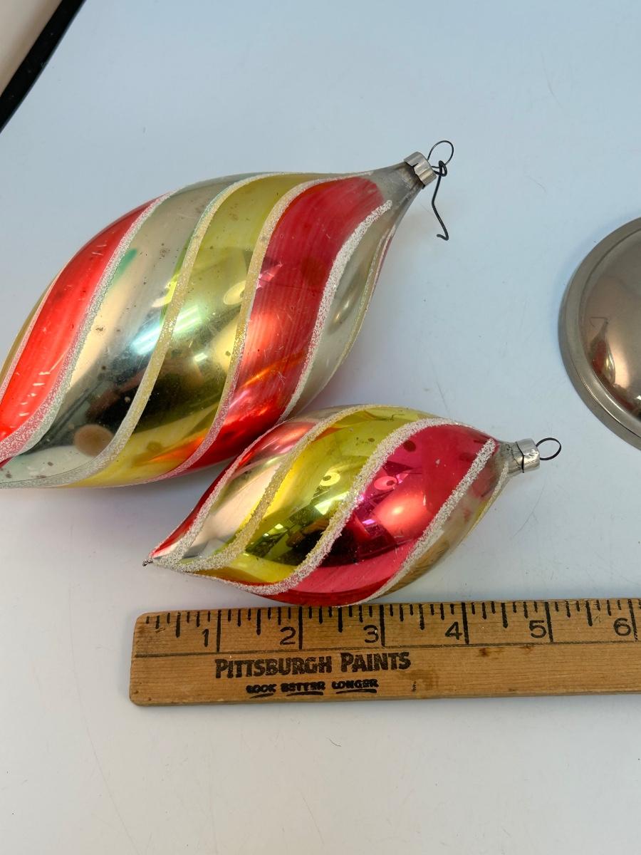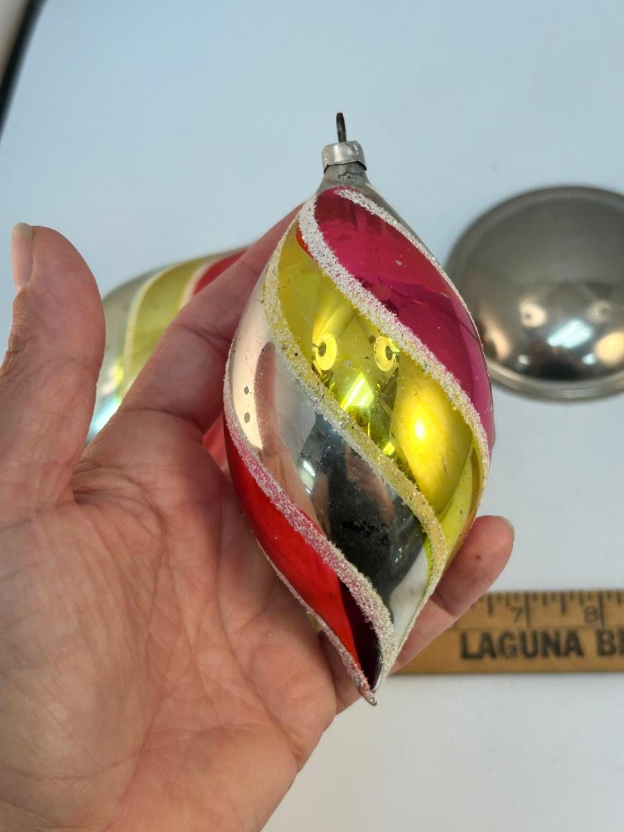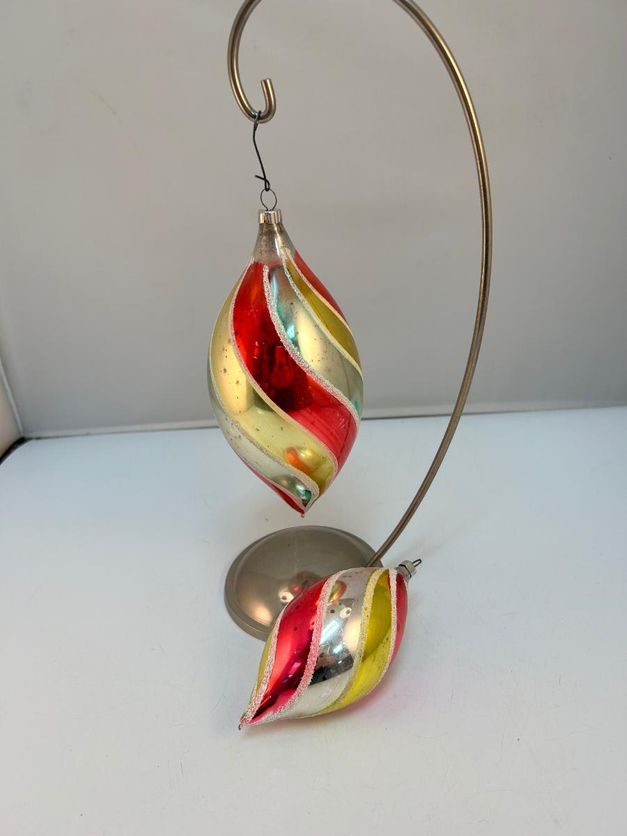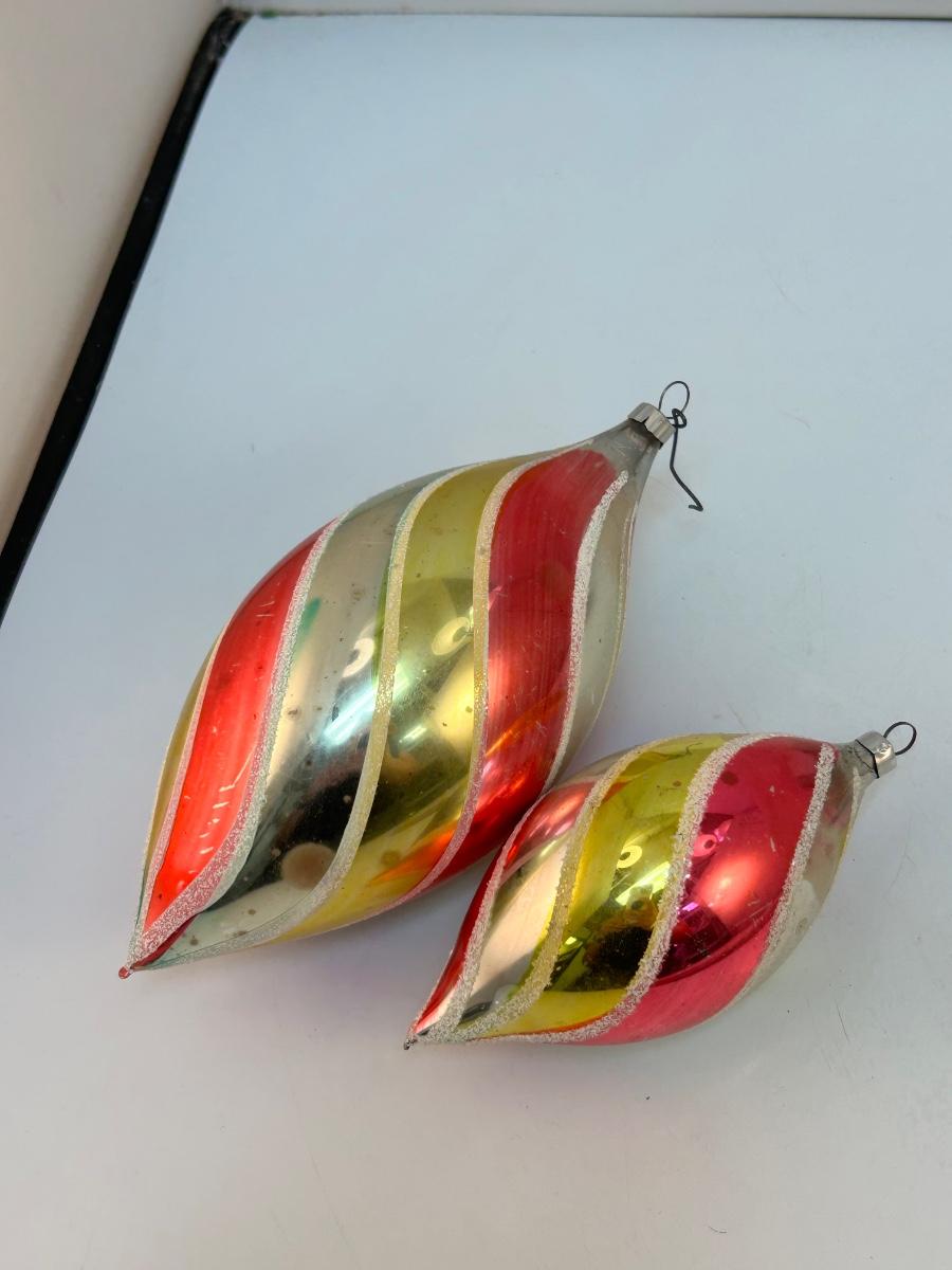 Pair of Spiral Striped Blown Glass Football Shaped Christmas Tree Holiday Ornaments. Some fade from age, look like they were red, yellow, green but the green has faded away. No cracks. Made in West Germany. 7" and 5" size. Stand not included.