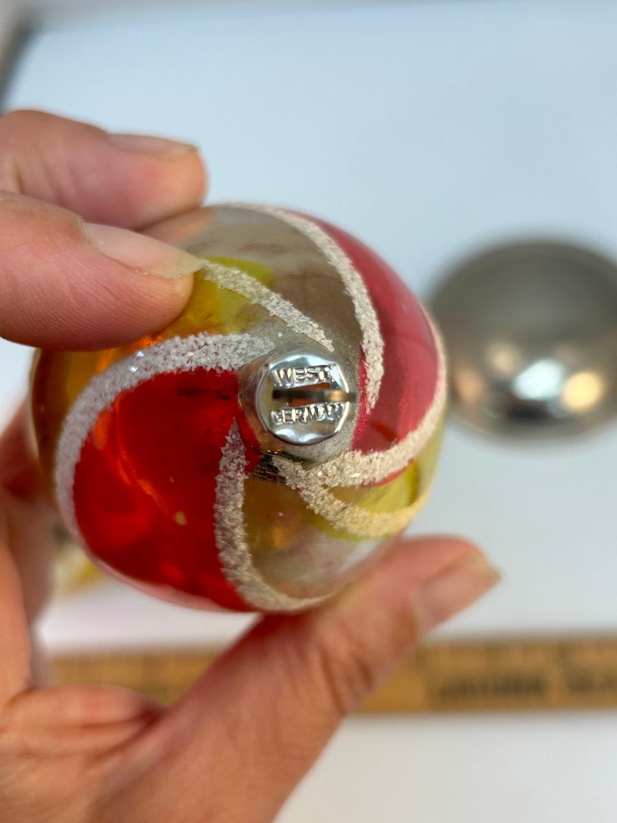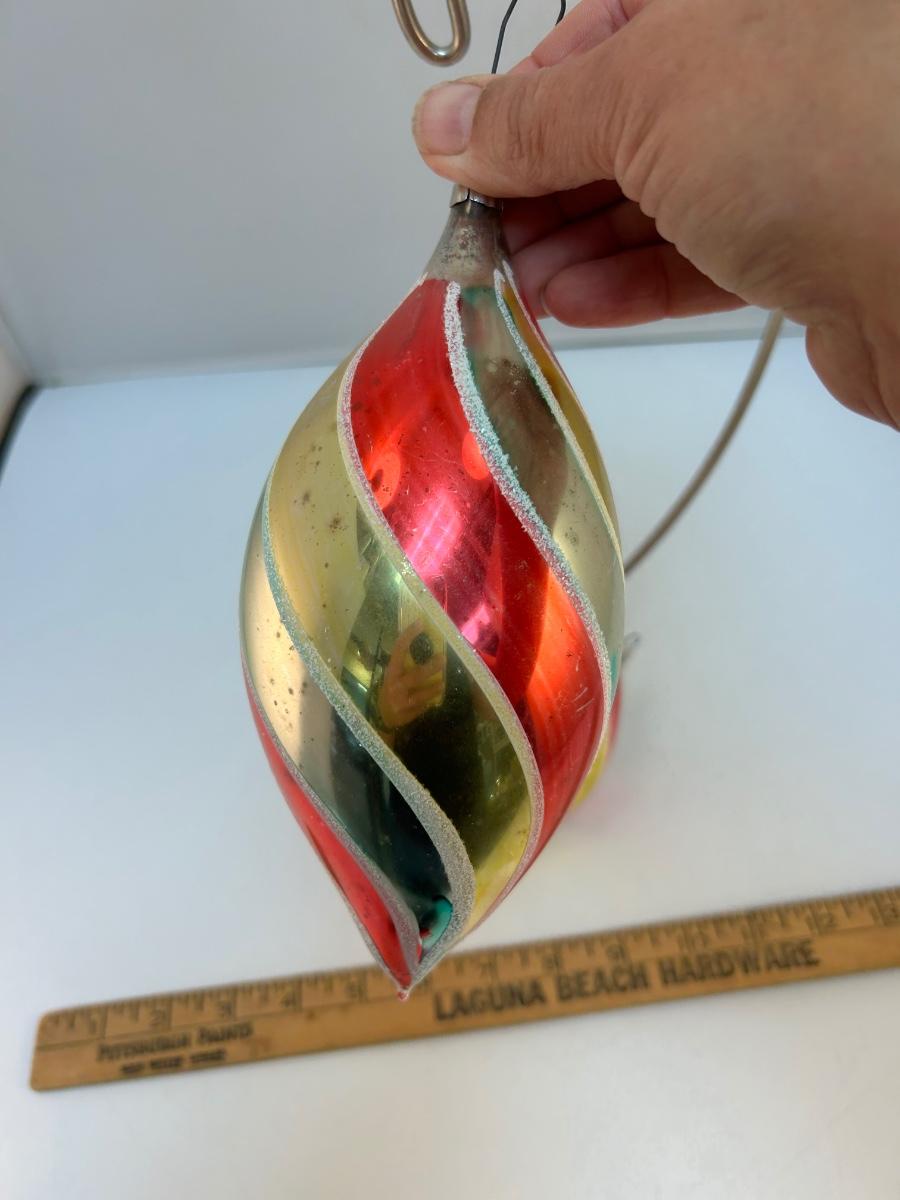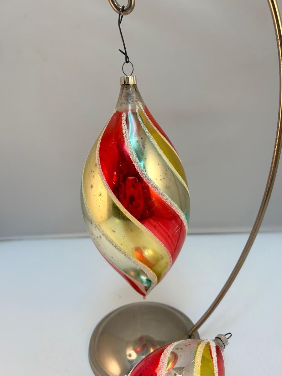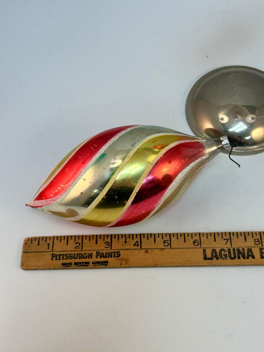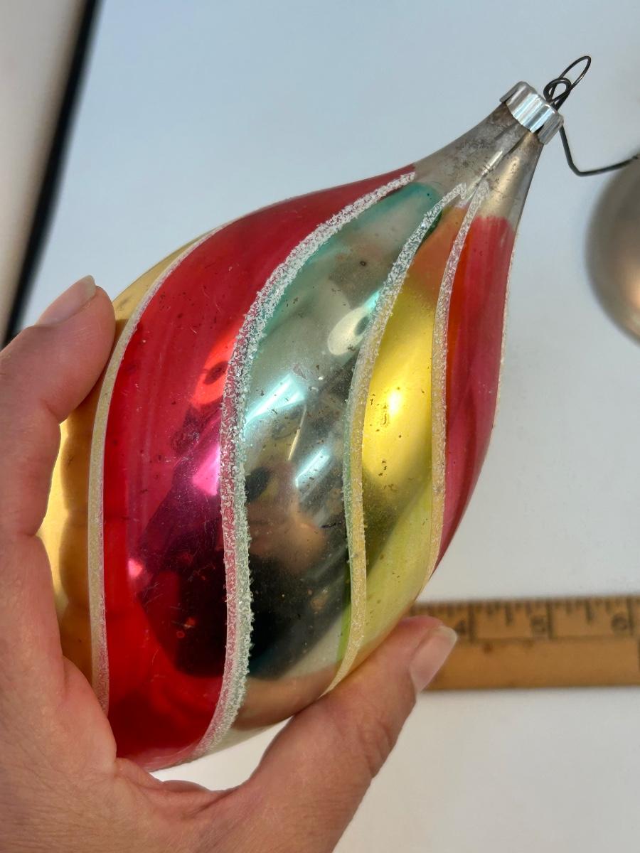 Pair of Spiral Striped Blown Glass Football Shaped Christmas Tree Holiday Ornaments. Some fade from age, look like they were red, yellow, green but the green has faded away. No cracks. Made in West Germany. 7" and 5" size. Stand not included.