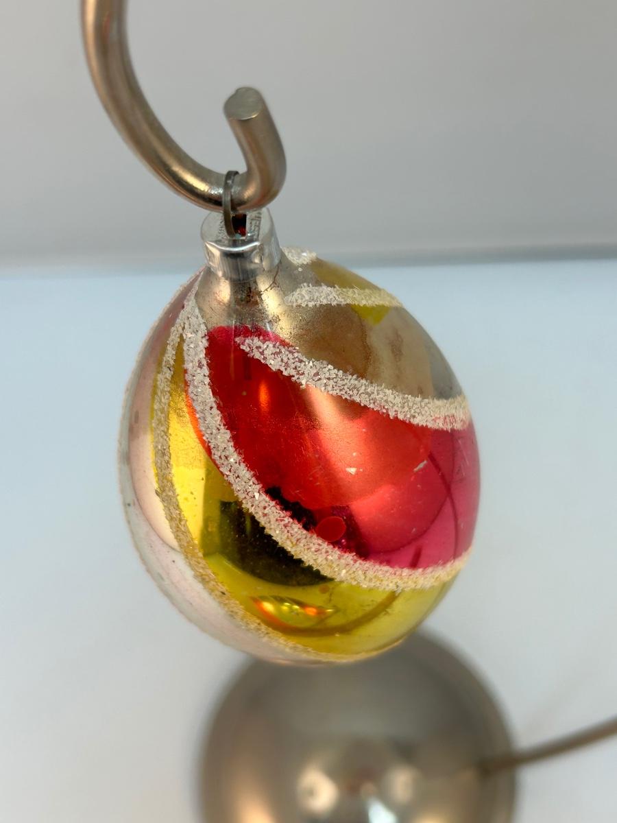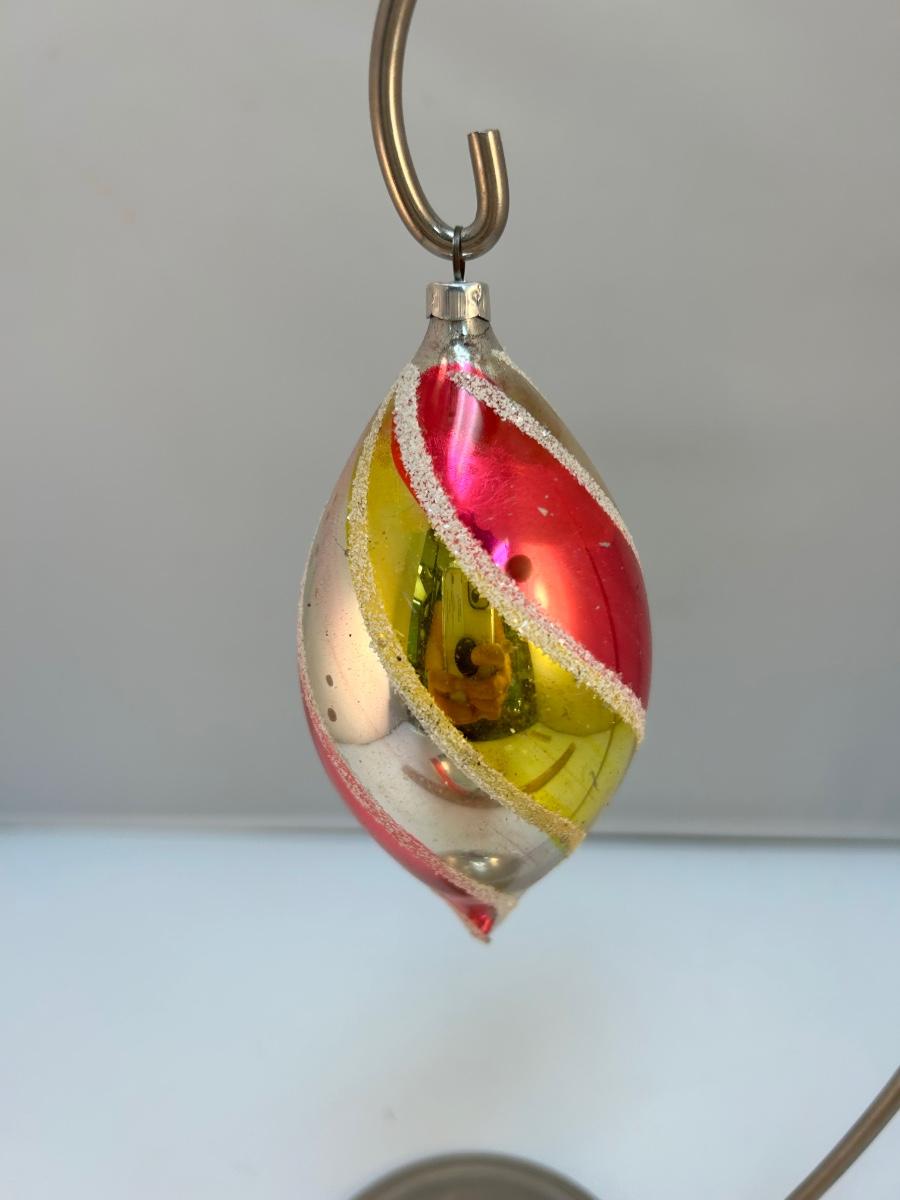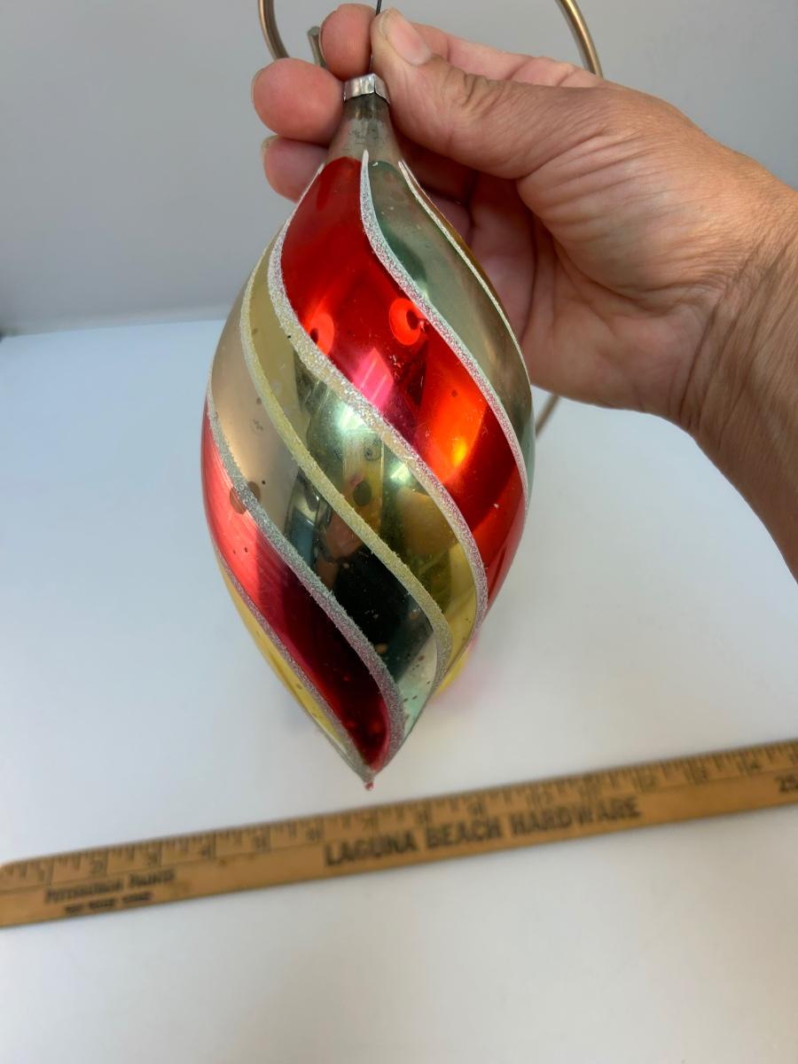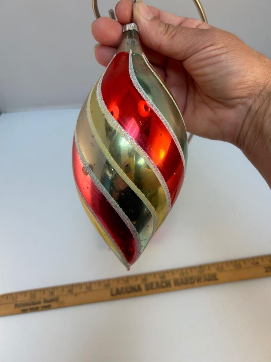 Pair of Spiral Striped Blown Glass Football Shaped Christmas Tree Holiday Ornaments. Some fade from age, look like they were red, yellow, green but the green has faded away. No cracks. Made in West Germany. 7" and 5" size. Stand not included.