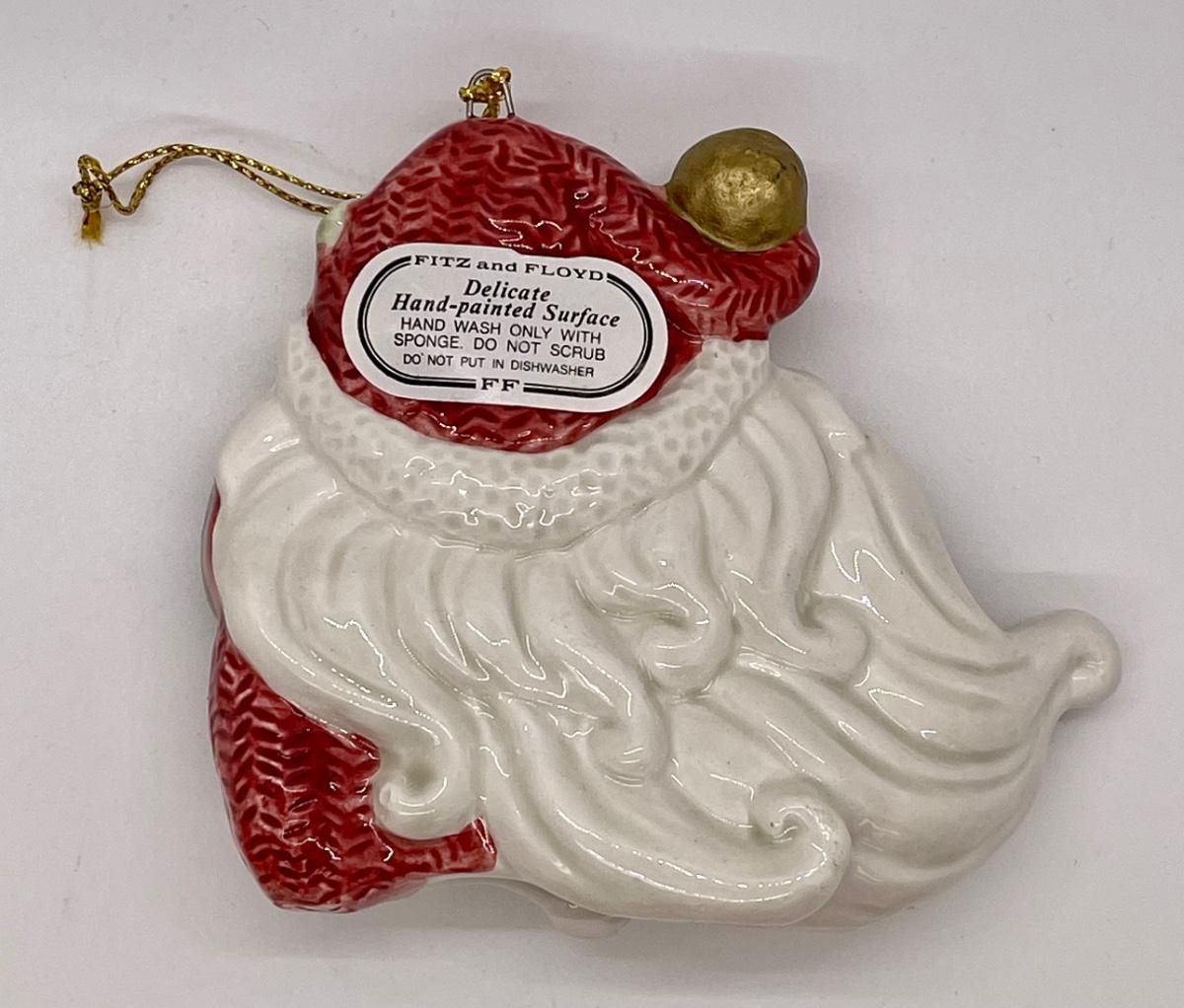 Vintage Fitz and Floyd Santa Claus Ceramic Christmas Holiday Tree Ornament. In good condition. Sticker still attached on the back. About 4" size.