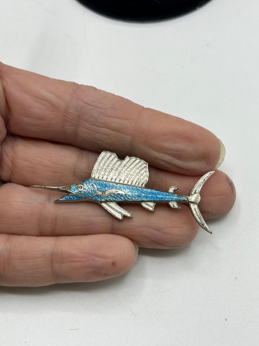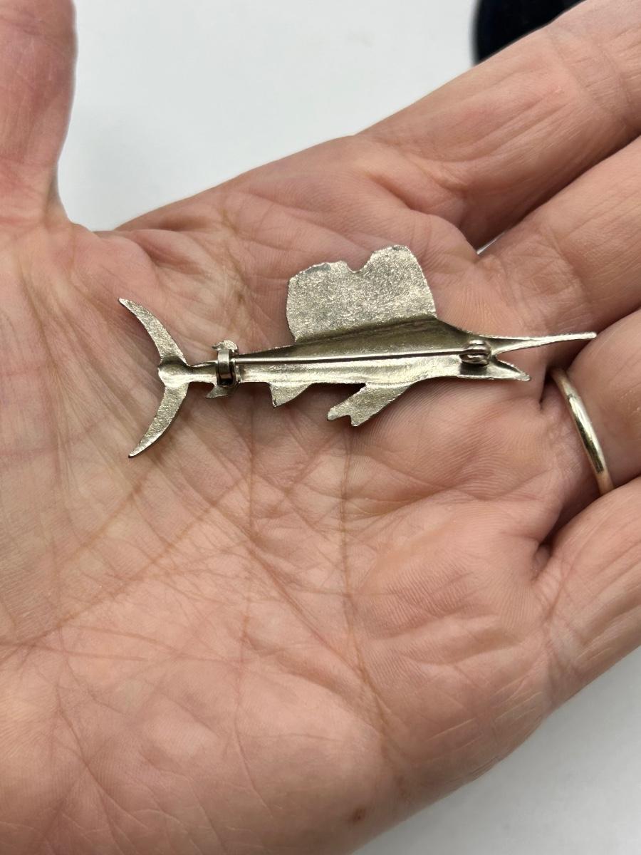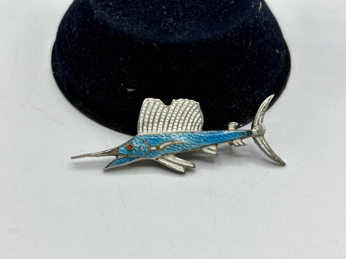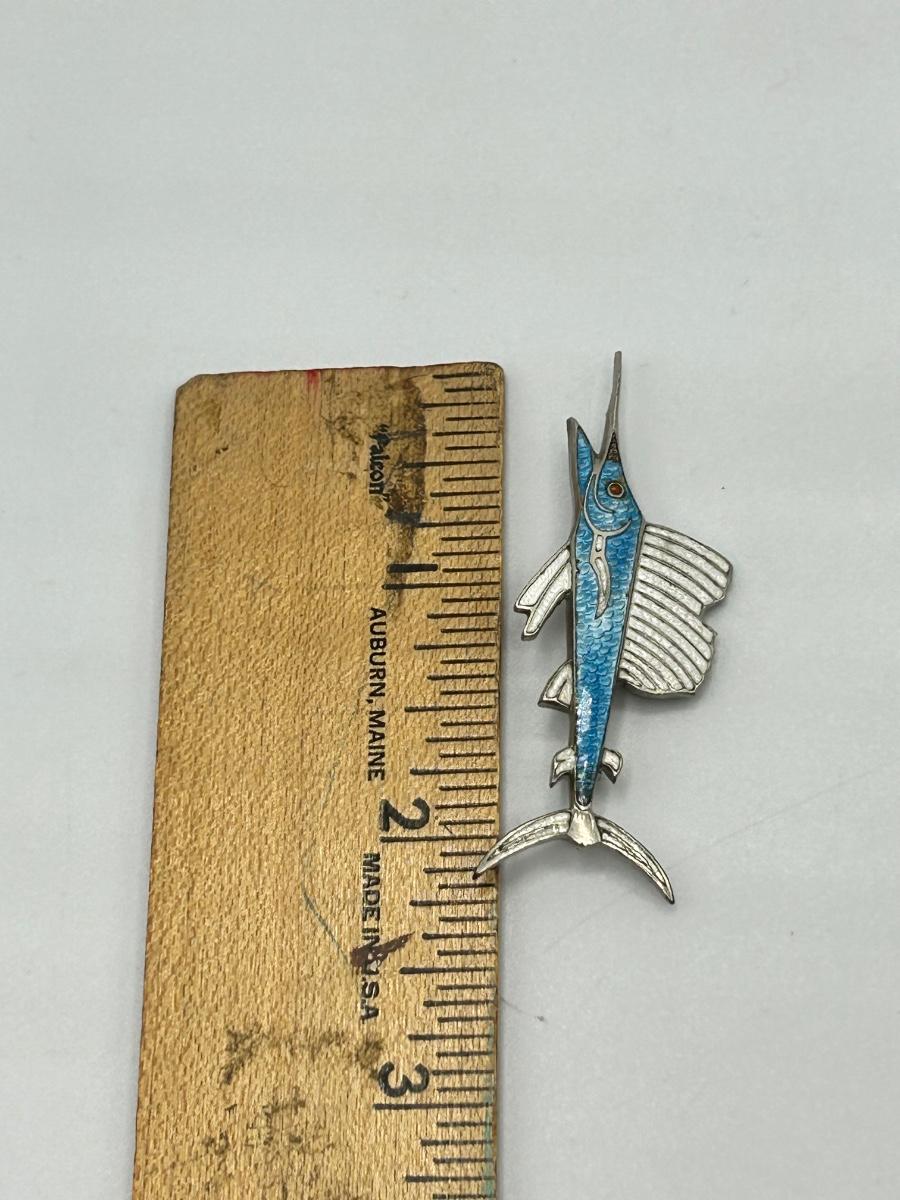 Vintage Retro Silver Tone Setting Enamel Sail Fish Marlin Lapel Pin. In good condition. Unbranded. Just over 2" size.