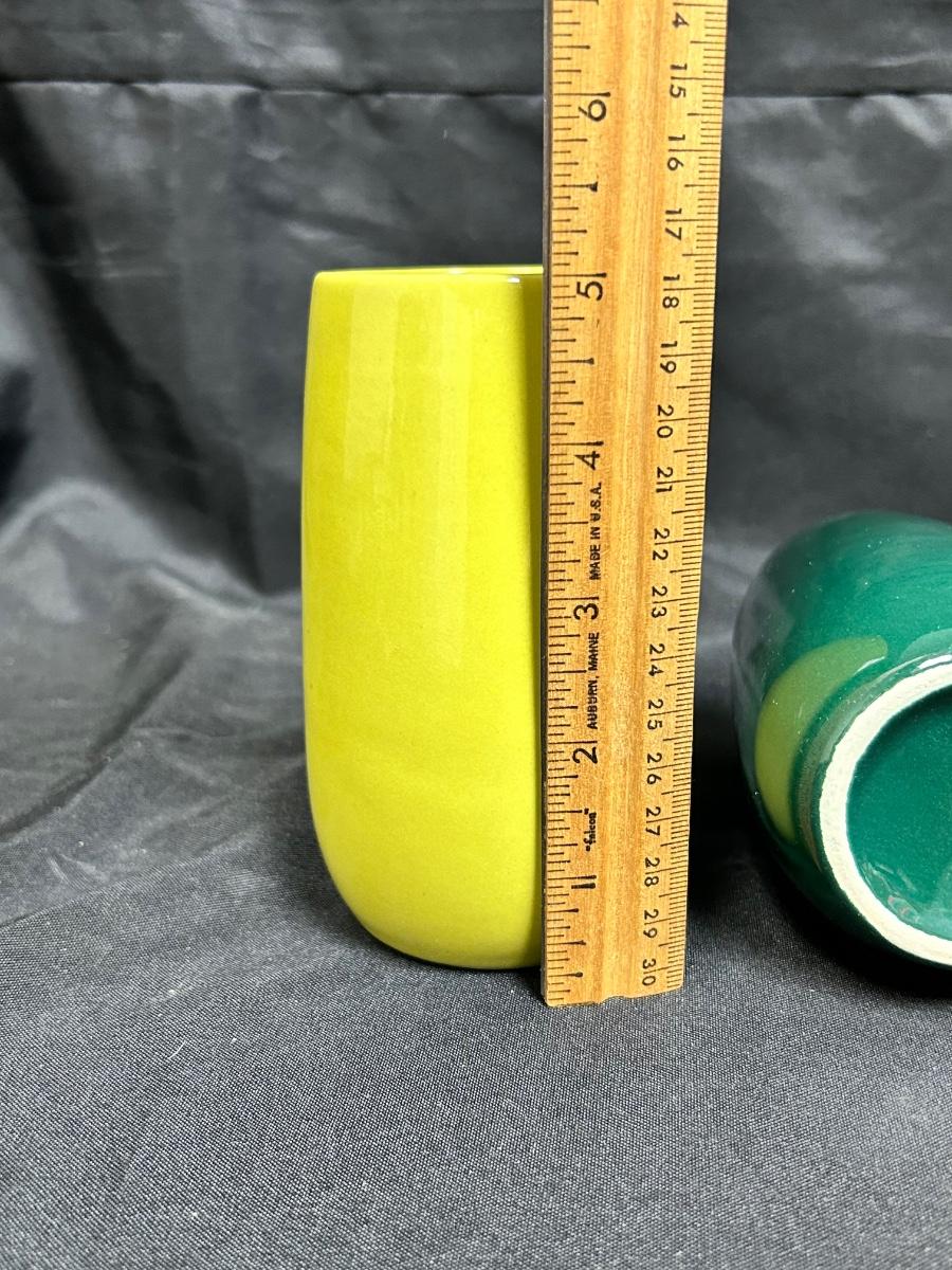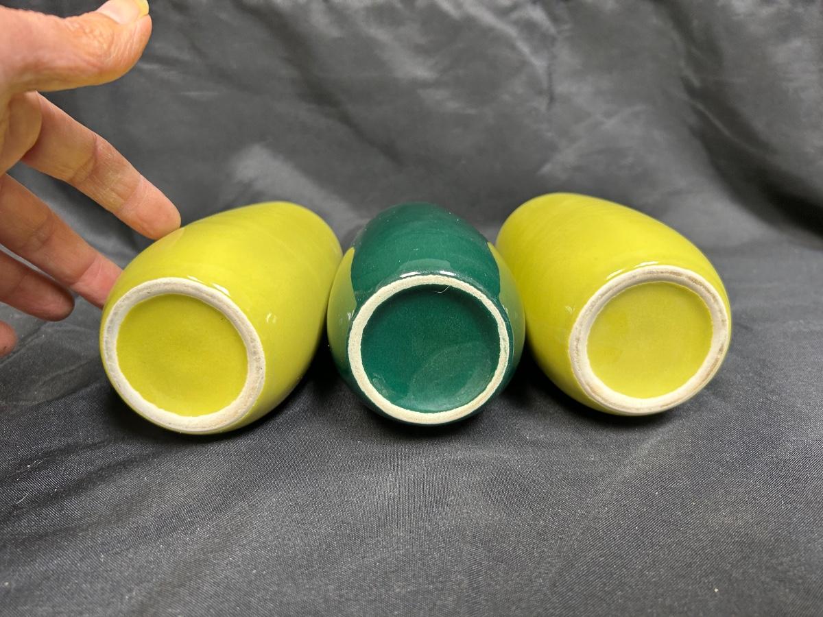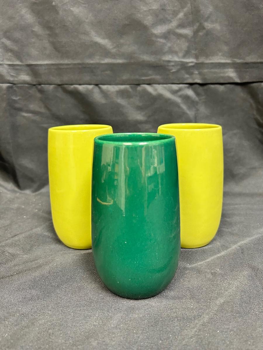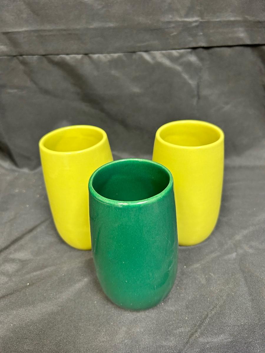 Set of Three Pottery Vase Tumblers Green & Chartreuse Yellow Unbranded. In good condition, no chips. About 5" size.