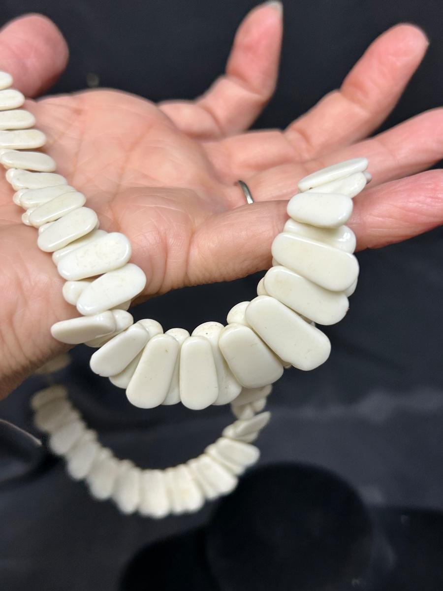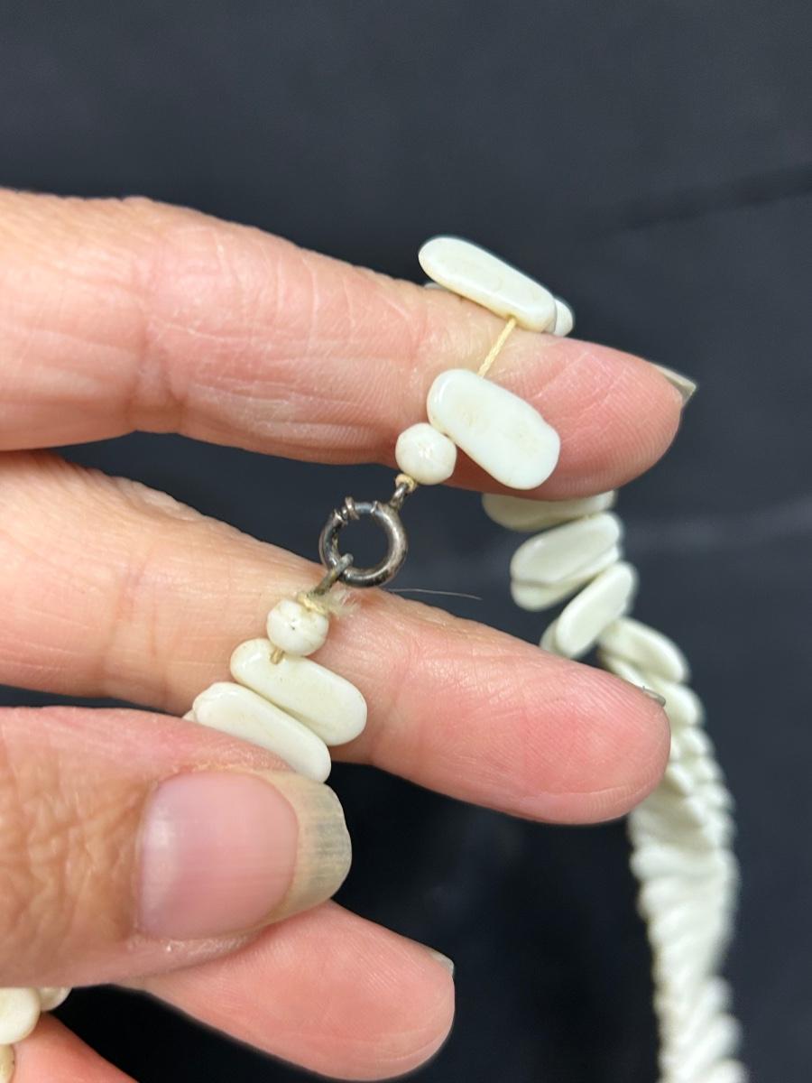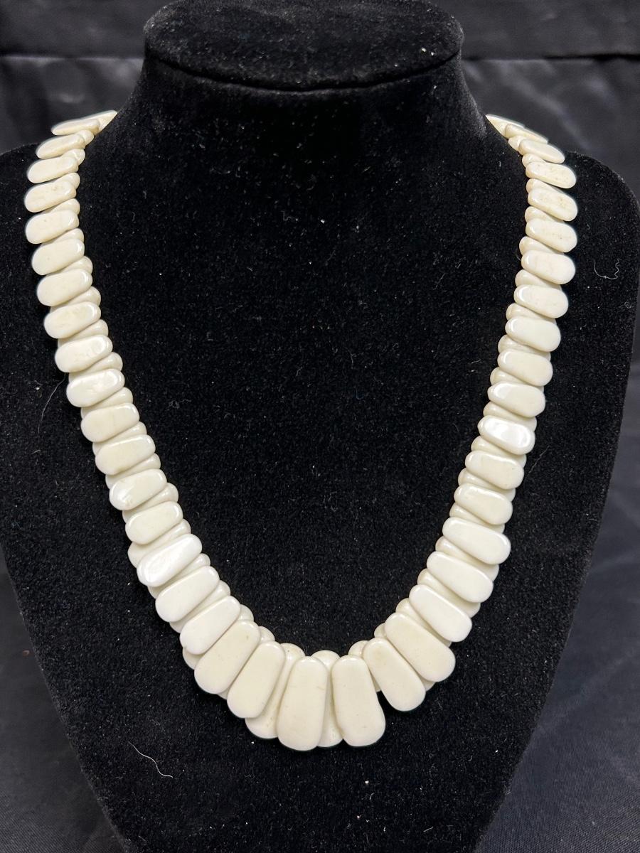 Vintage Layered Carved Stone Shell Choker Style Necklace. In good condition. There is one broken piece, but it is hidden when wearing. Believe it is shell fragment but feels sort of like stone.