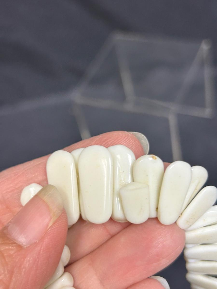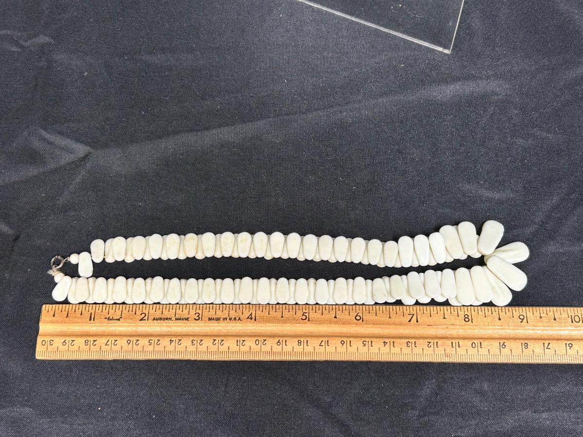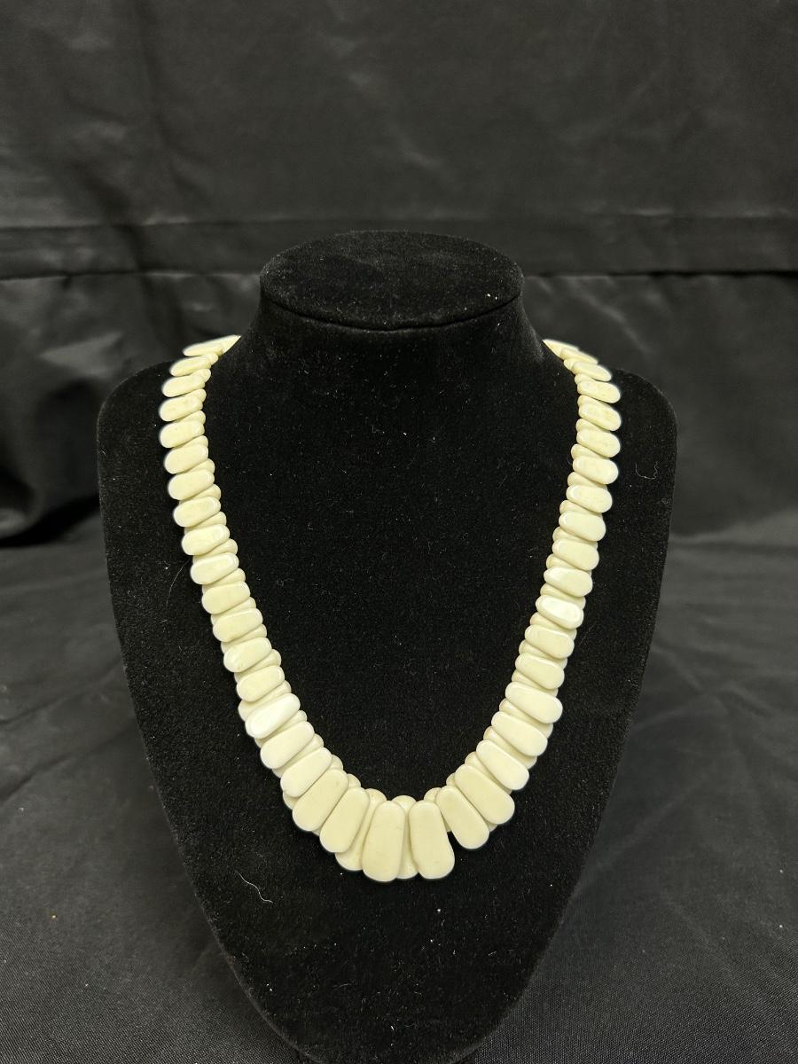 Vintage Layered Carved Stone Shell Choker Style Necklace. In good condition. There is one broken piece, but it is hidden when wearing. Believe it is shell fragment but feels sort of like stone.