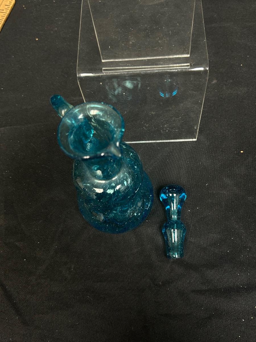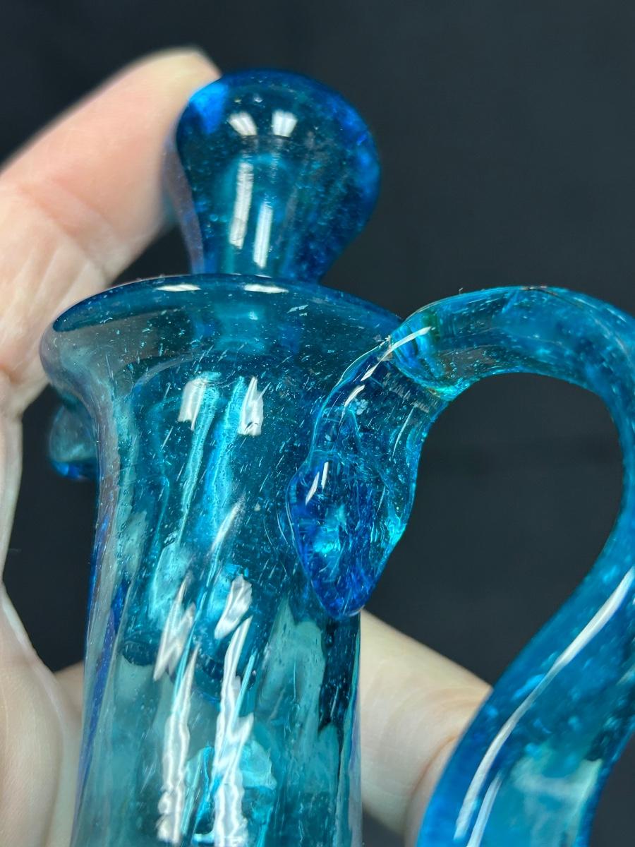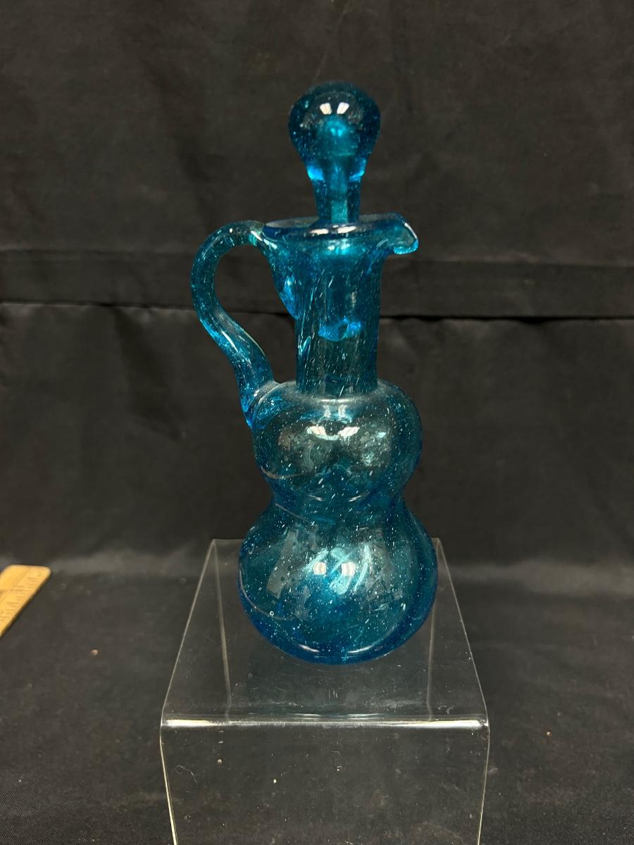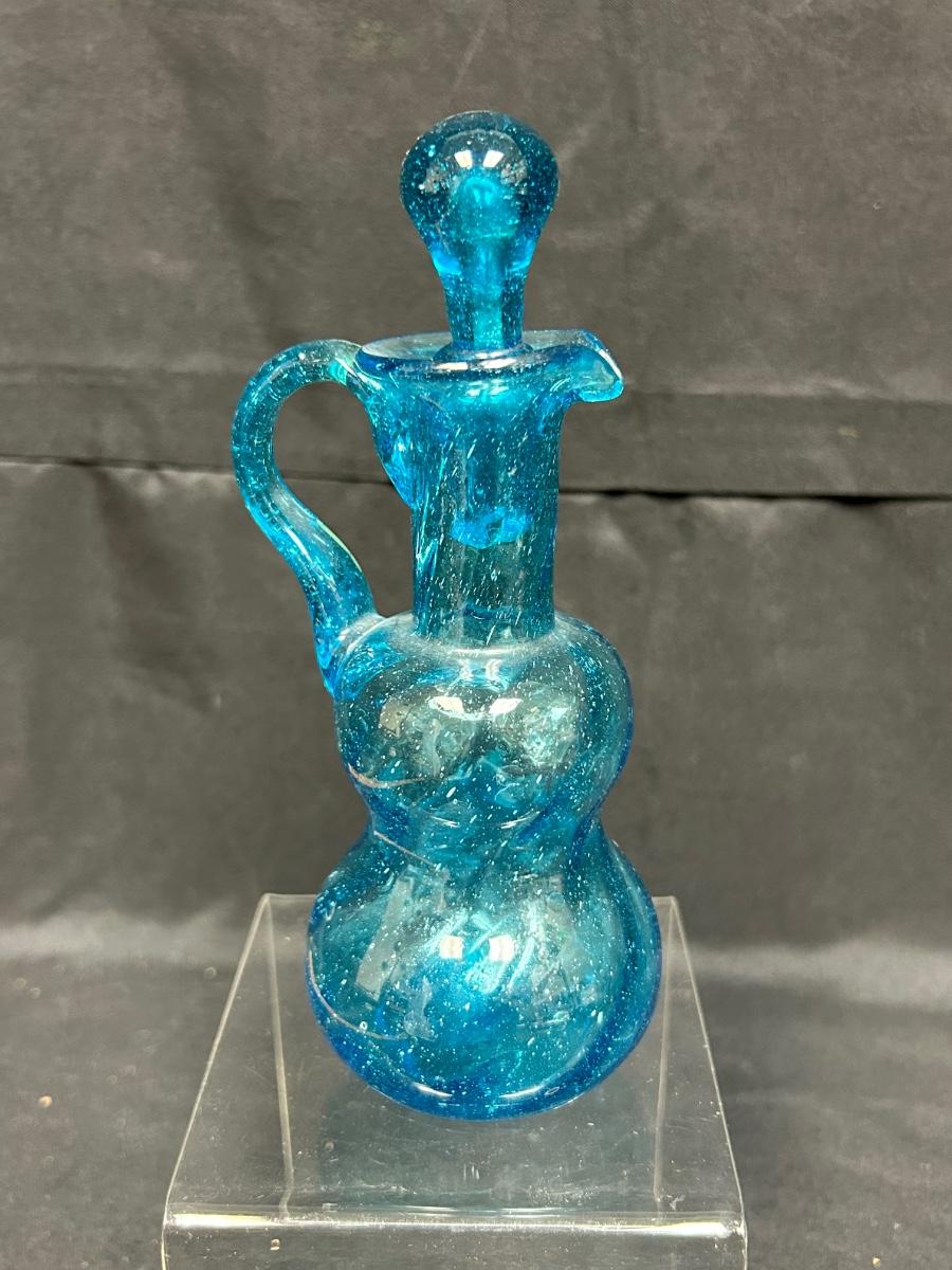 Turquoise Blue Bubble Glass Small Decanter Oil Vinegar Cruet Bottle. In good condition. Great color displays nice. About 7" size. Where the handle meets bottle at the top it looks like it has been repaired, but only at the top.