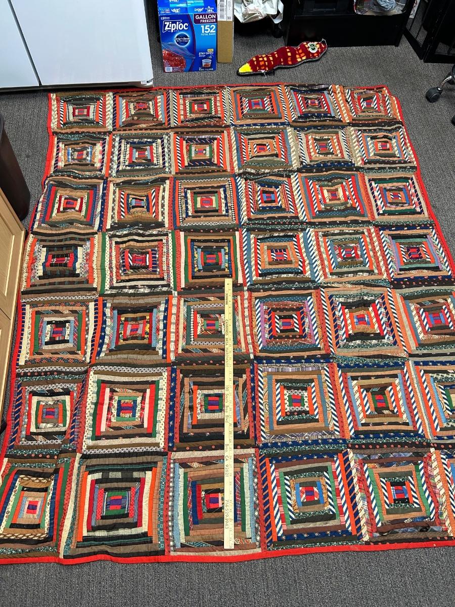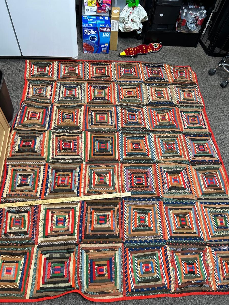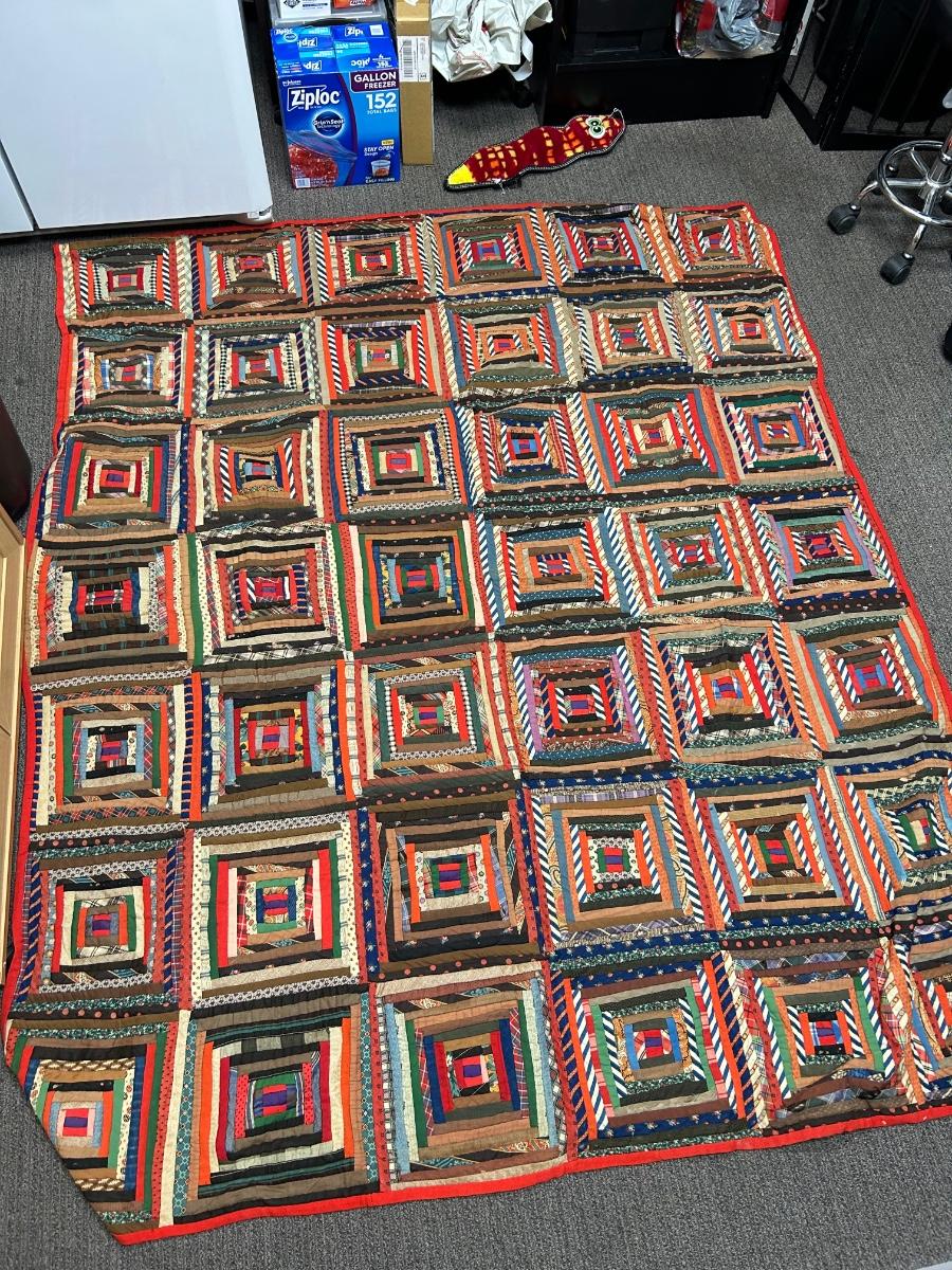 Vintage Hand Made Colorful Strip Squares Quilt Blanket. In vintage condition. There is some discoloration from age but no major spots or stains. No holes. There is some light wear as well. About 66"x77", squares are about 11" size.