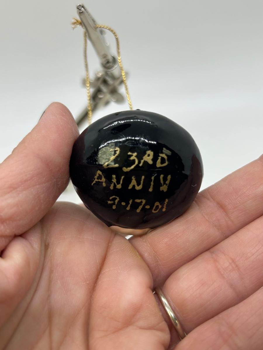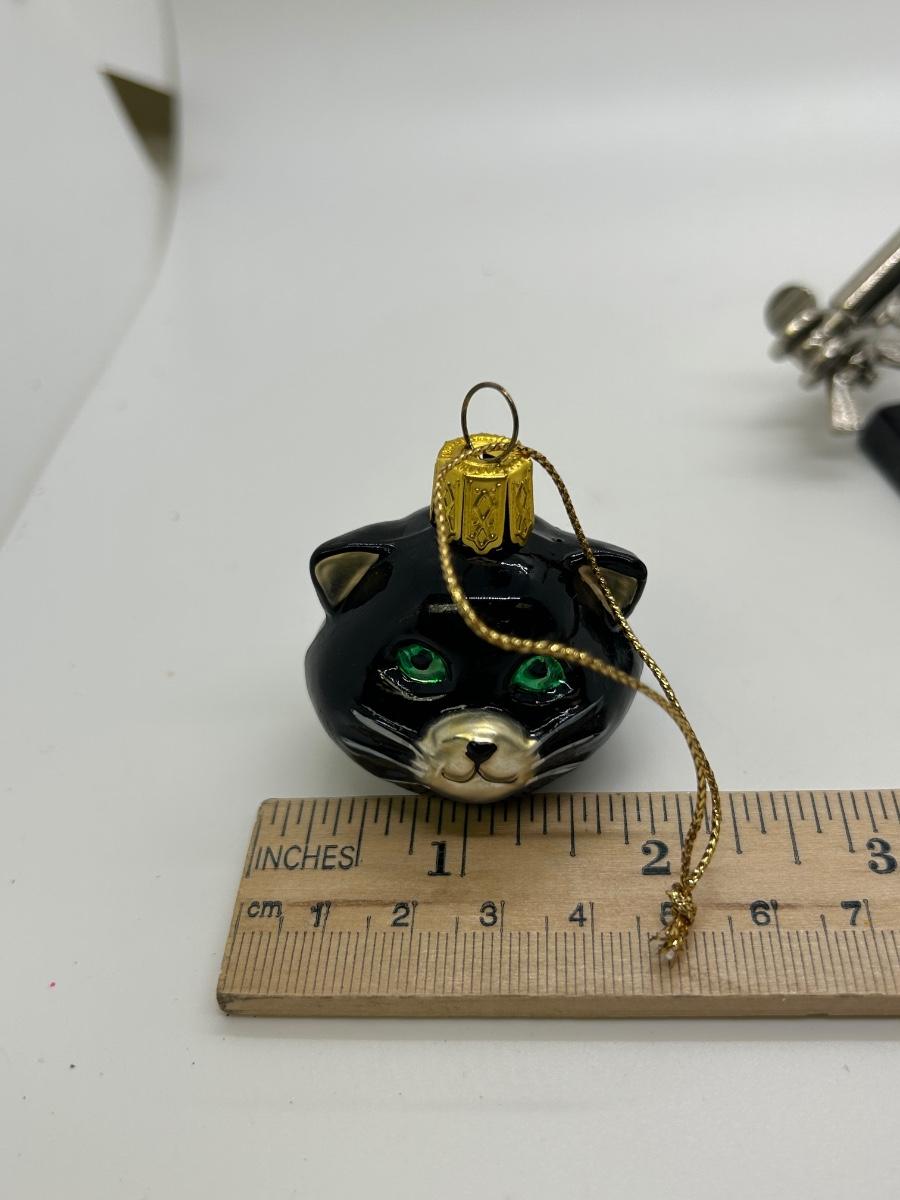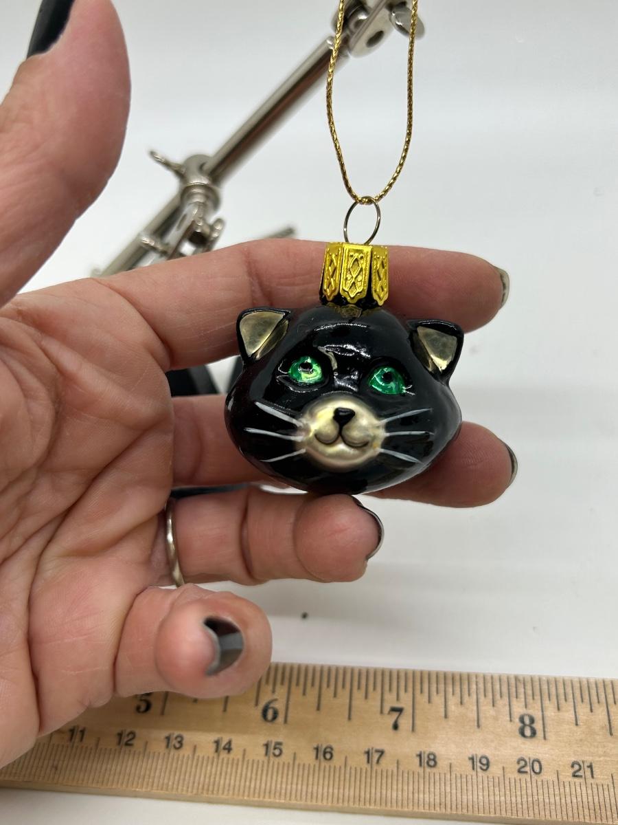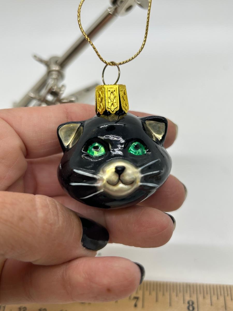 Black Cat with Green Eyes Hanging Christmas Holiday Ornament Personalized. In good condition. Under 2" size. Was given as a 23rd anniversary keepsake in 2001. Displays good.