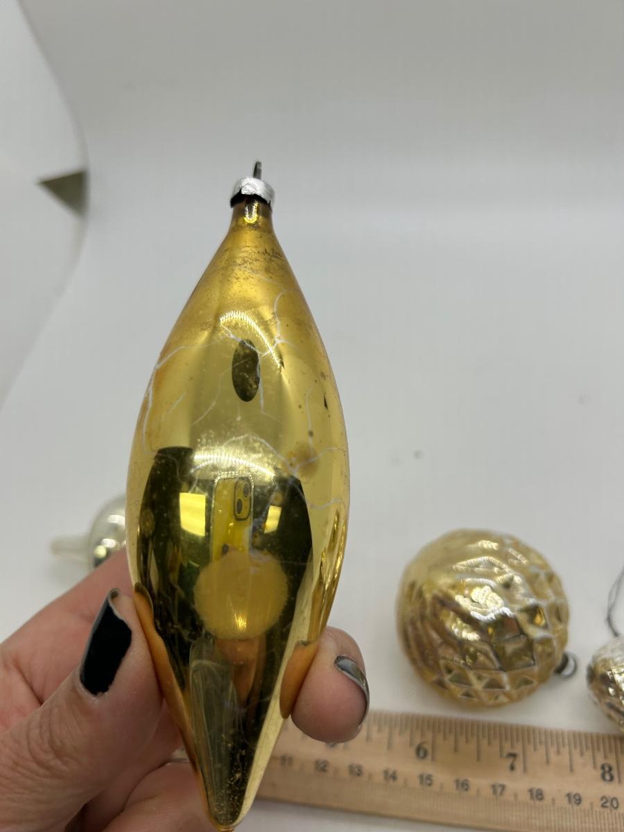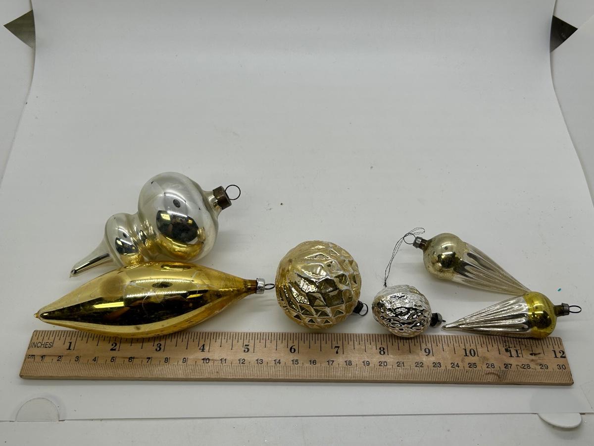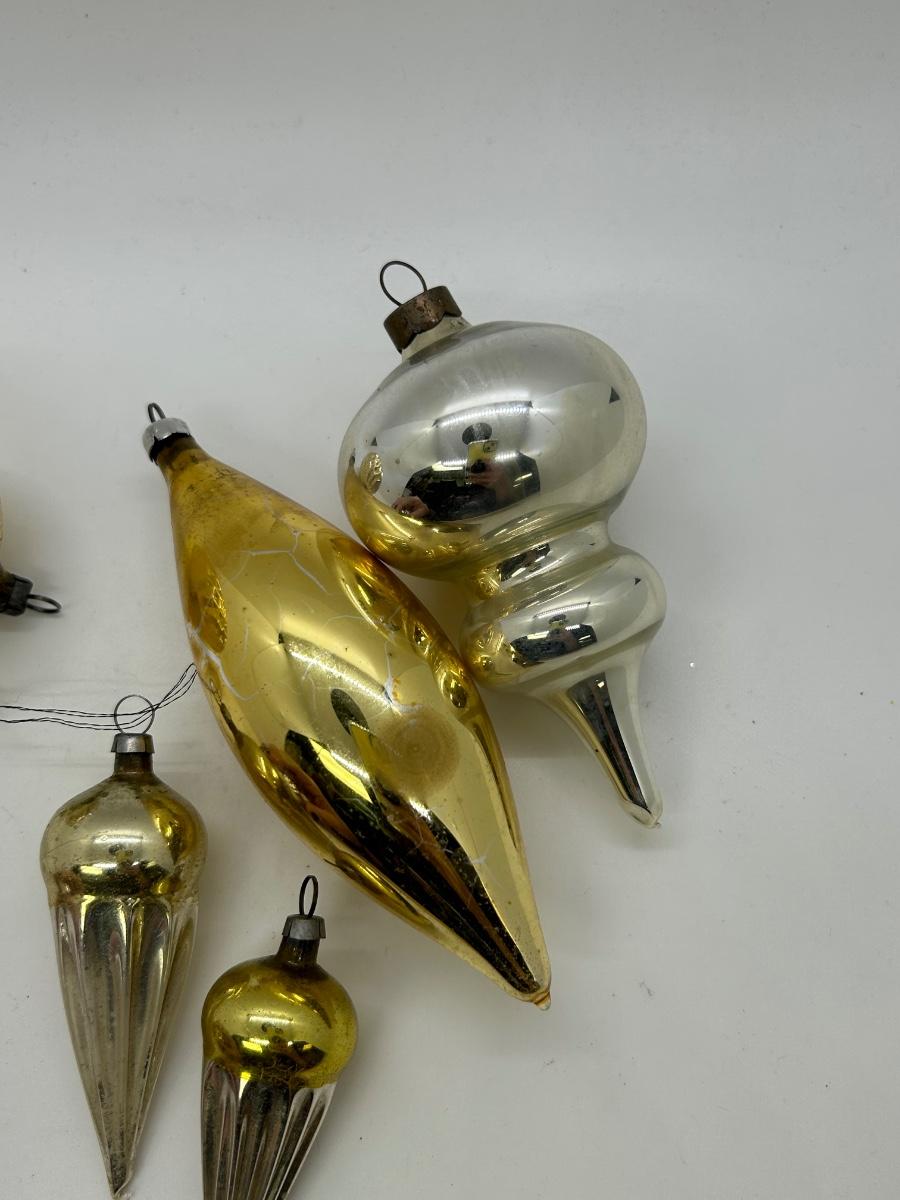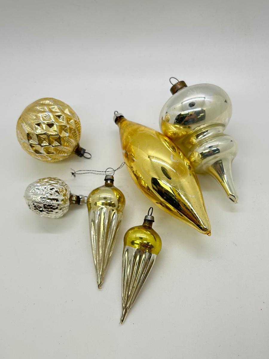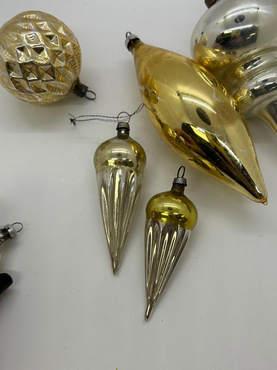 Vintage Silver and Gold Blown Glass Christmas Holiday Tree Ornaments. Neat shapes. In good vintage condition. No broken ornaments but may have light wear from age and use.
