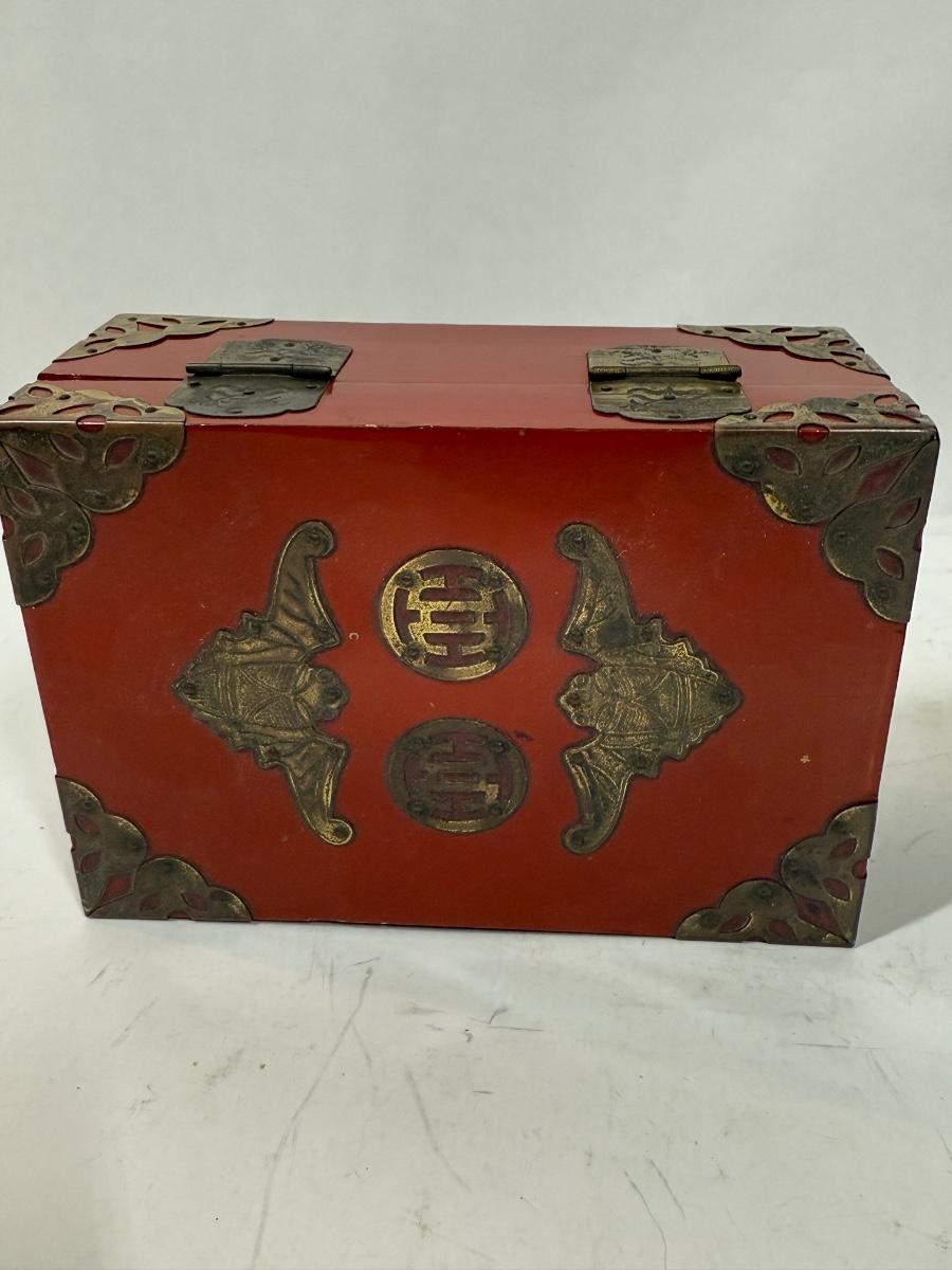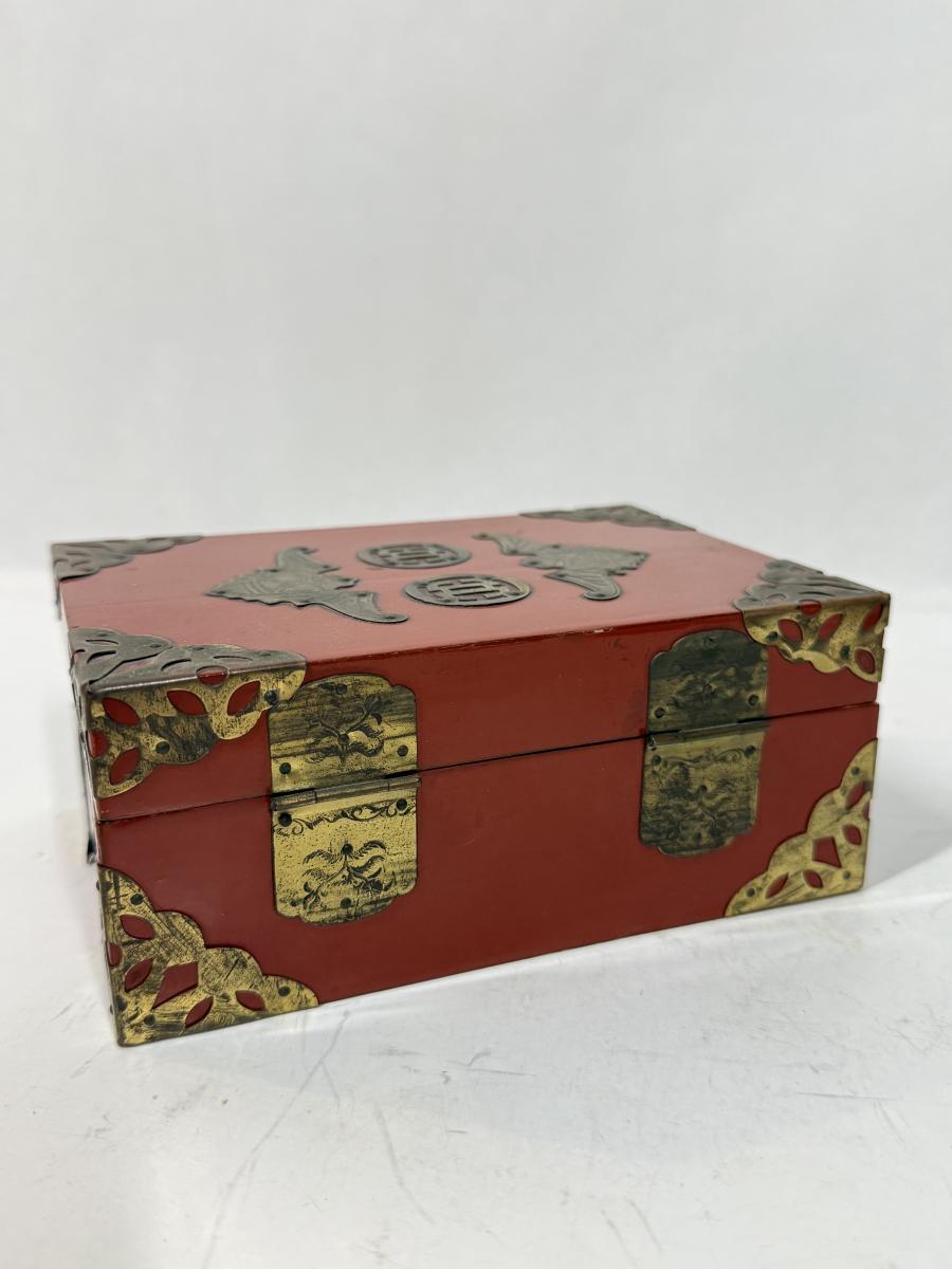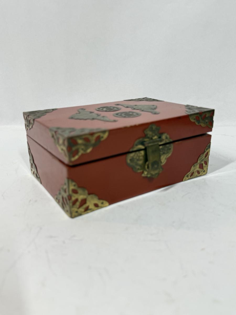 Vintage Chinese Jewelry Box Red Lacquer & Brass Trinket Holder