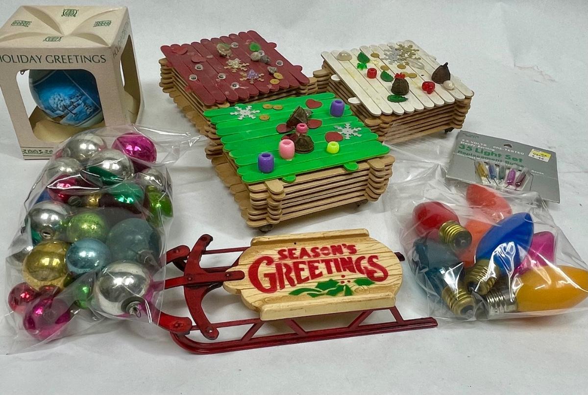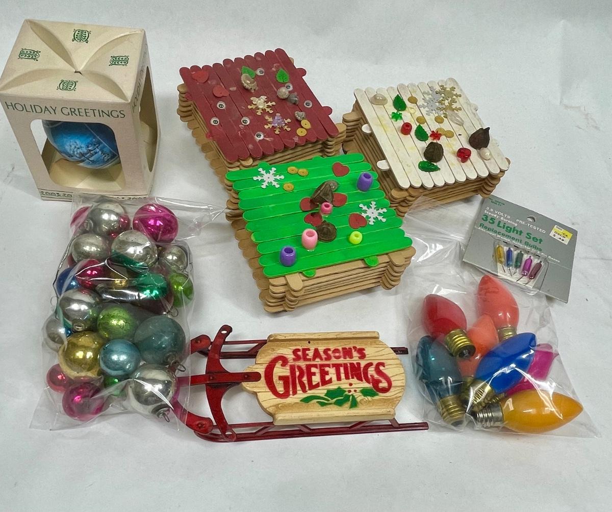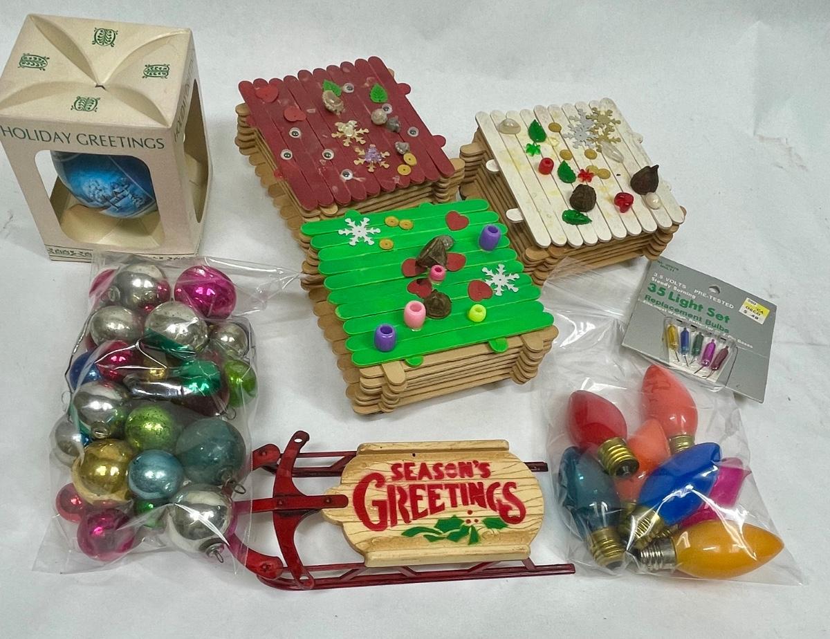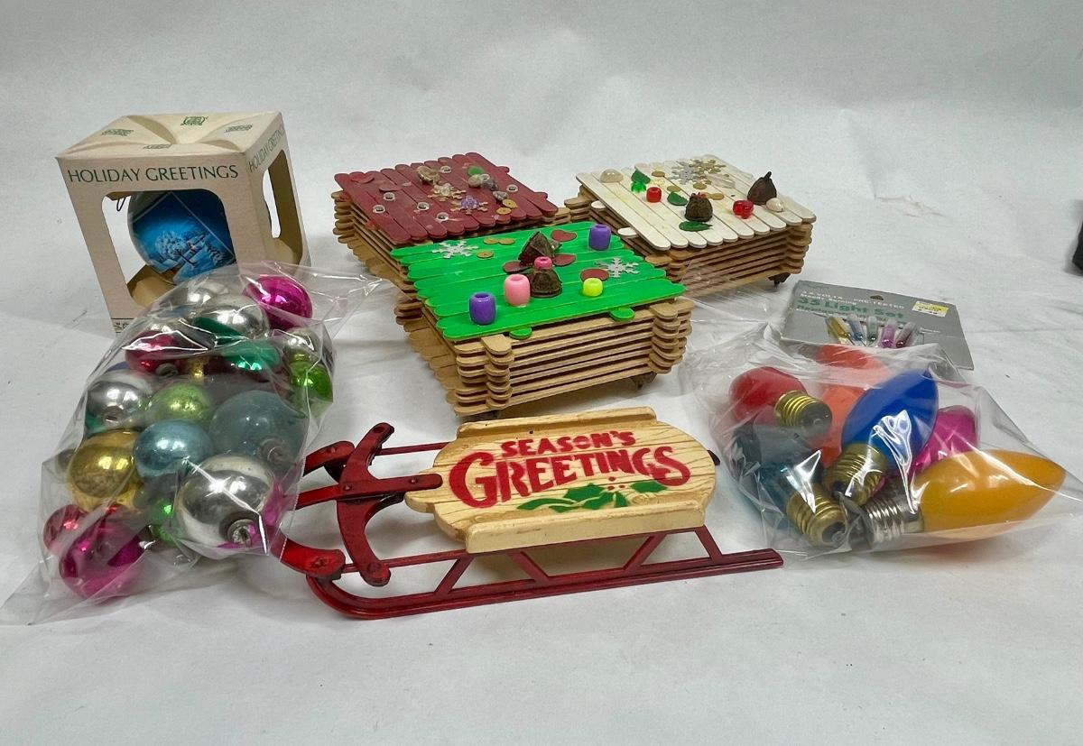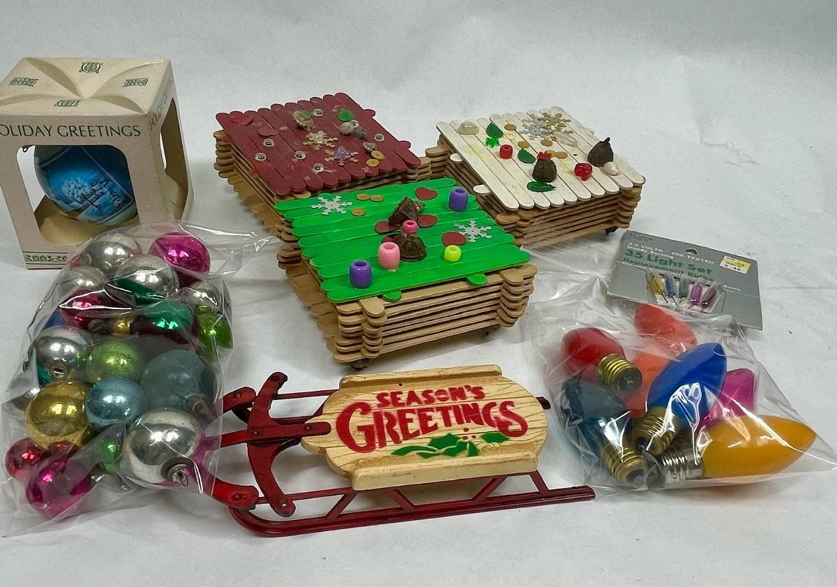 Vintage Christmas Hodgepodge Lot - handmade trinket boxes, miniature sled, miniature ornaments and old light bulbs