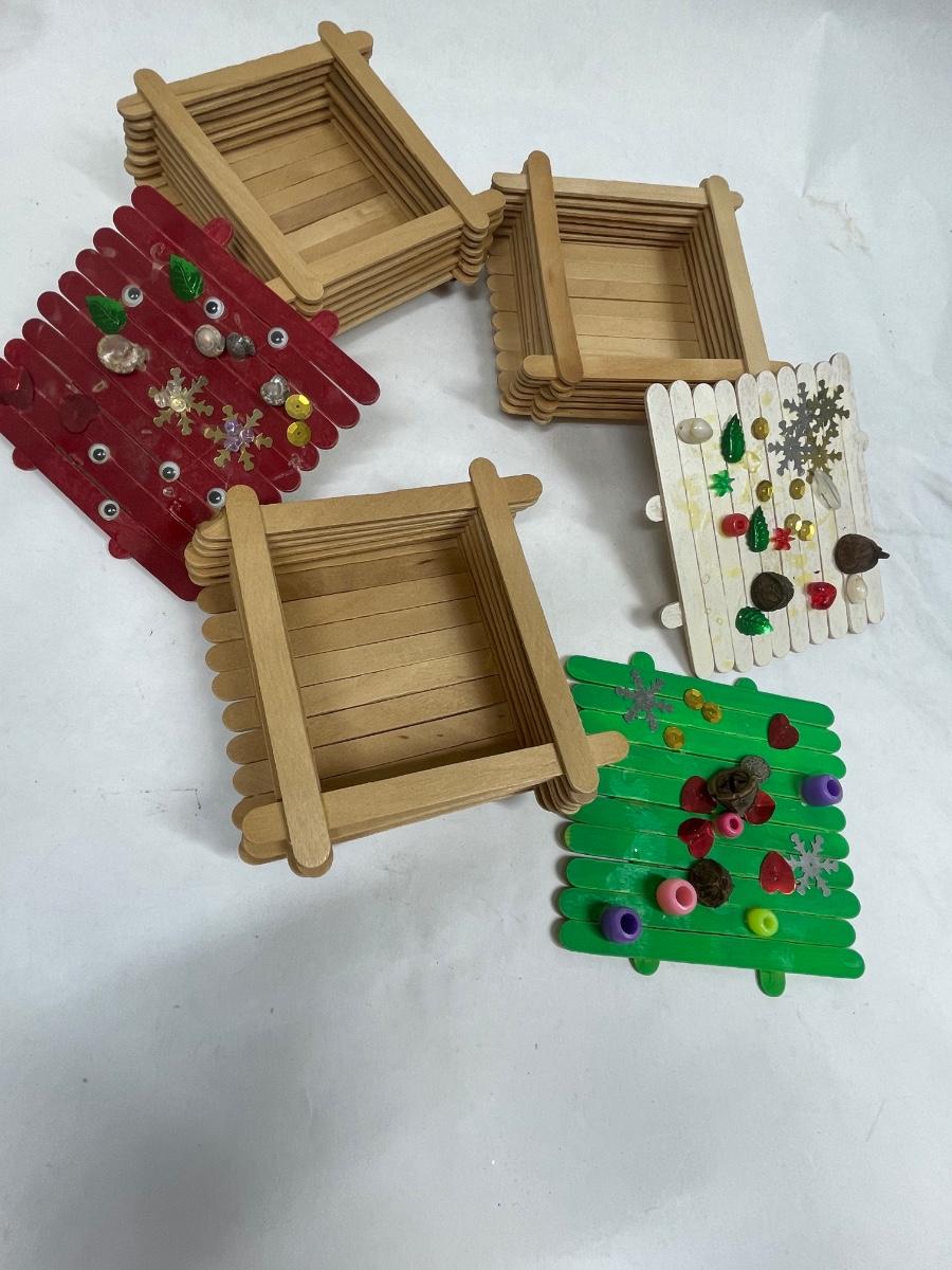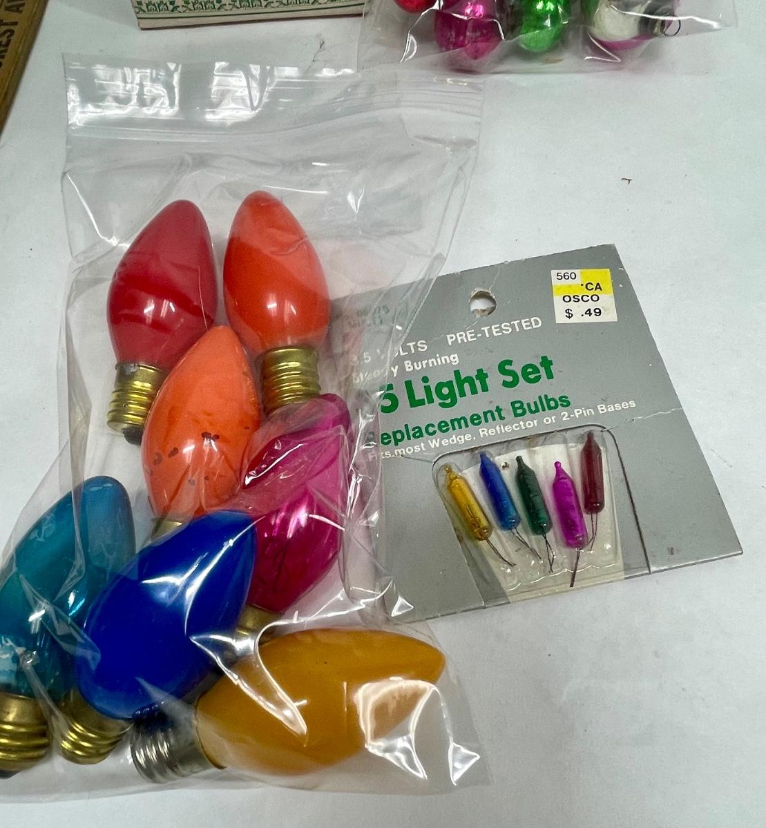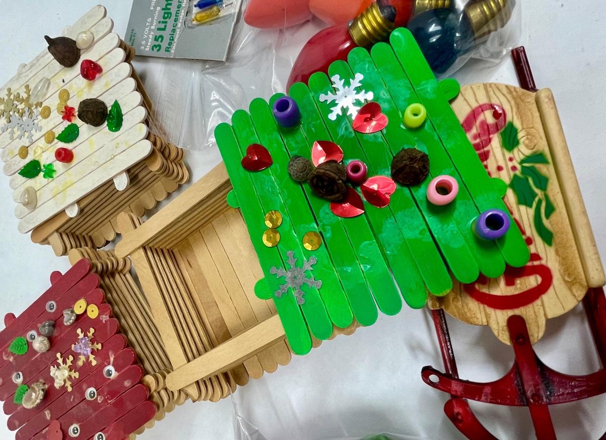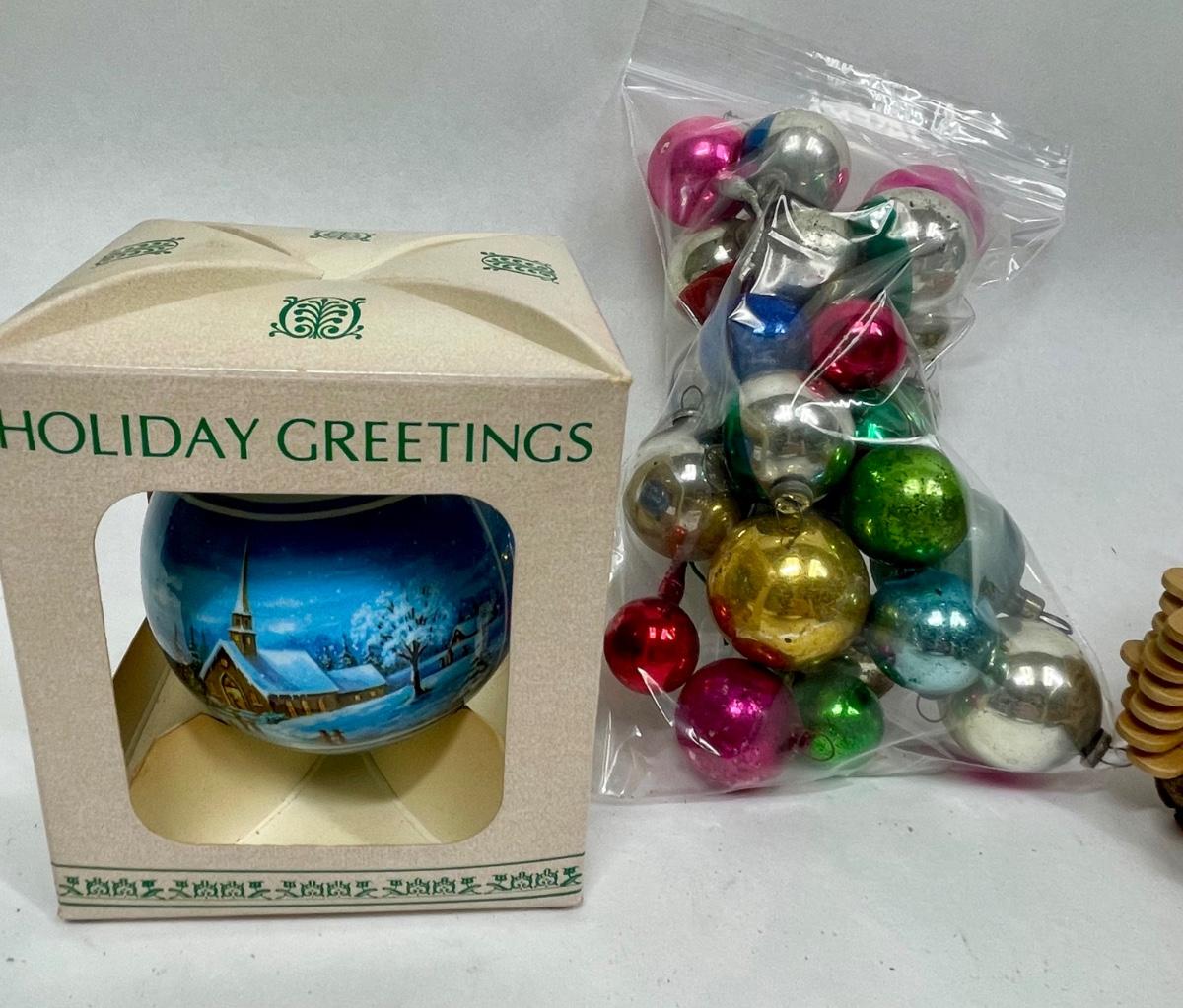 Vintage Christmas Hodgepodge Lot - handmade trinket boxes, miniature sled, miniature ornaments and old light bulbs