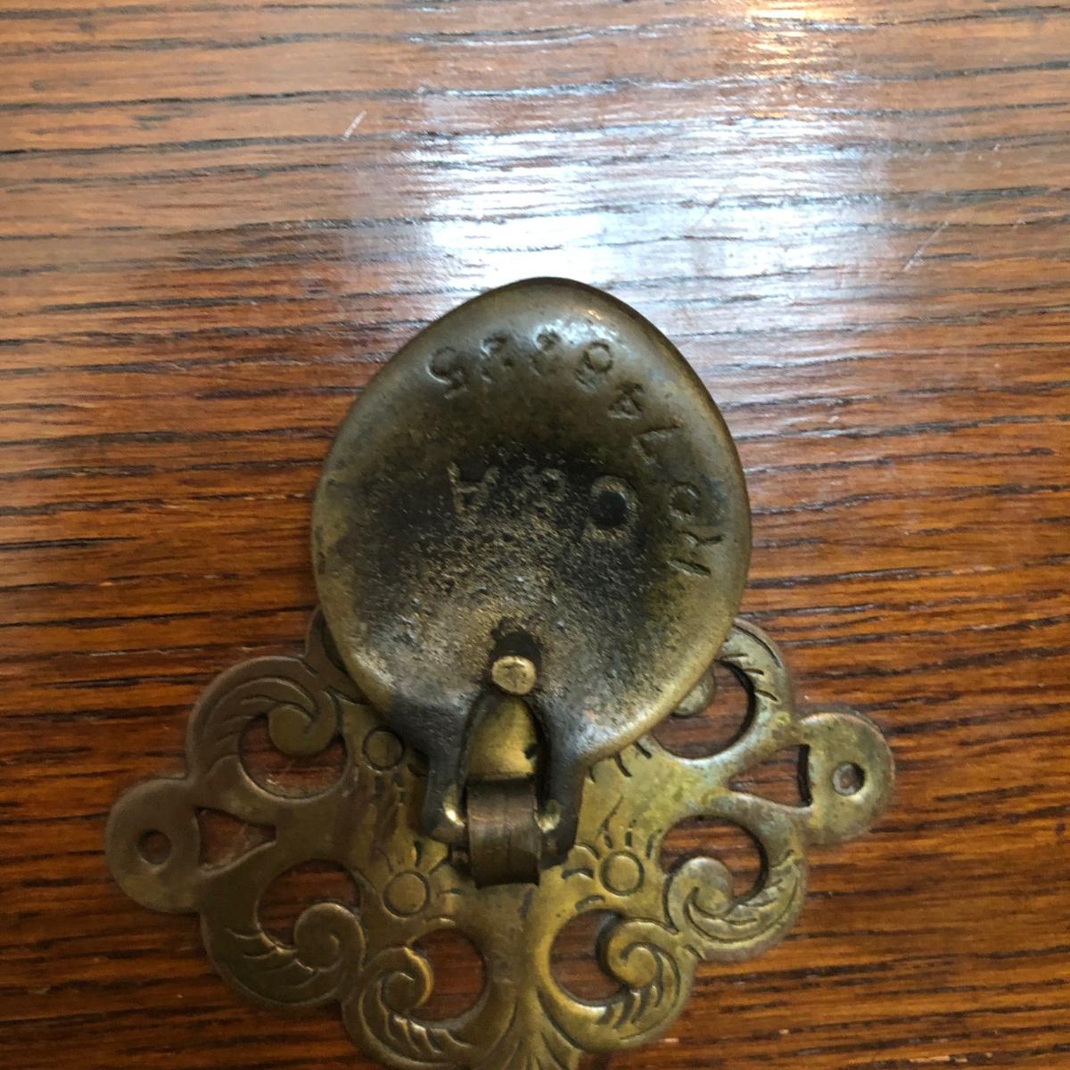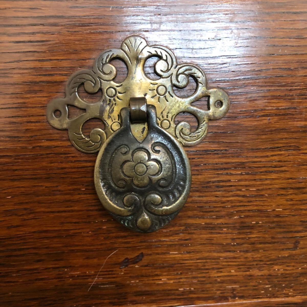This antique solid wood dresser has 3 drawers with gold tone pulls and a protective glass cover on top. Each drawer is dovetailed. The drawer pulls feature a subtle floral pattern with swirls and are stamped on the back as pictured. The dresser measures 35.5" x 32.5" x 17.25". The inside of the top drawer shows signs of possibly being repaired by a professional. Local pickup only.