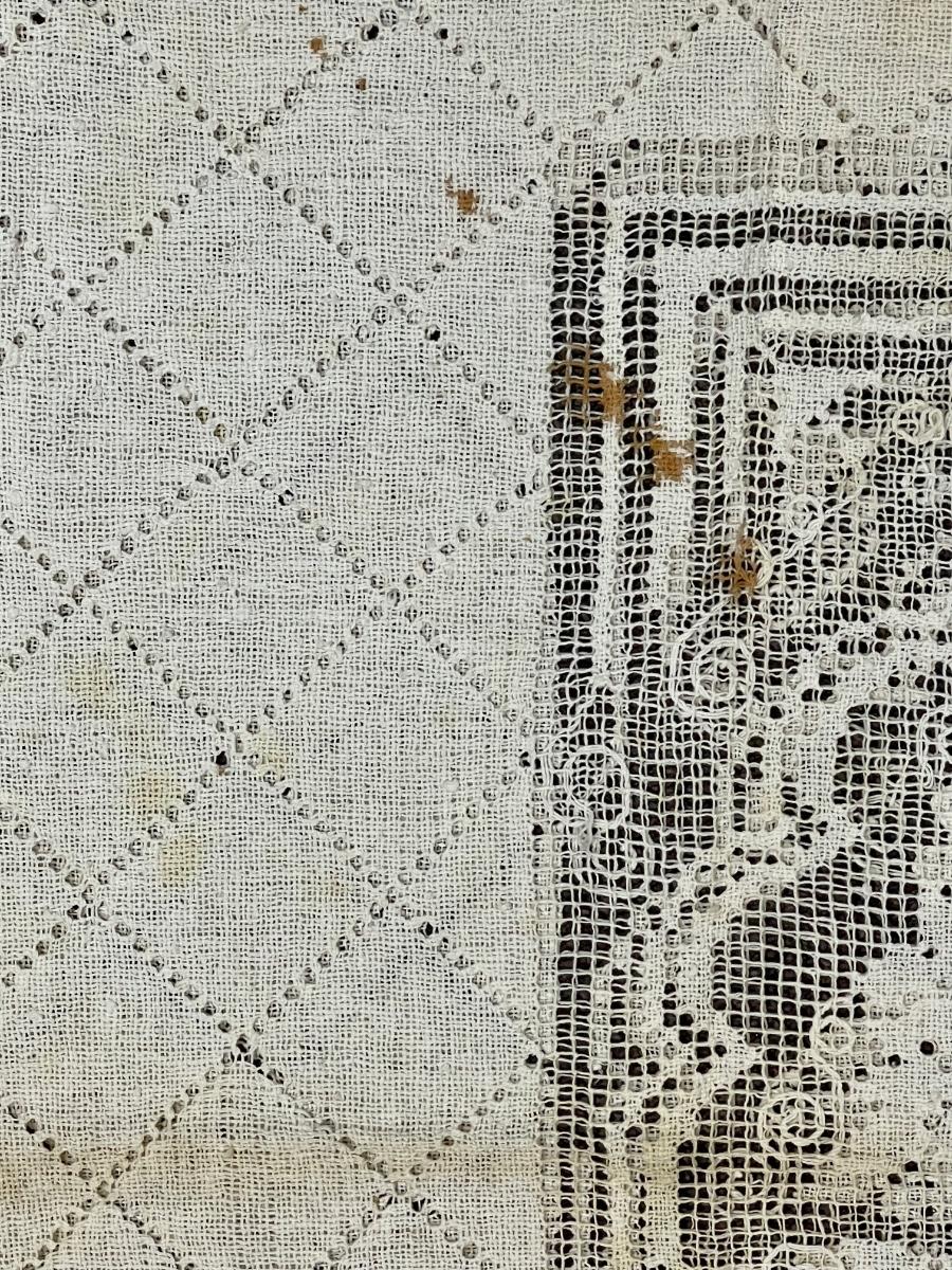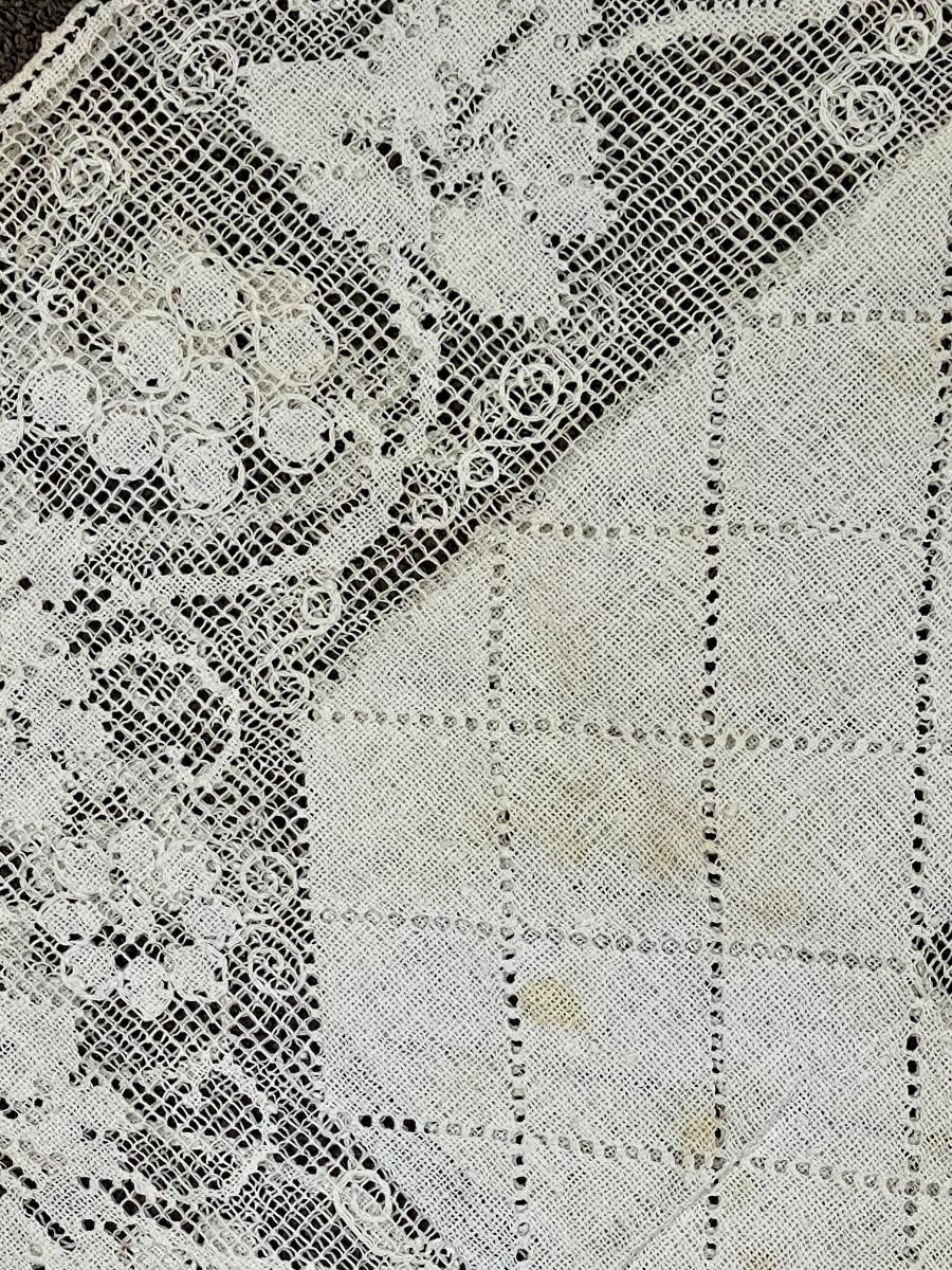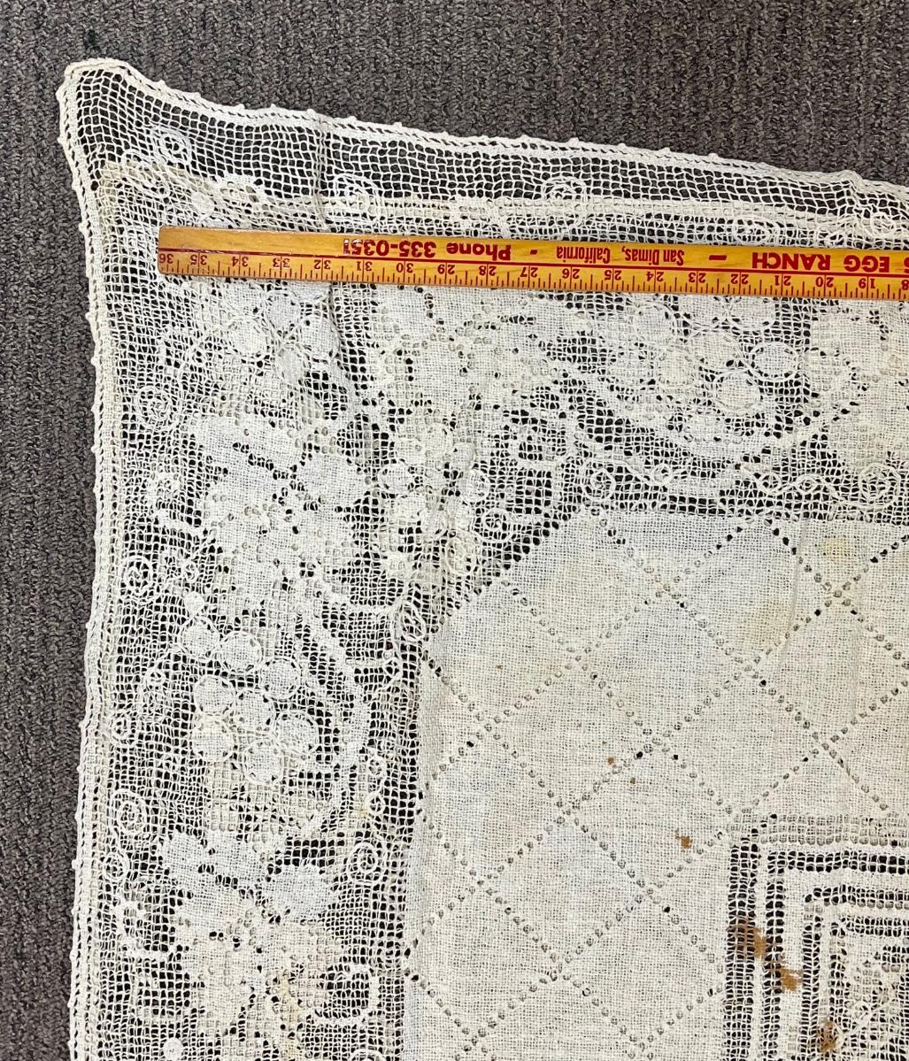 Vintage Lace Grapevine Patterned Lace Tablecloth. Signs of age and use.