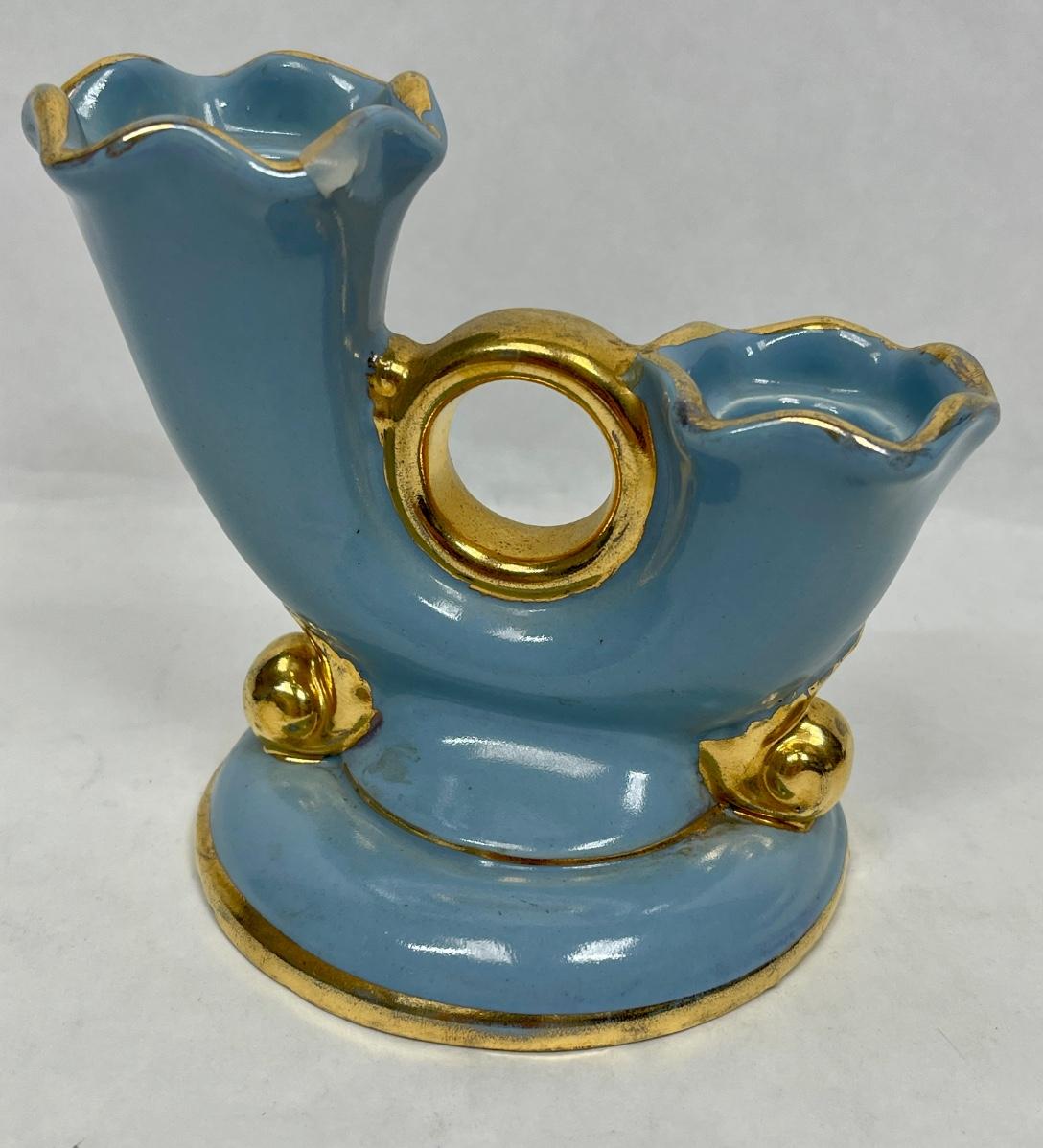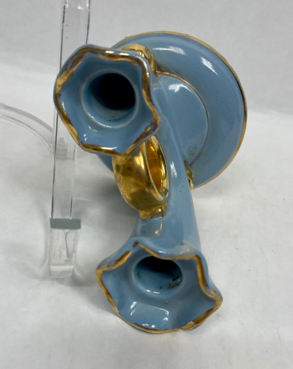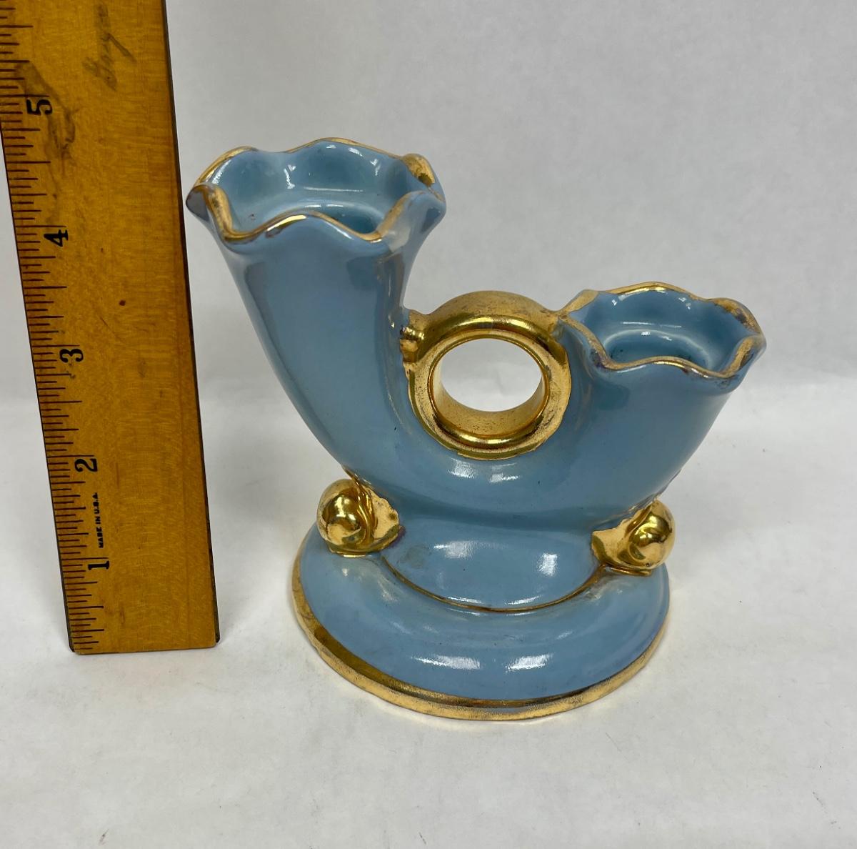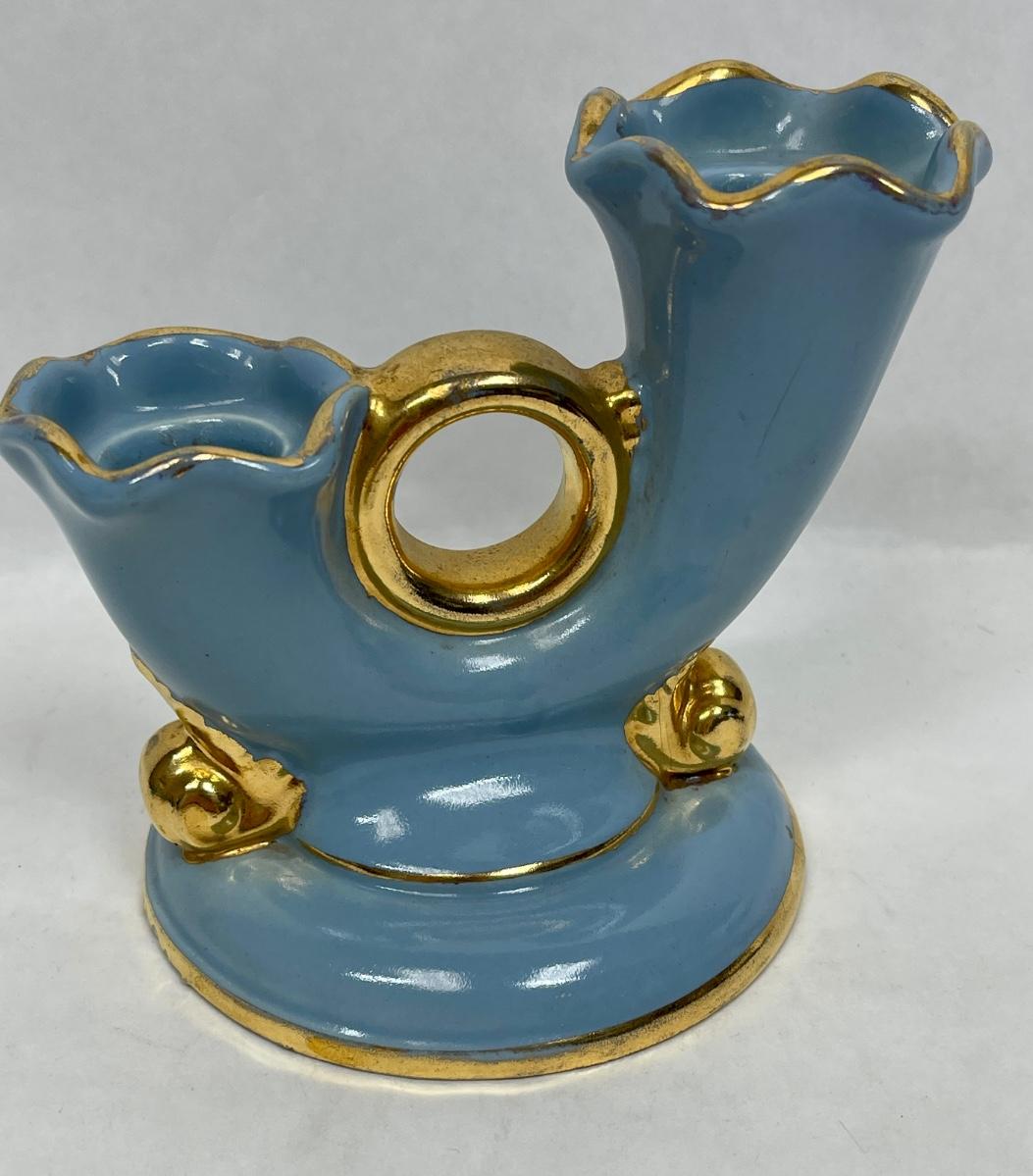 Victorian Candlestick Holder from Abingdon USA Pottery Company. Sky Blue in color with lots of gold trim. The stick holds two taper candles. Measures 4 1/2” x4 1/2”. Good condition.