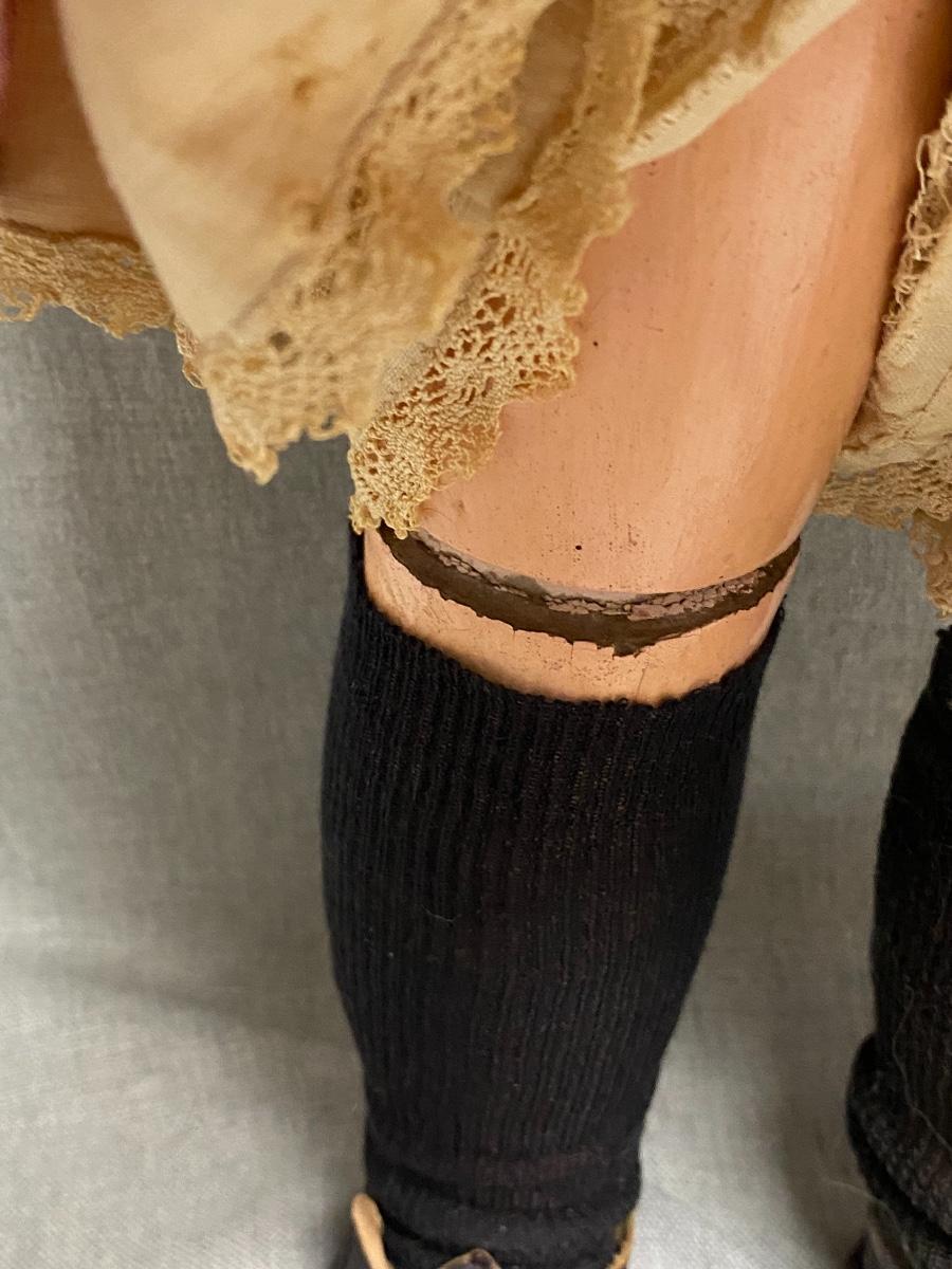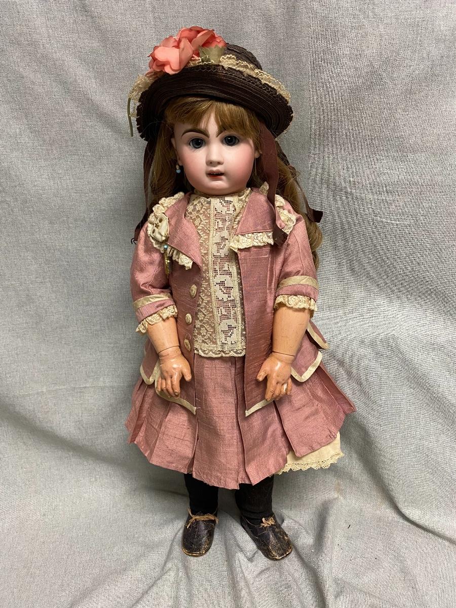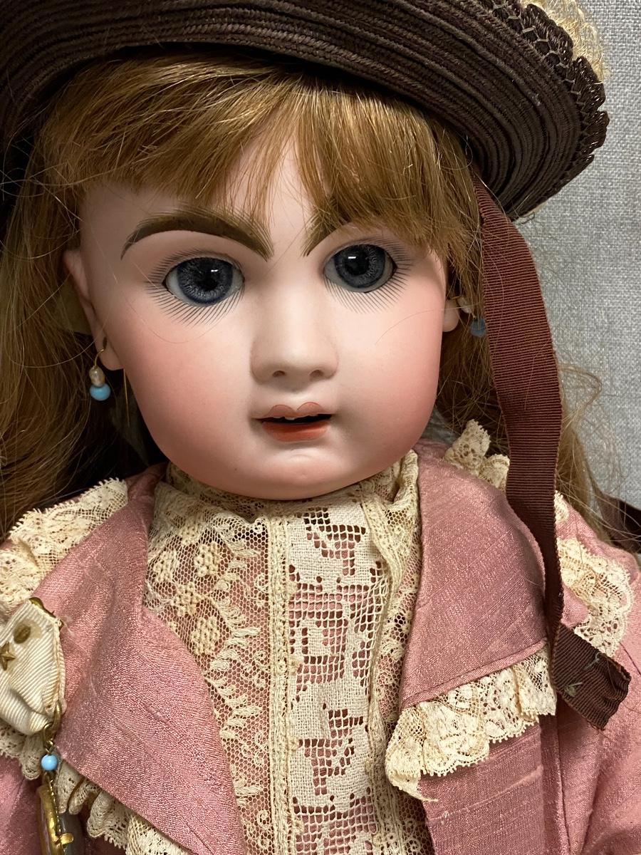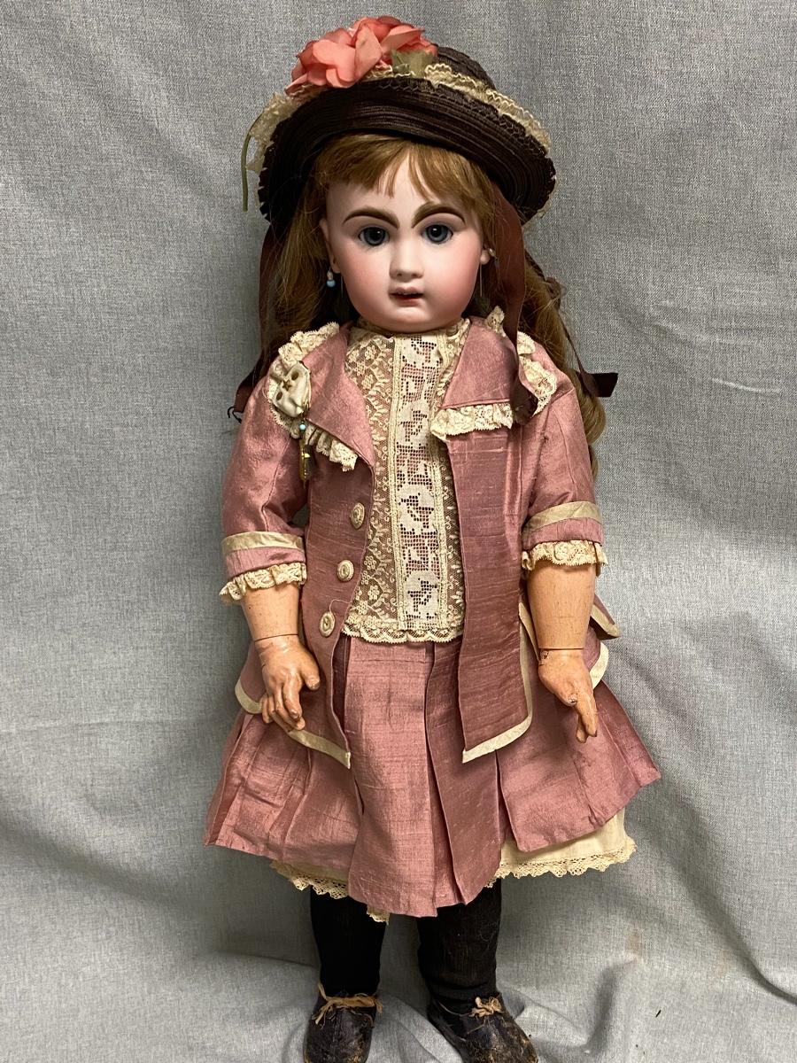 Beautiful bisque & composite Victorian styled doll. Dark hair, blue sleep eyes. About 26" size. Back of head is stamped "Tete Jumeau" in red, no other marks. Her hands have some wear and chips, as does the knee joint edges. Nodamage noted on the head.