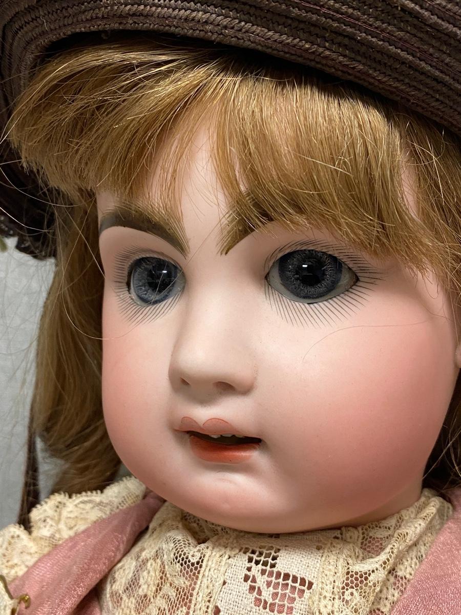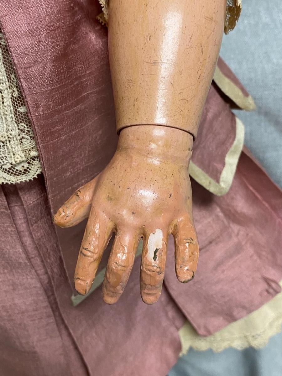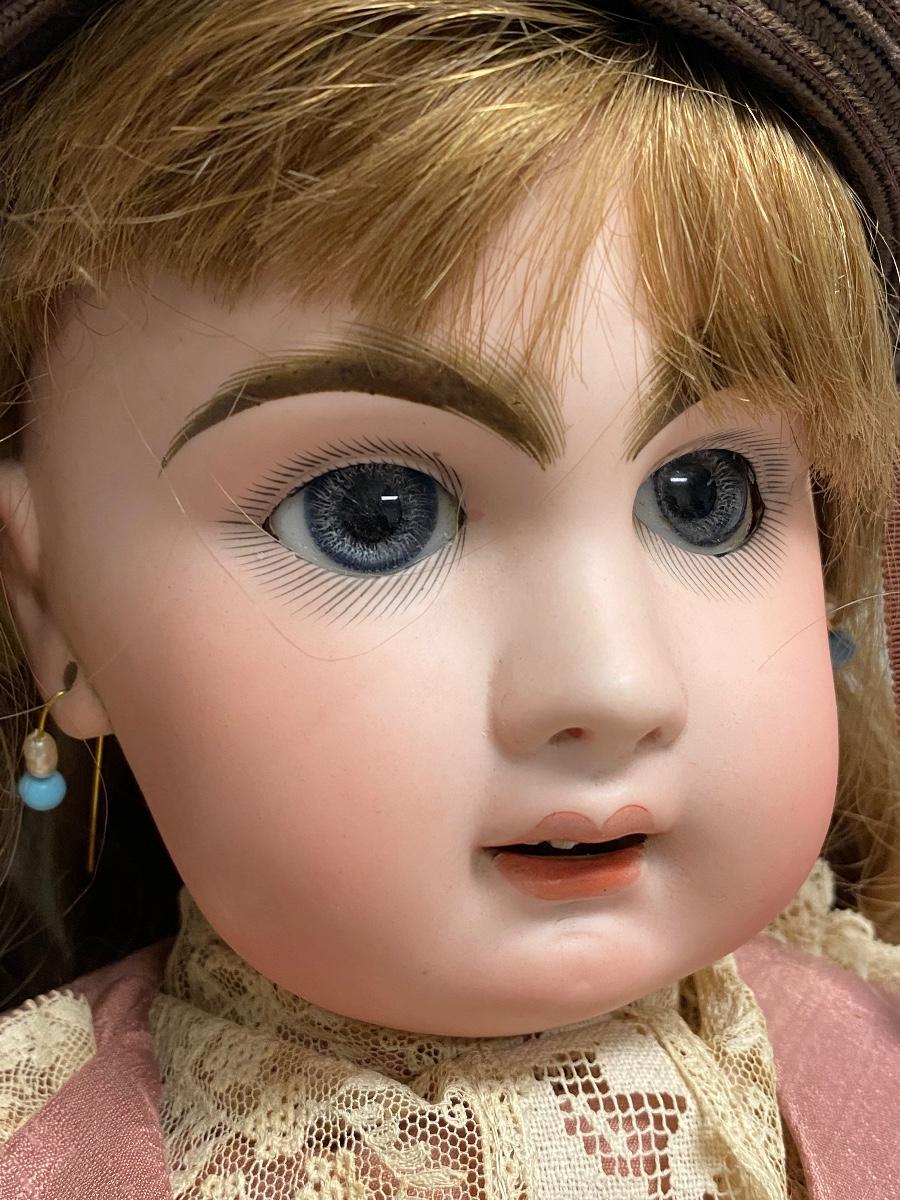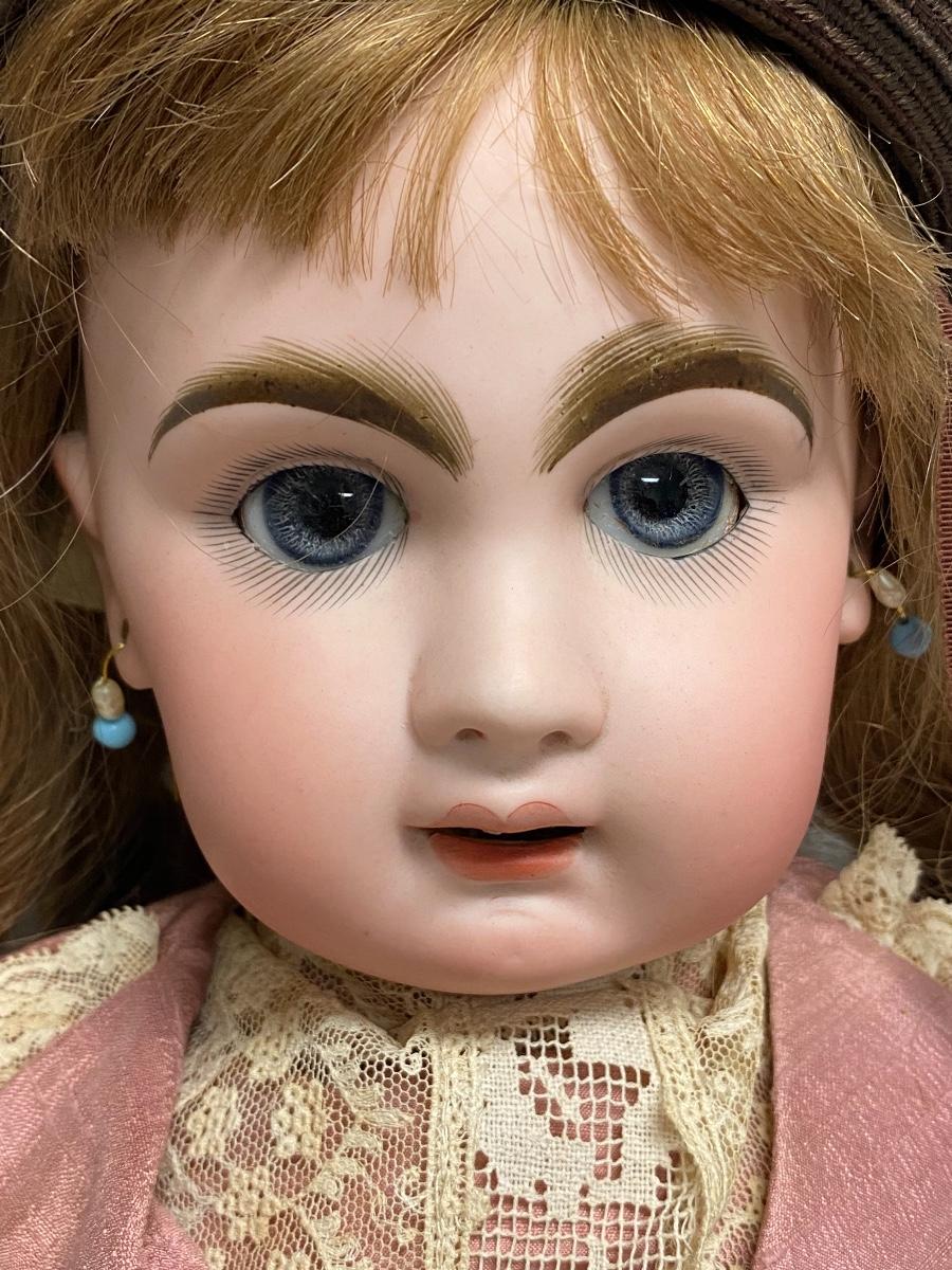 Beautiful bisque & composite Victorian styled doll. Dark hair, blue sleep eyes. About 26" size. Back of head is stamped "Tete Jumeau" in red, no other marks. Her hands have some wear and chips, as does the knee joint edges. Nodamage noted on the head.