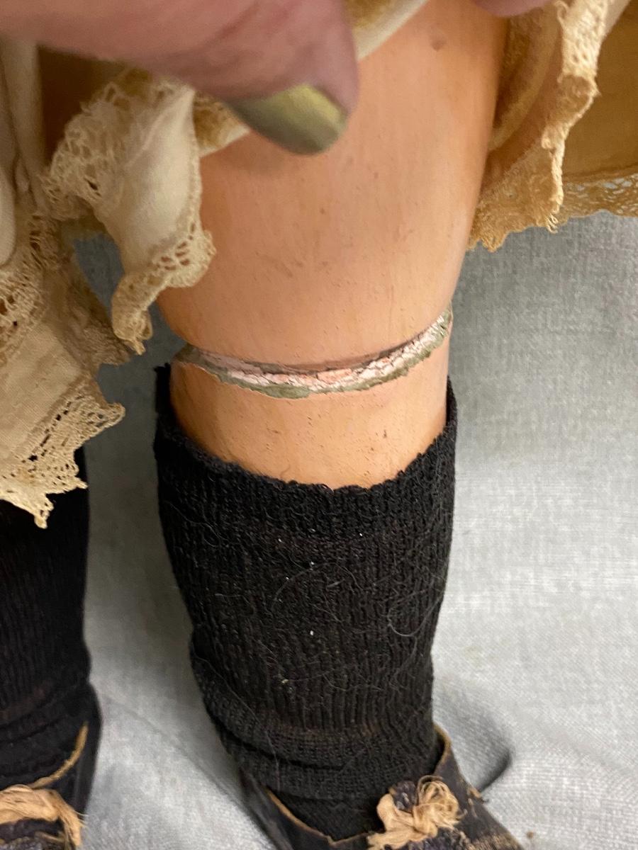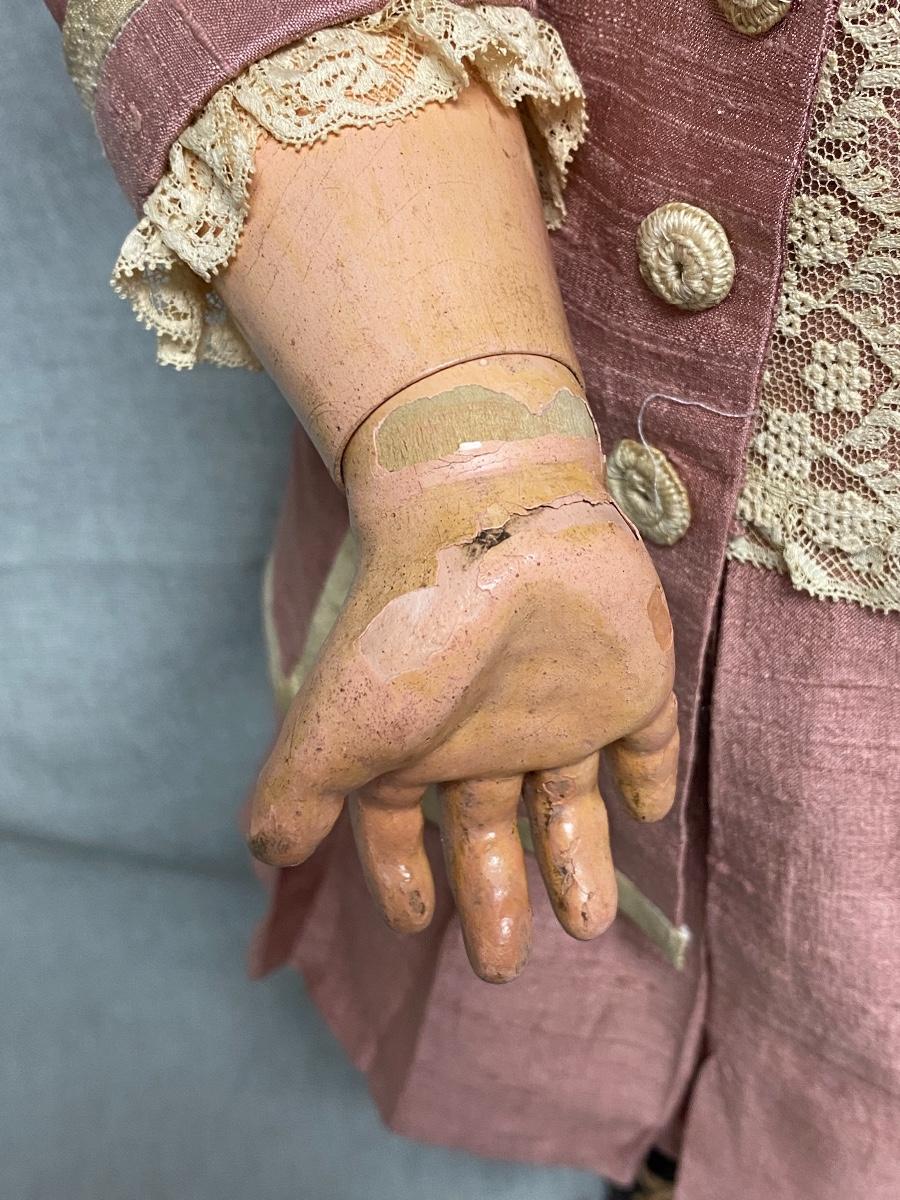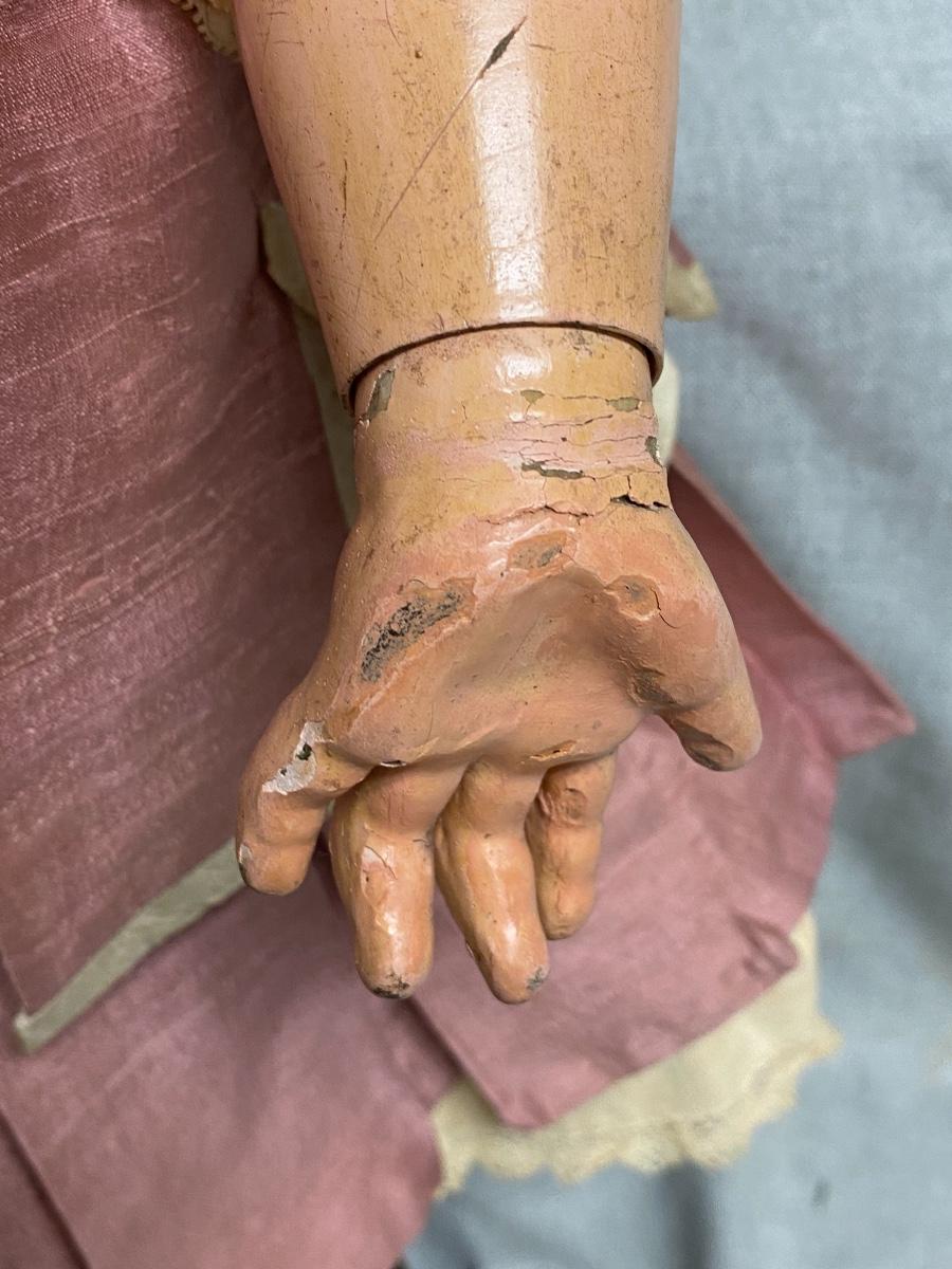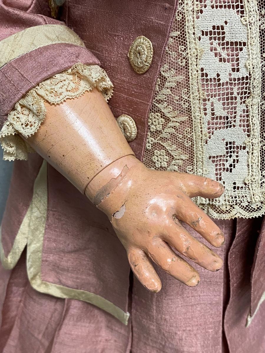 Beautiful bisque & composite Victorian styled doll. Dark hair, blue sleep eyes. About 26" size. Back of head is stamped "Tete Jumeau" in red, no other marks. Her hands have some wear and chips, as does the knee joint edges. Nodamage noted on the head.