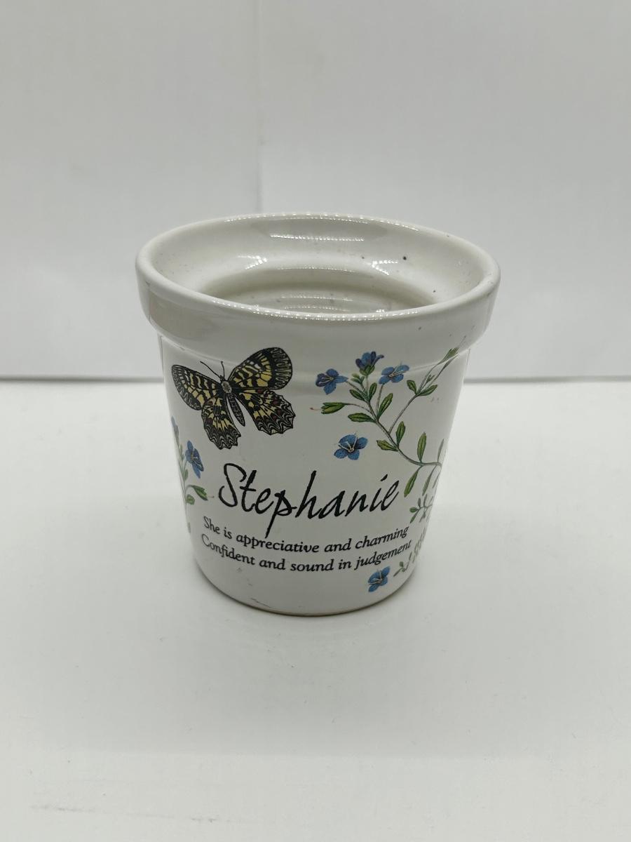 Small Butterfly and Lady Bug Planter Pot Candle Personalized Gift Stephanie. Unused candle, just a little dusty. Has the name Stephanie on one side but can be displayed the opposite way just as good. Only about 3" size.