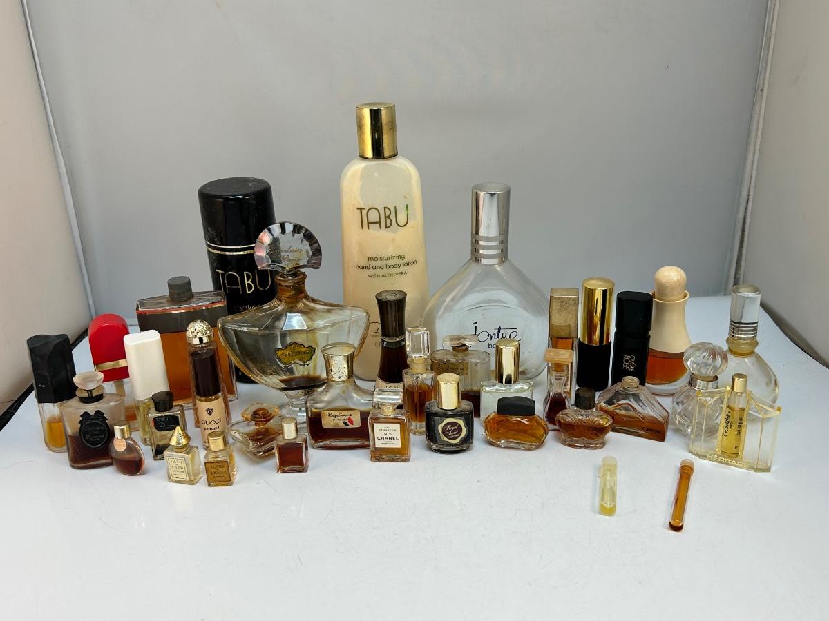 Huge Mixed Lot of Vintage and Retro Perfume Bottles Tabu Chanel Dior Gucci Various Amounts. All sizes and shapes. Some empty, some full, and some in between.