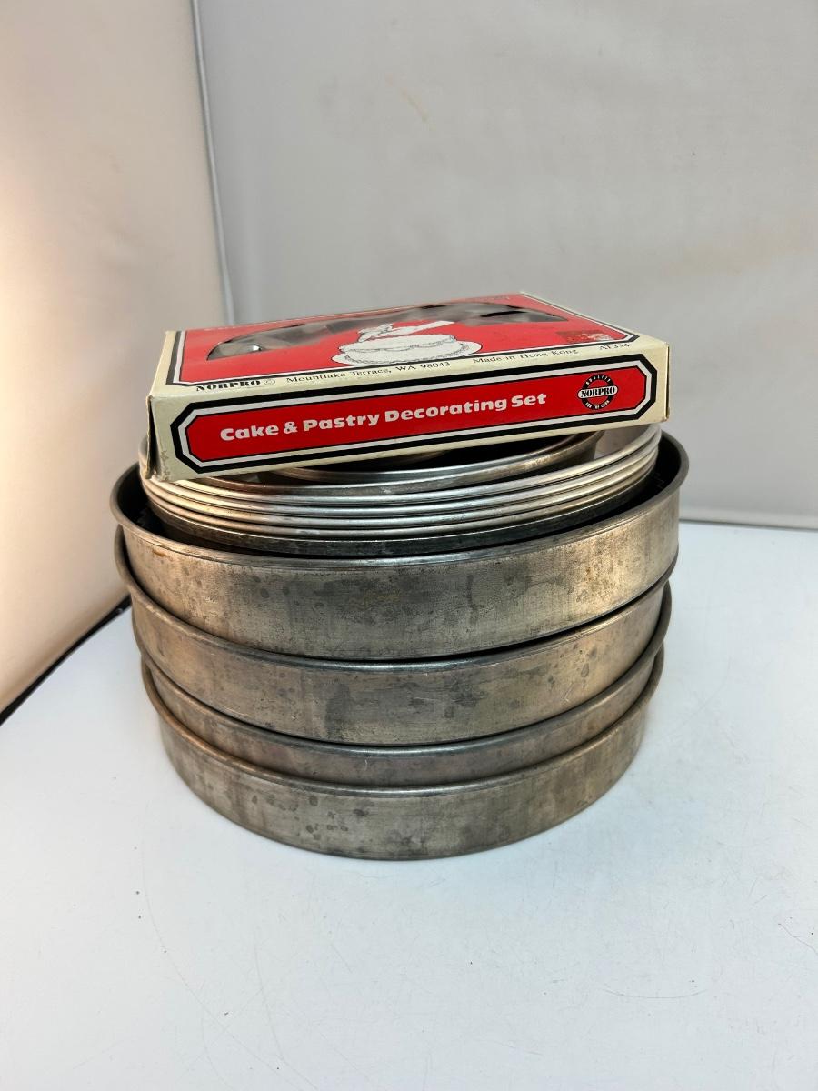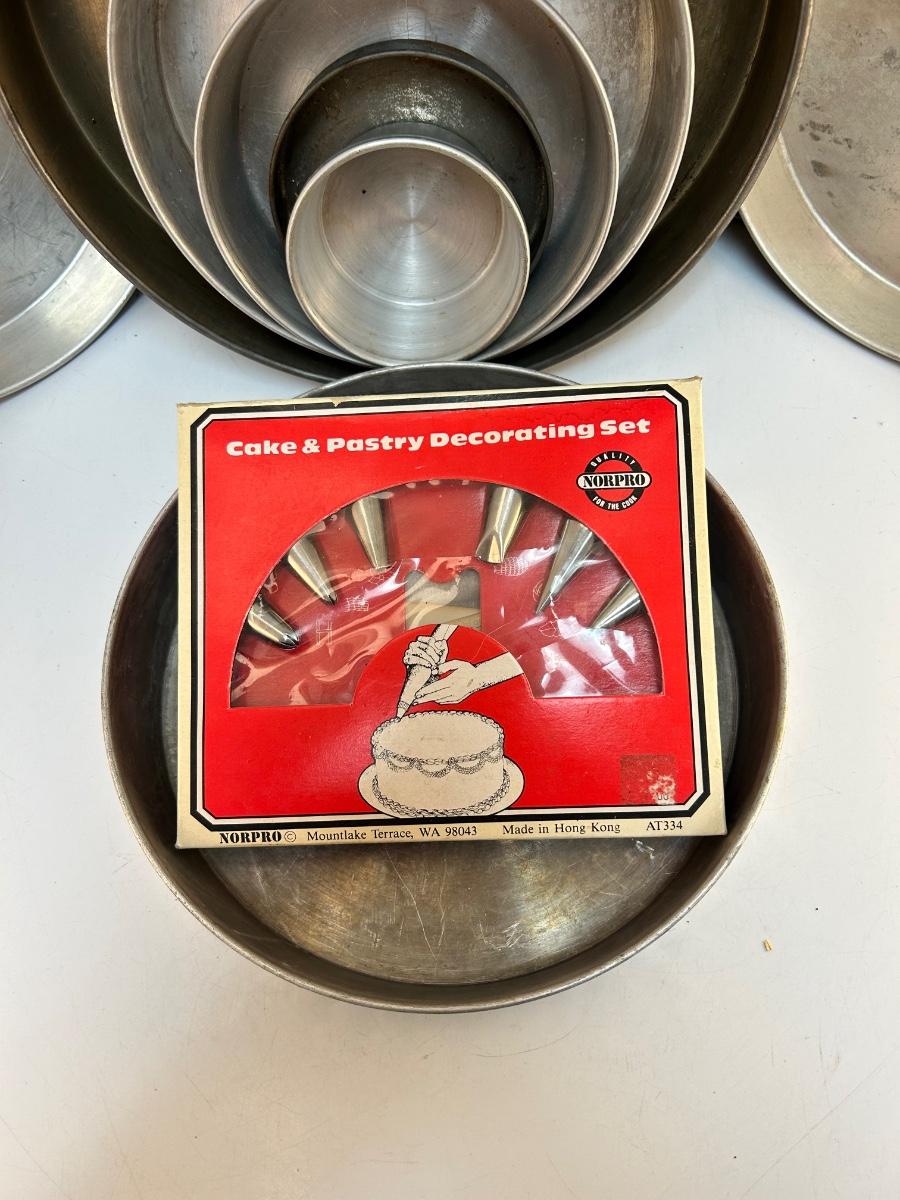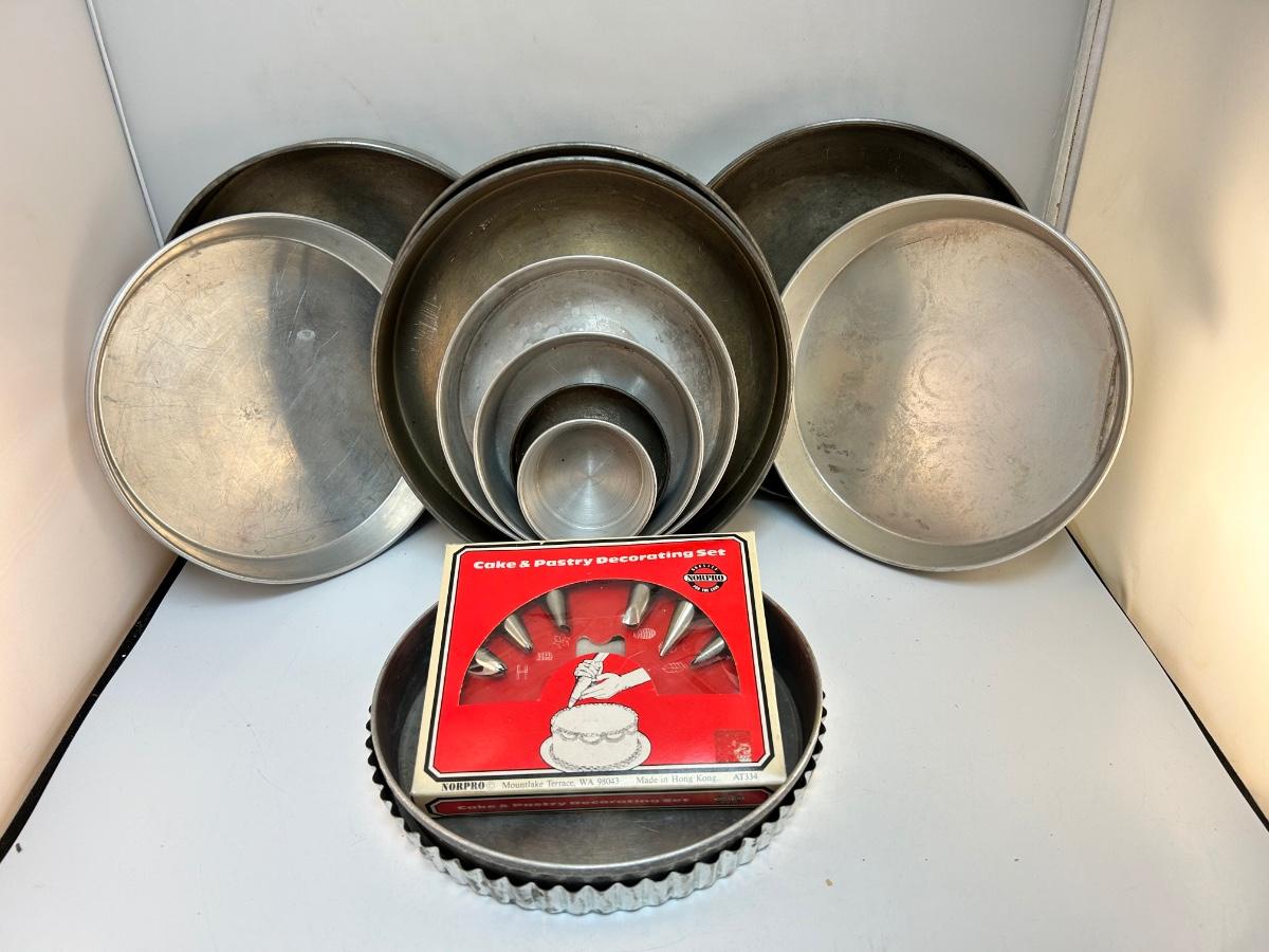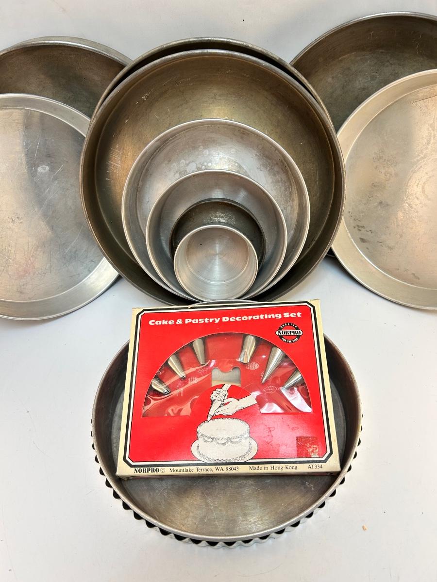 Large Lot of Metal Round Cake Baking Pans and Set of Icing Decorating Tips. In good condition. Tip set is complete but icing bag seems stiff from age and storage.