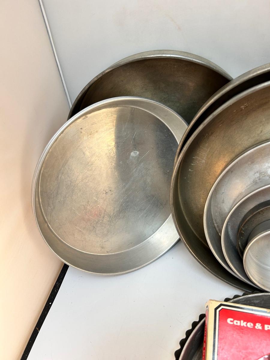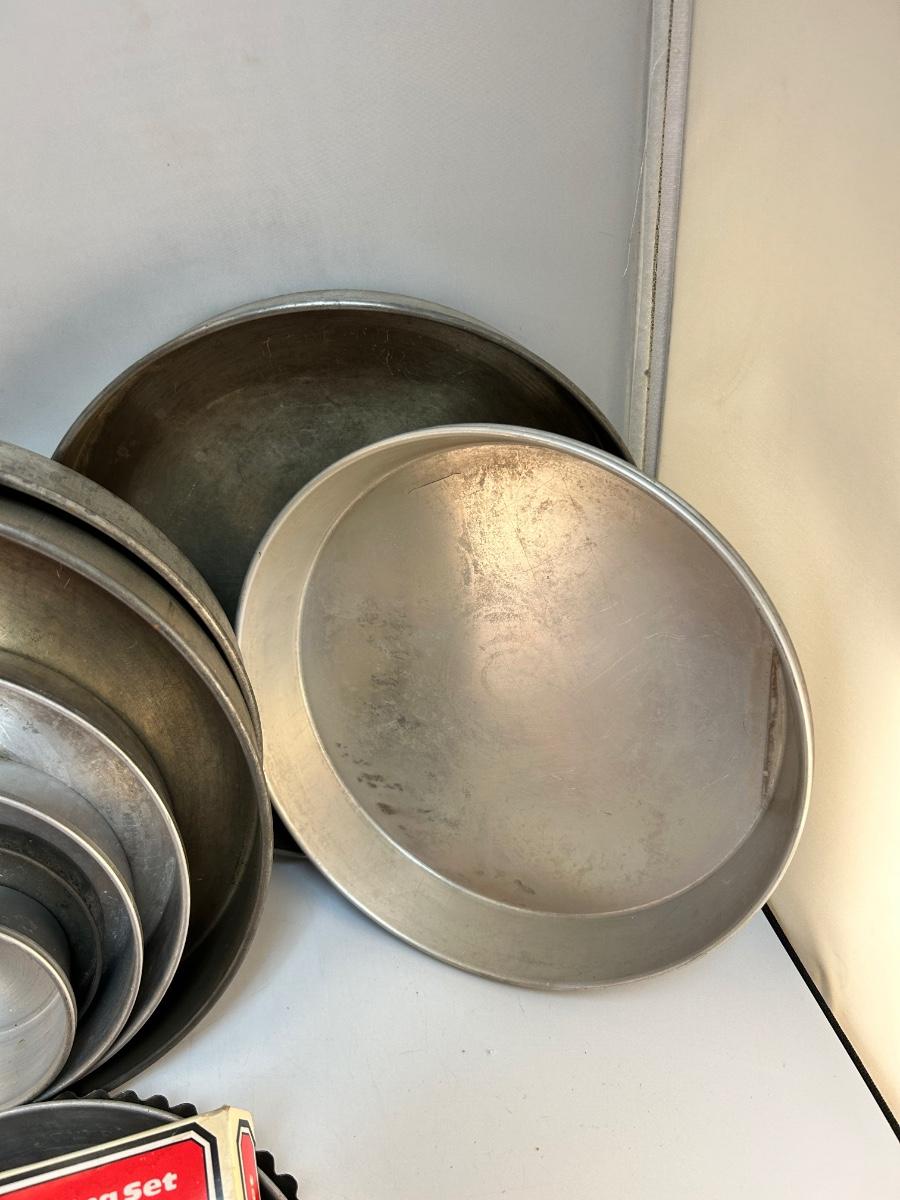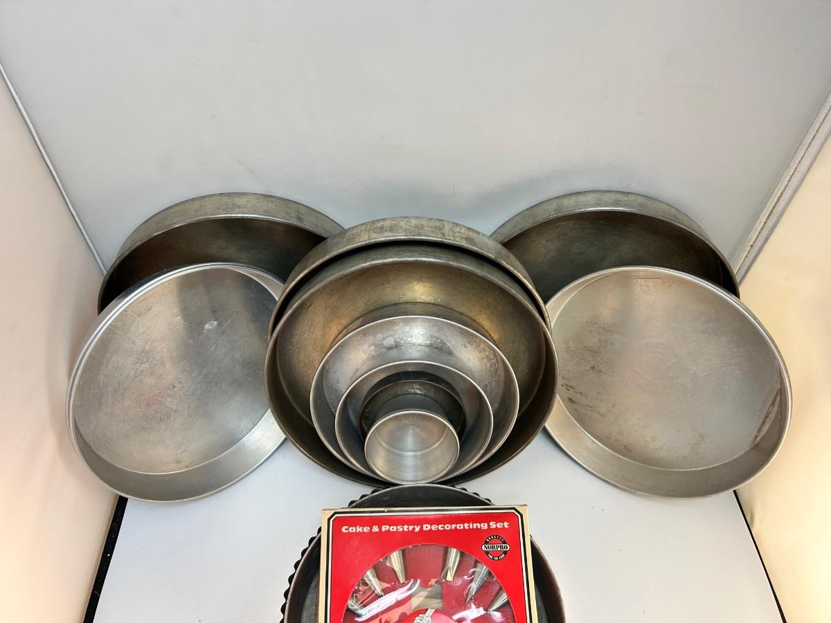 Large Lot of Metal Round Cake Baking Pans and Set of Icing Decorating Tips