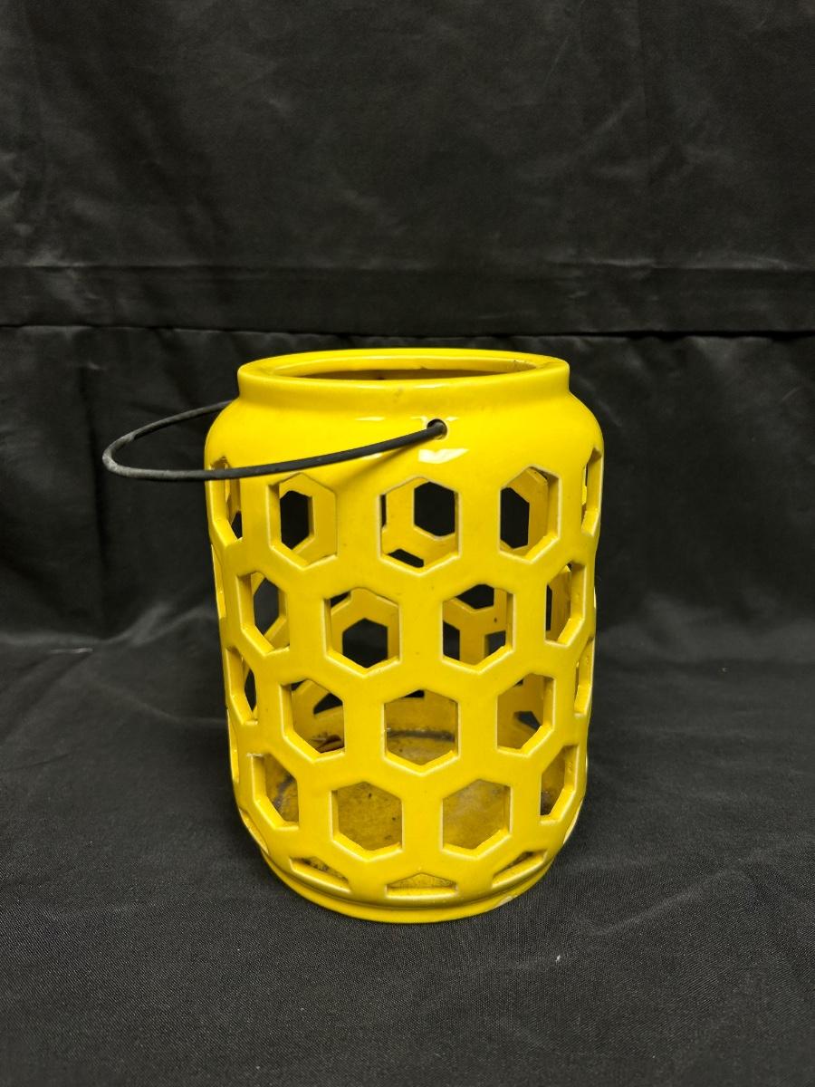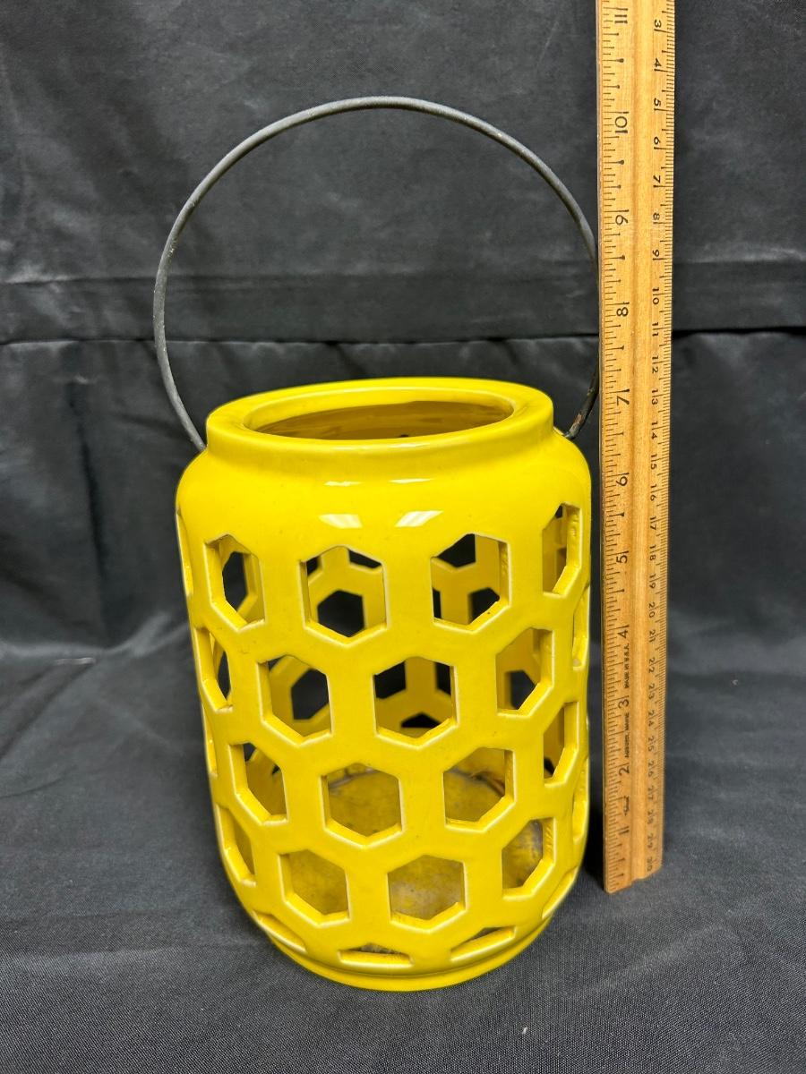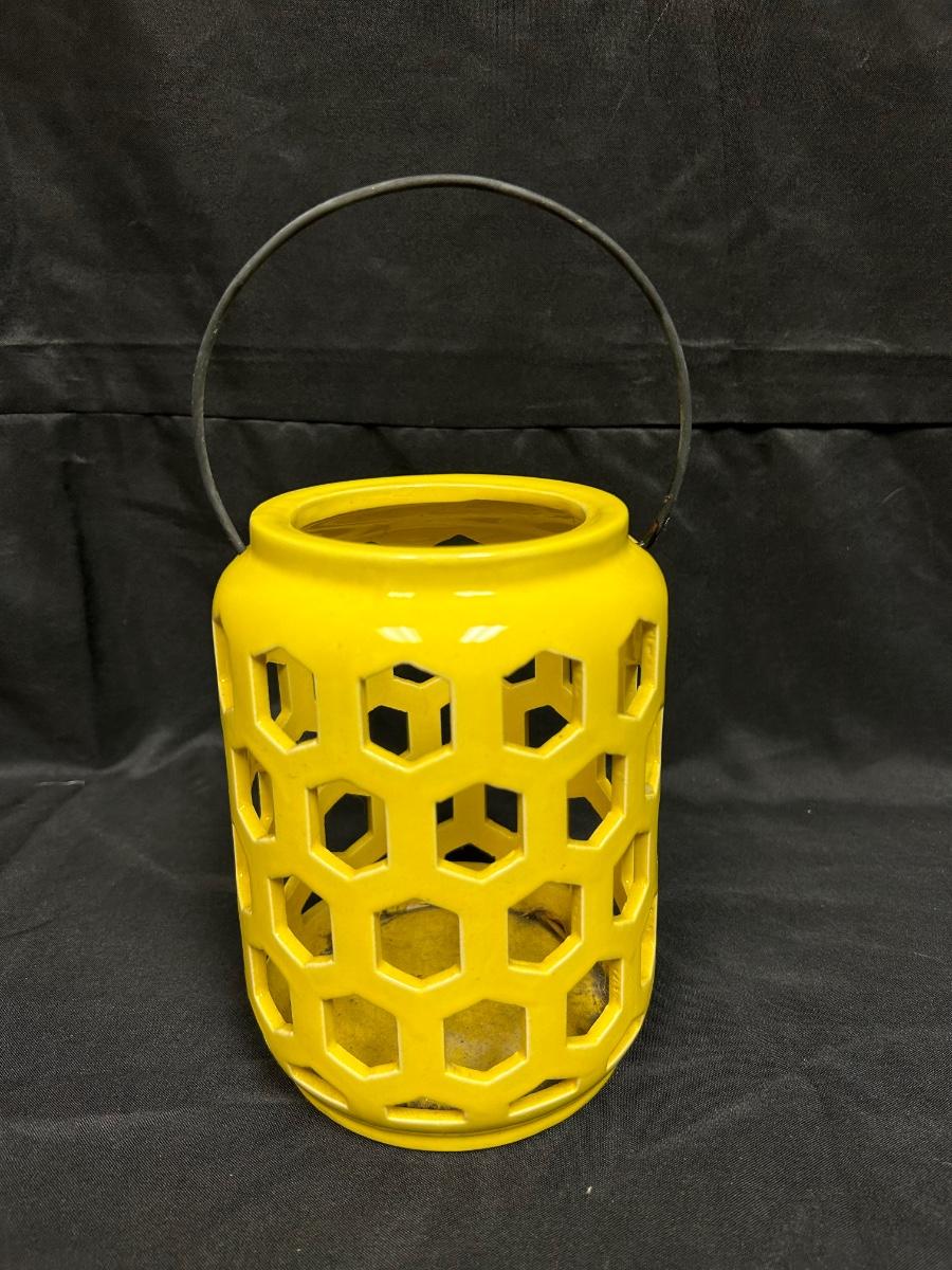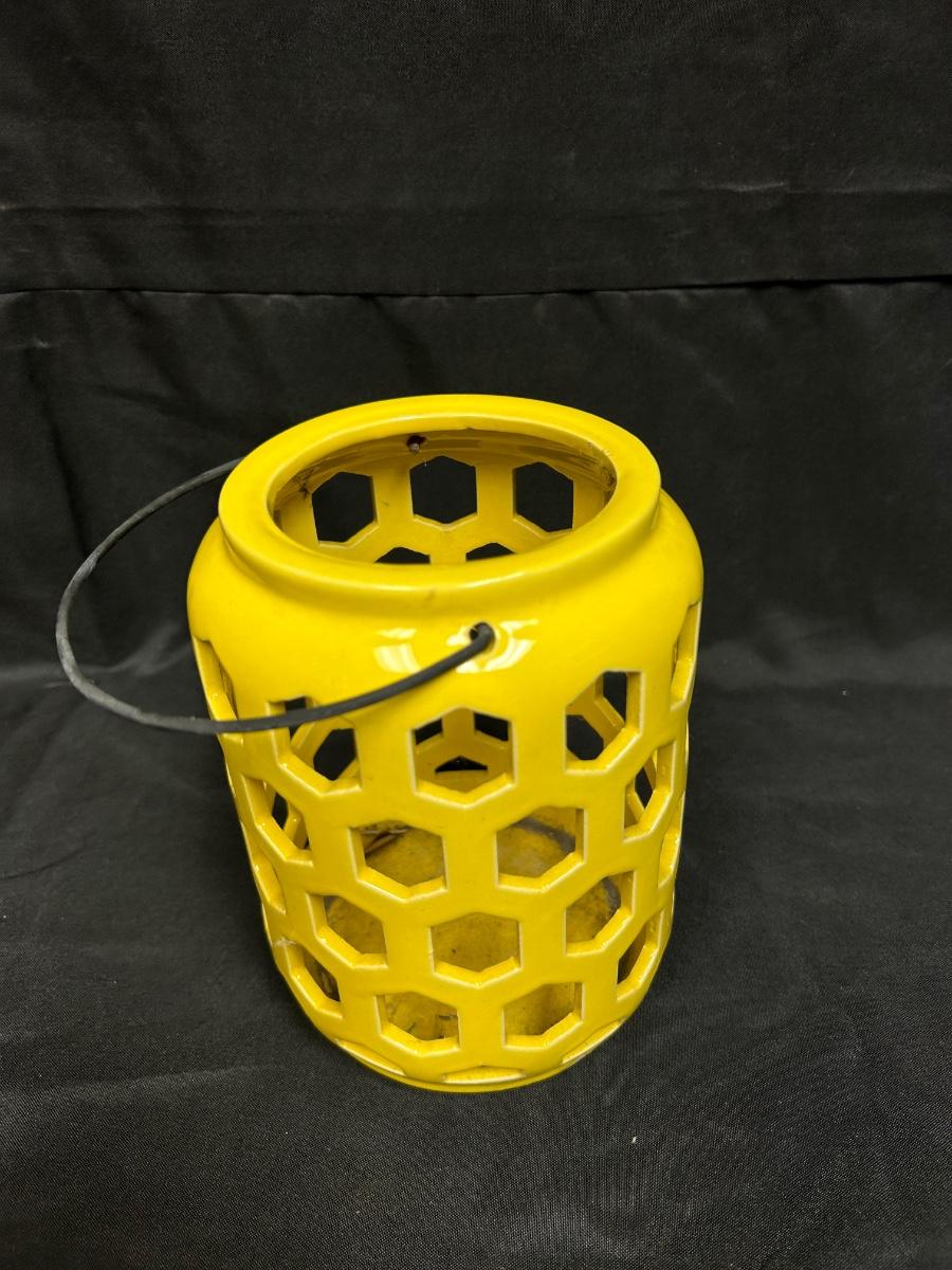 Yellow Ceramic Garden Patio Candle Lantern. In good previously used condition, just a little dirty inside. About 7" size not including handle.