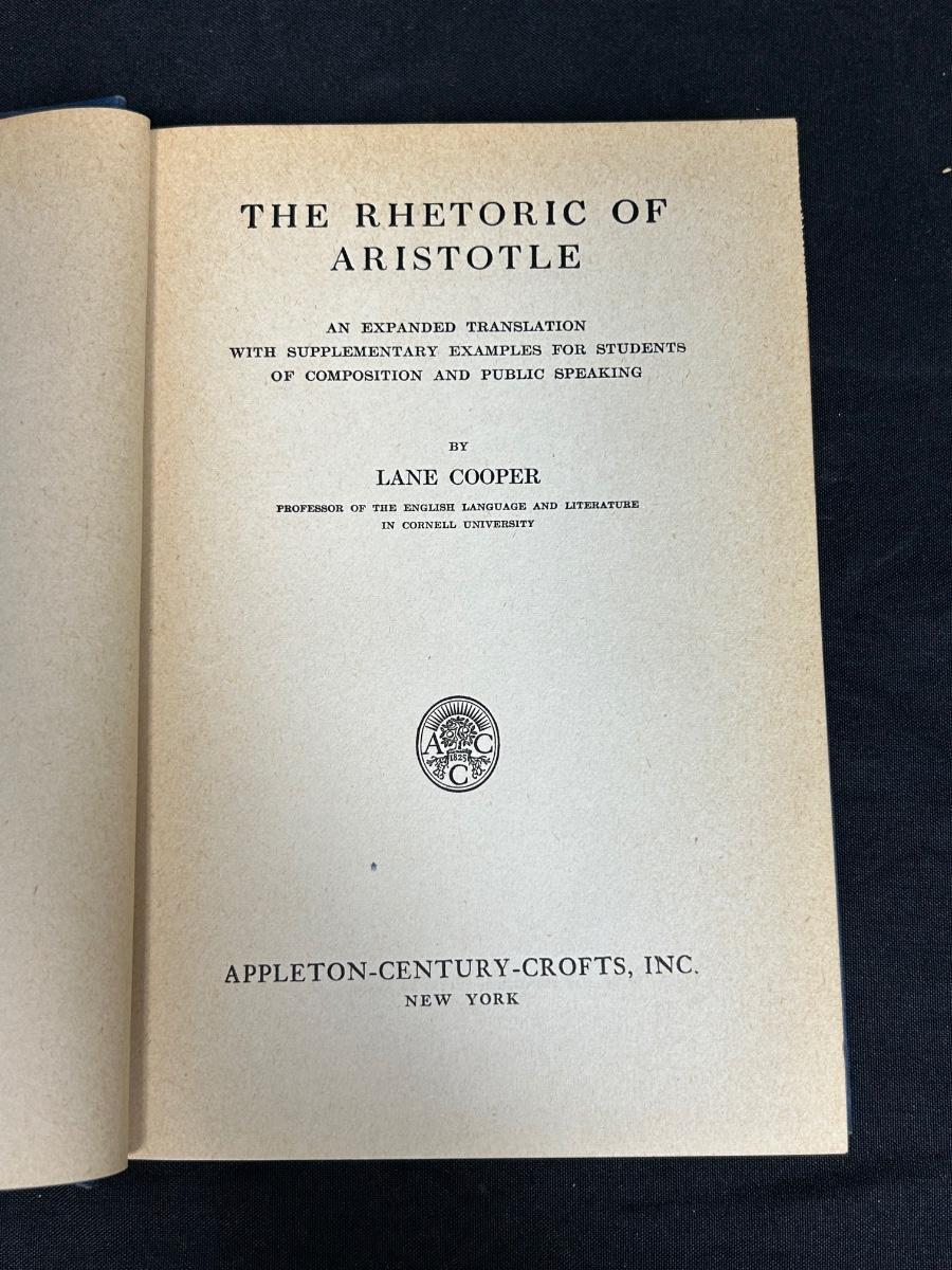 The Rhetoric of Aristotle by Lane Cooper 1932 Student Hardback Book. In good vintage condition. Cover has fade from years on shelf.