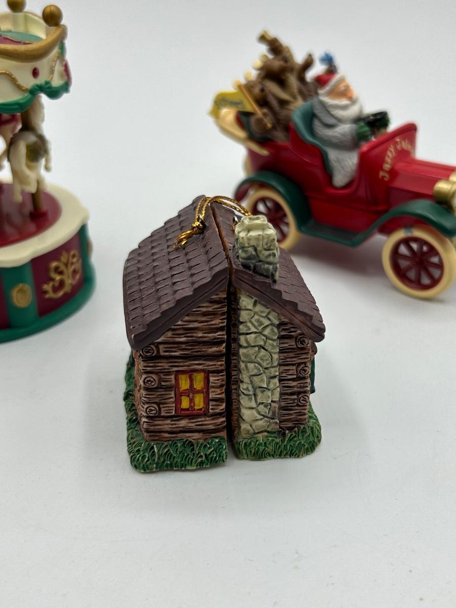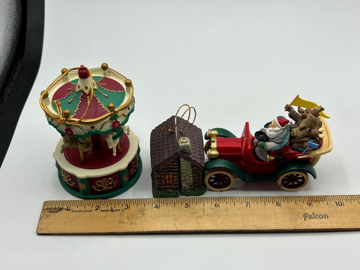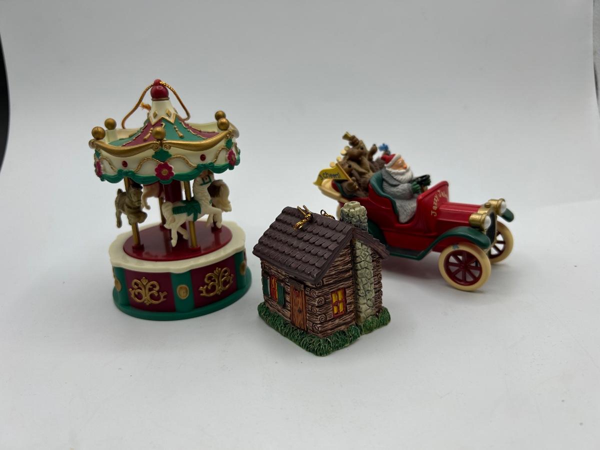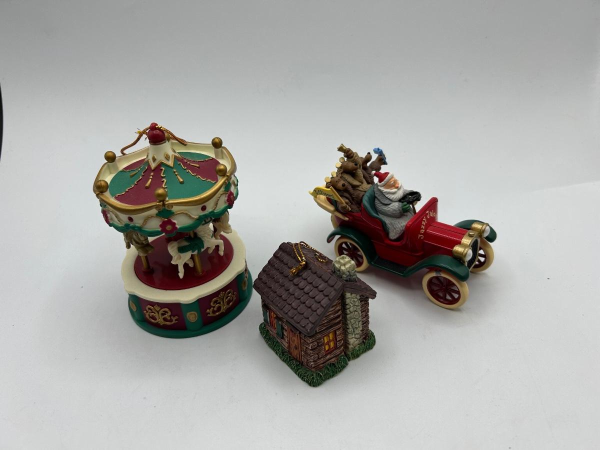 Lot of Three Christmas Holiday Tree Ornament Carousel Jazzy Jalopy Log Cabin