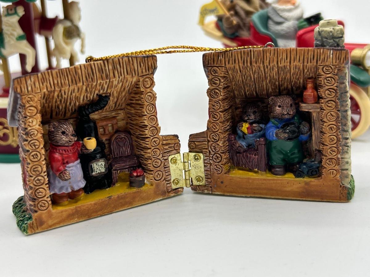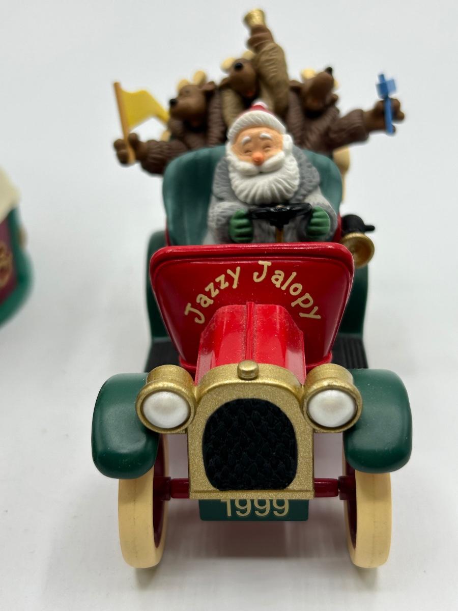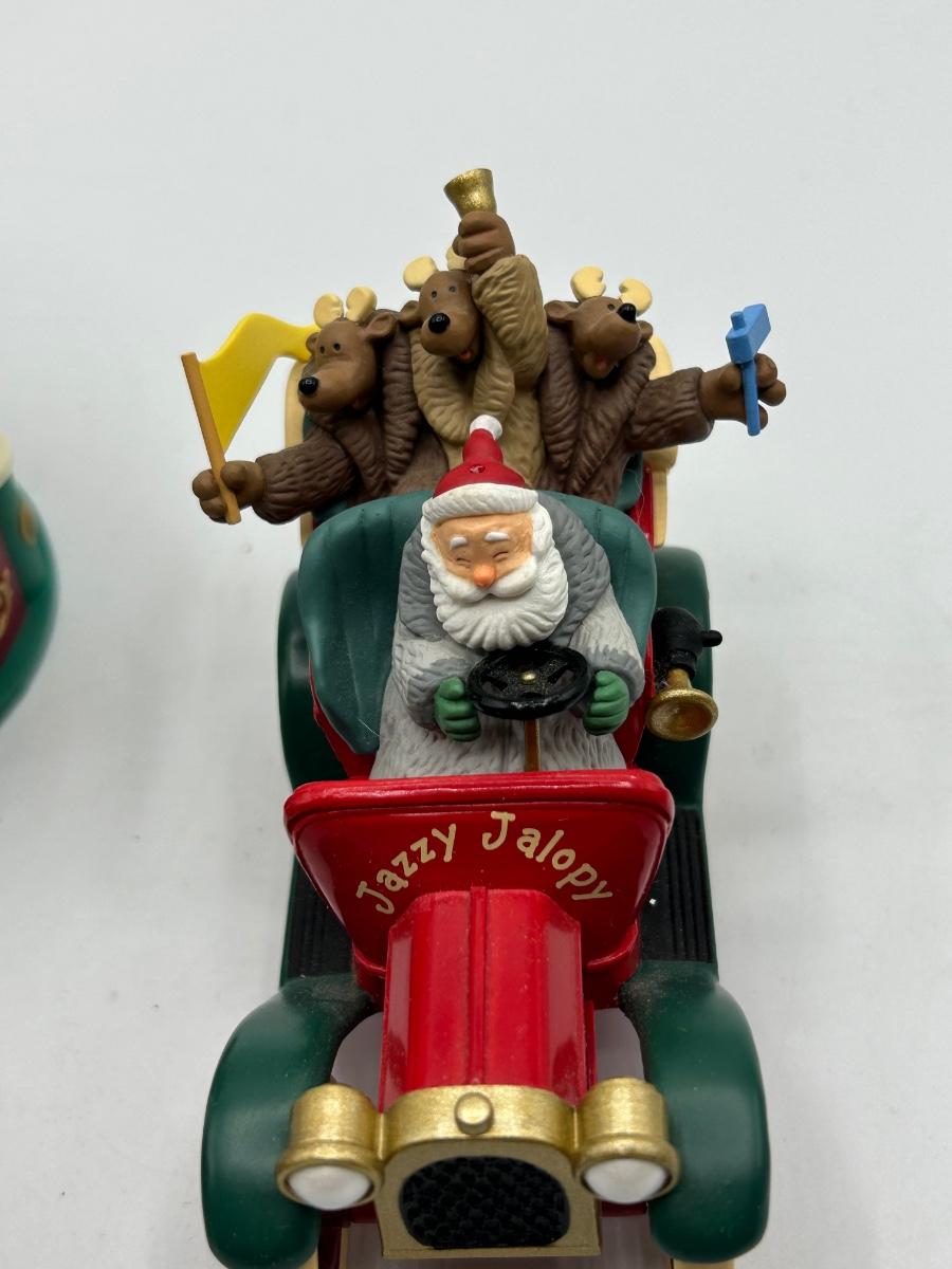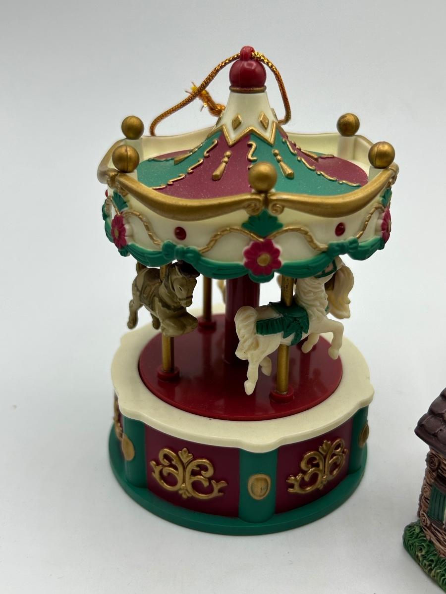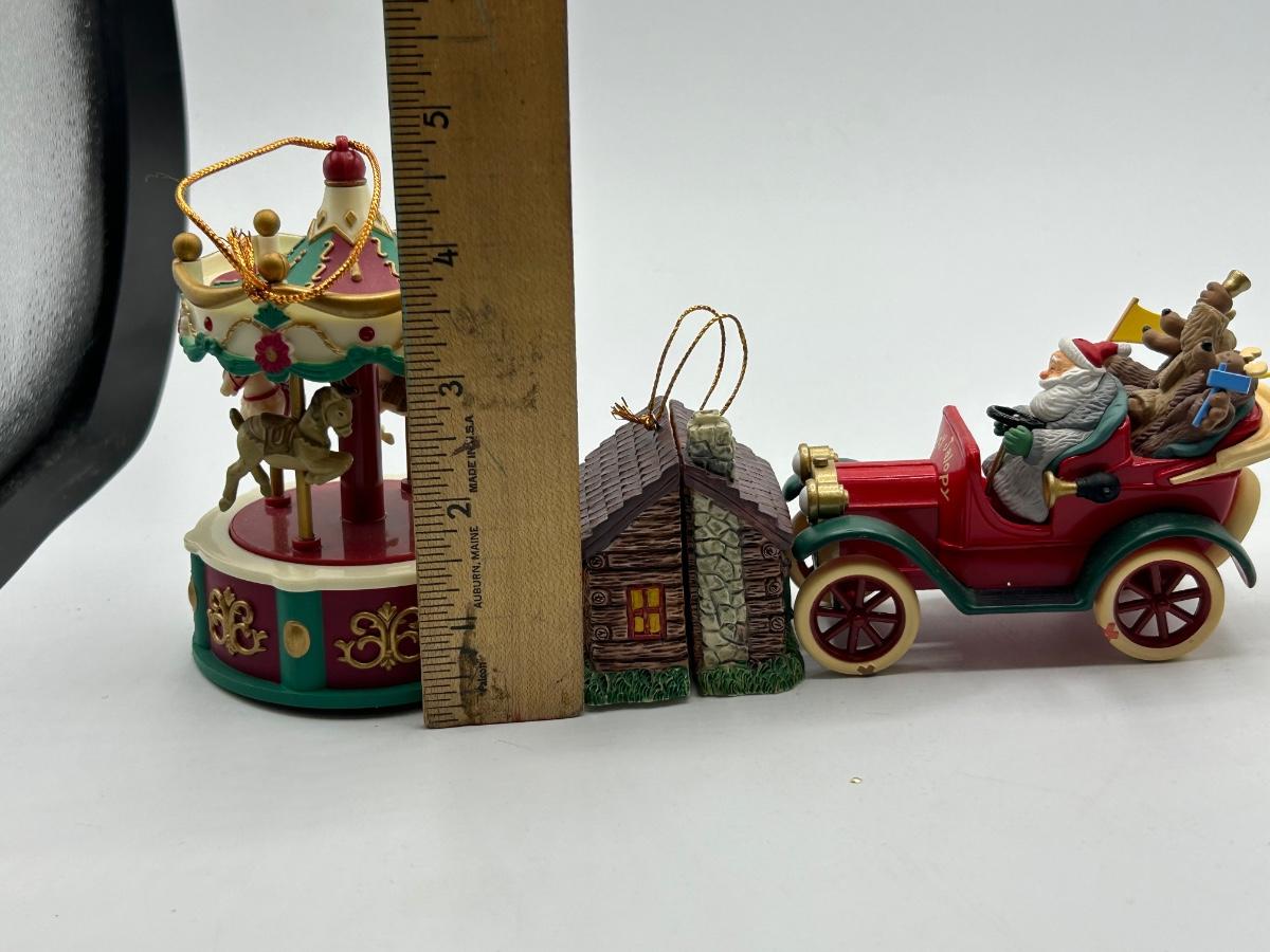 Lot of Three Christmas Holiday Tree Ornament Carousel Jazzy Jalopy Log Cabin