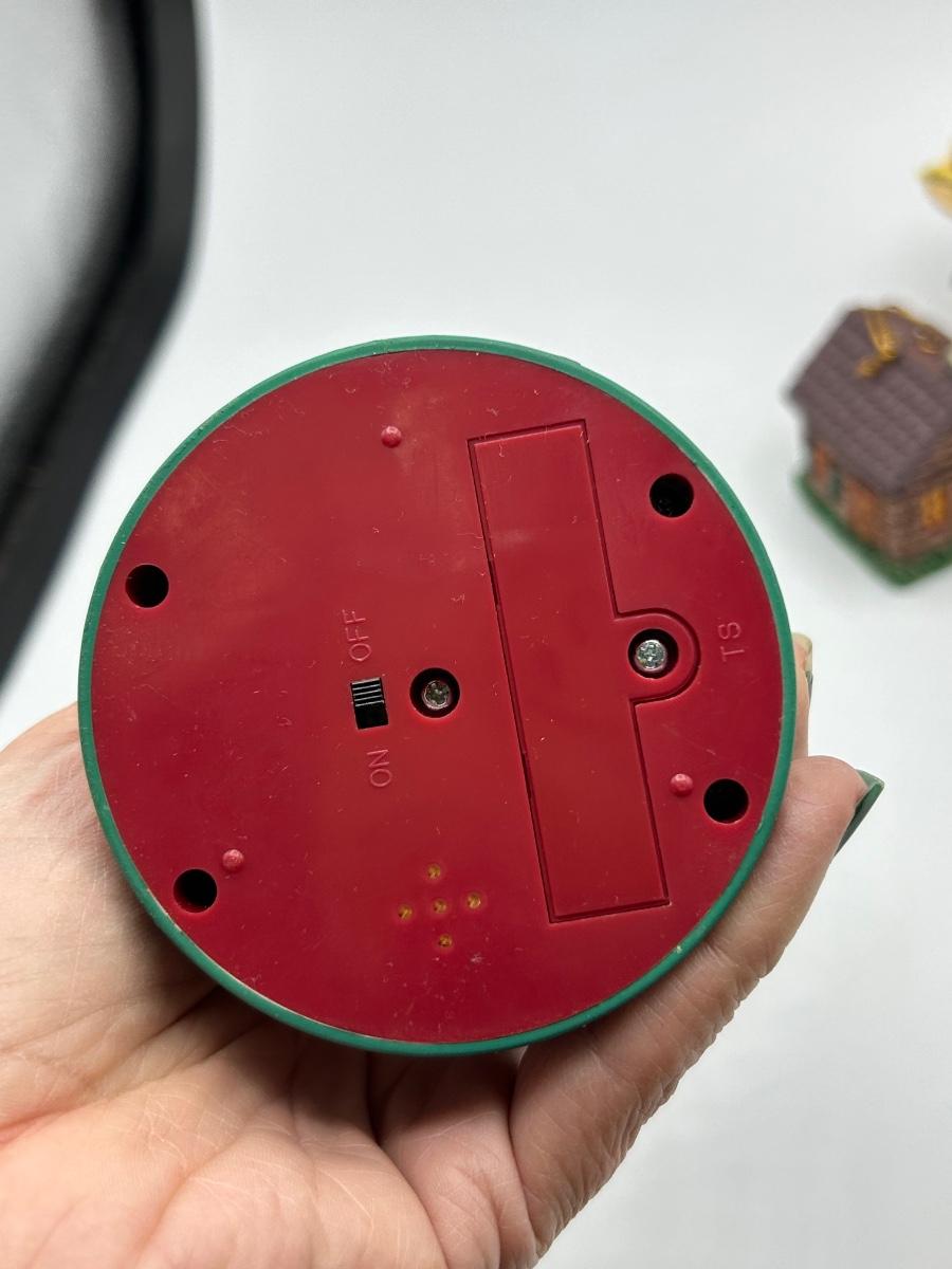 Lot of Three Christmas Holiday Tree Ornament Carousel Jazzy Jalopy Log Cabin. Good condition. Jazzy Jalopy plays music. Carousel needs new batteries, not working.