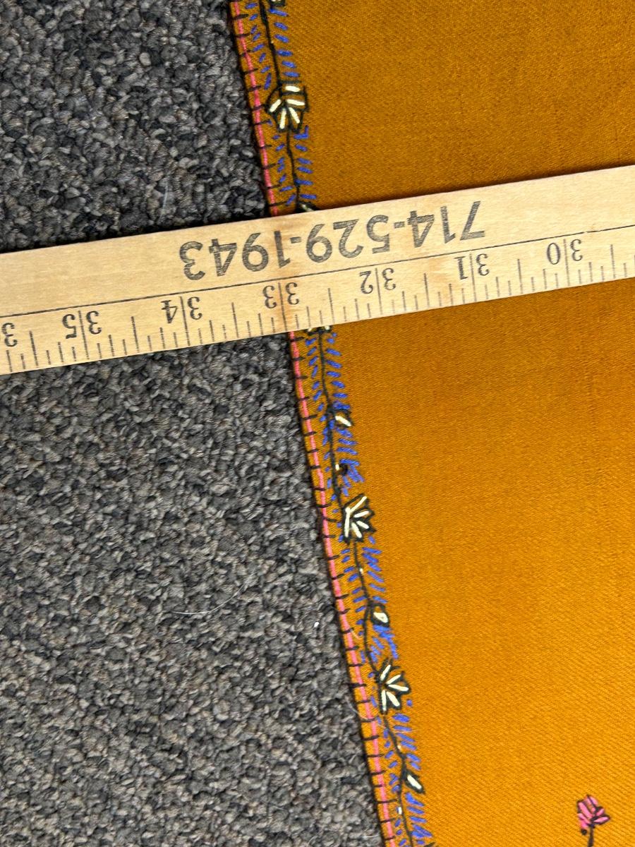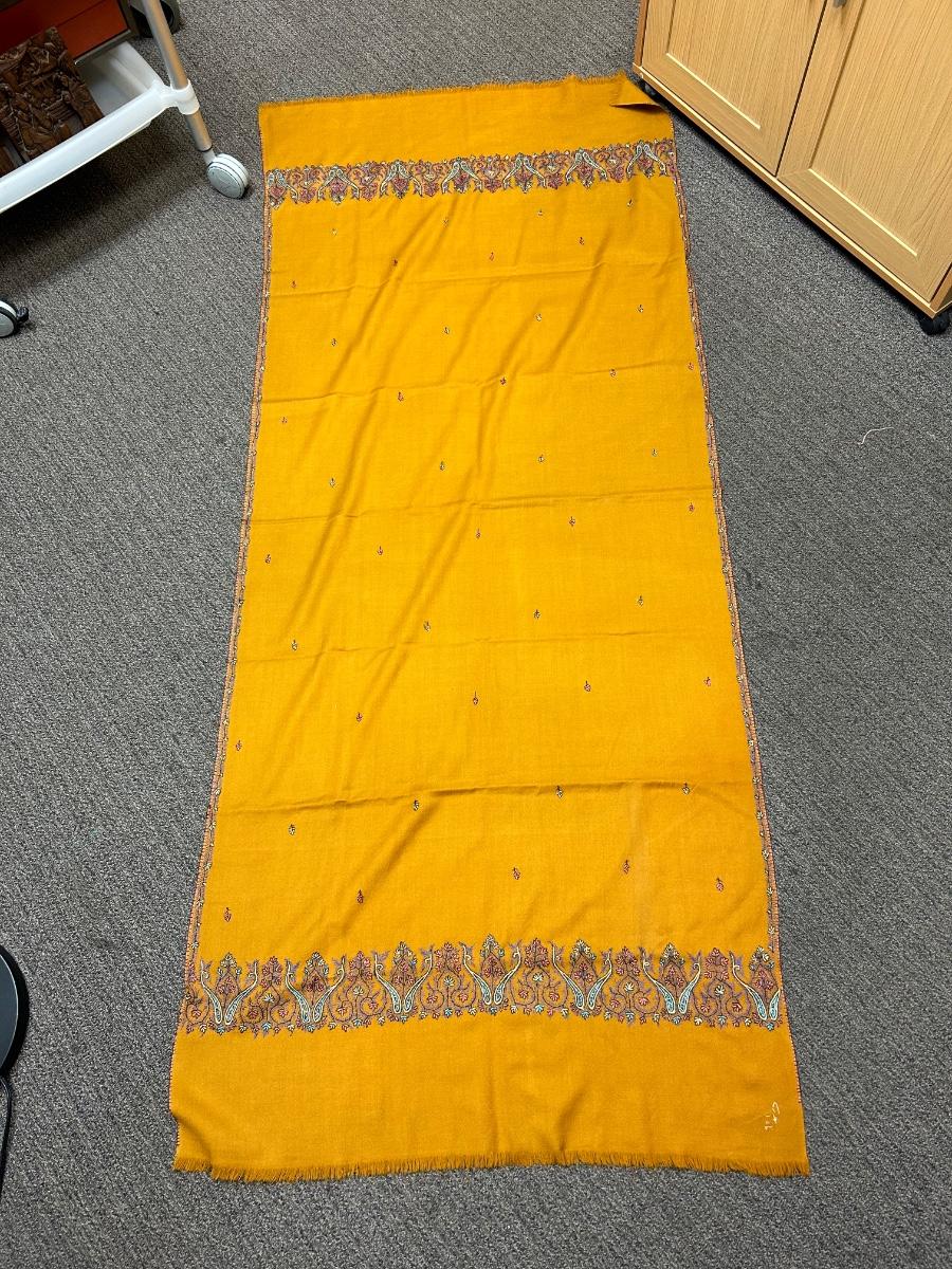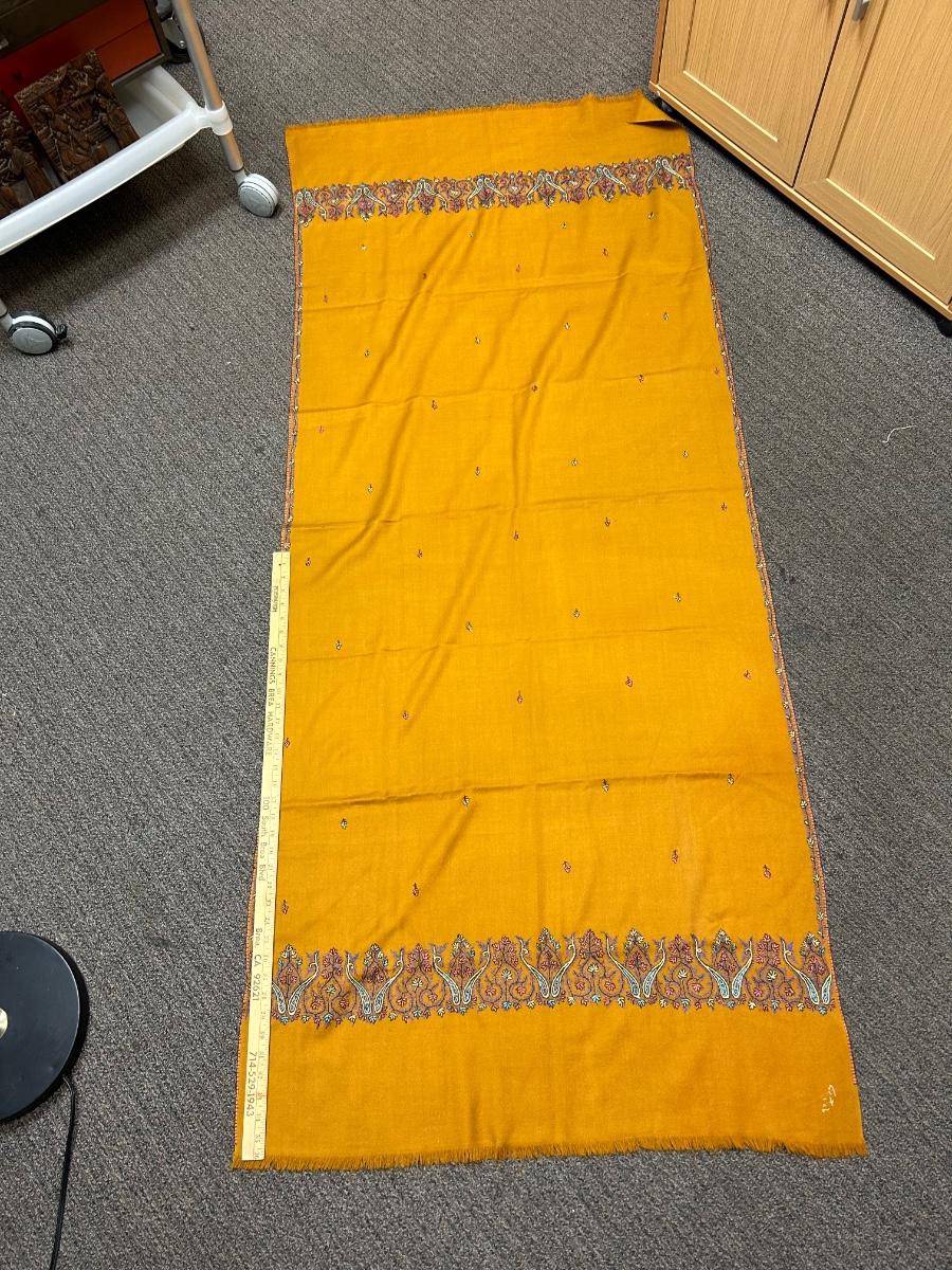 Vintage Golden Yellow Hand Embroidered Table Runner or Shoulder Wrap Scarf. In good condition, no holes or spots. All of the stitching looks to be hand done. About 6' length and 33" wide.