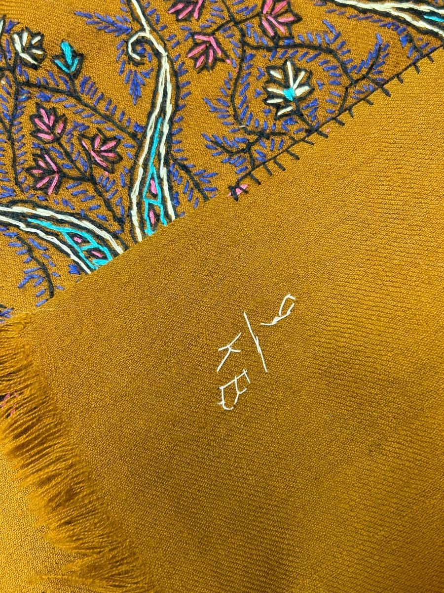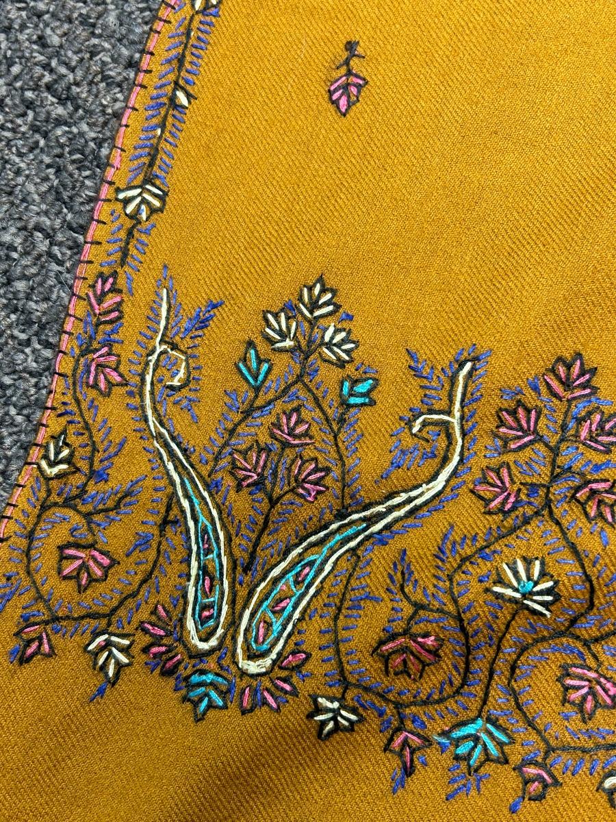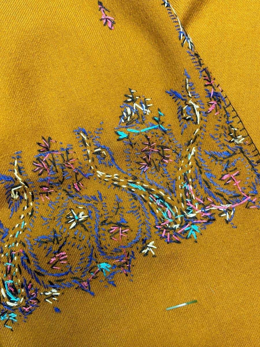 Vintage Golden Yellow Hand Embroidered Table Runner or Shoulder Wrap Scarf. In good condition, no holes or spots. All of the stitching looks to be hand done. About 6' length and 33" wide.