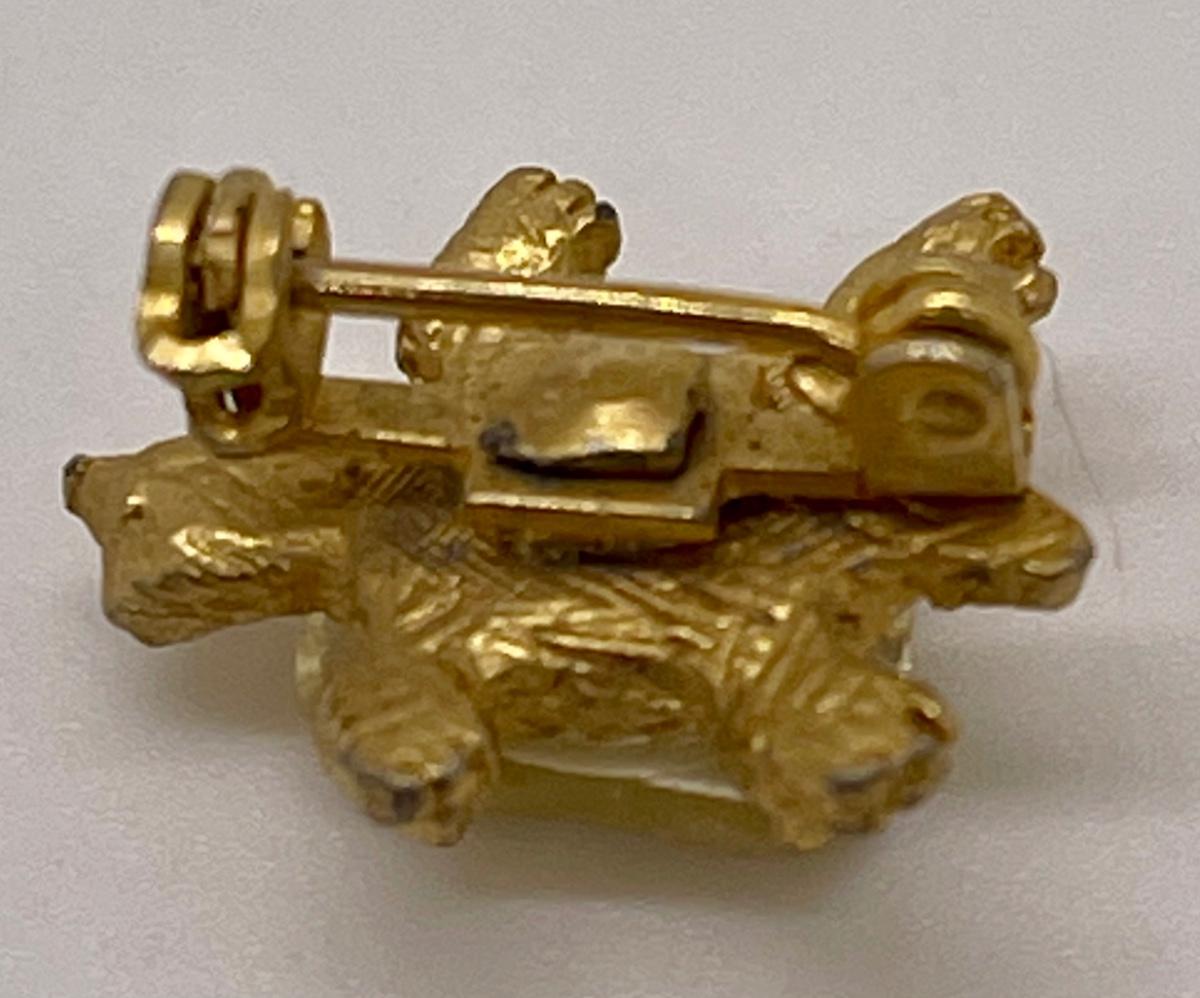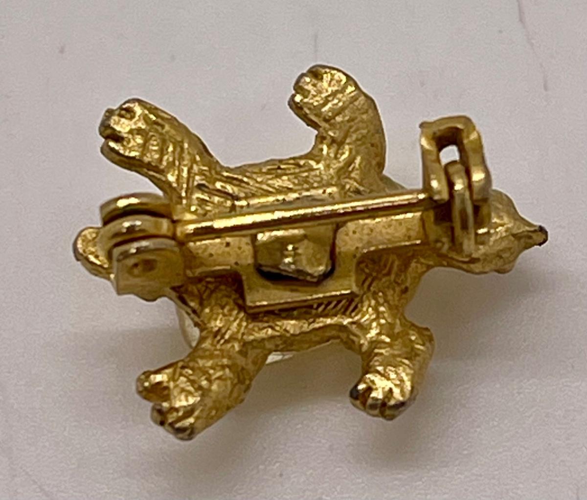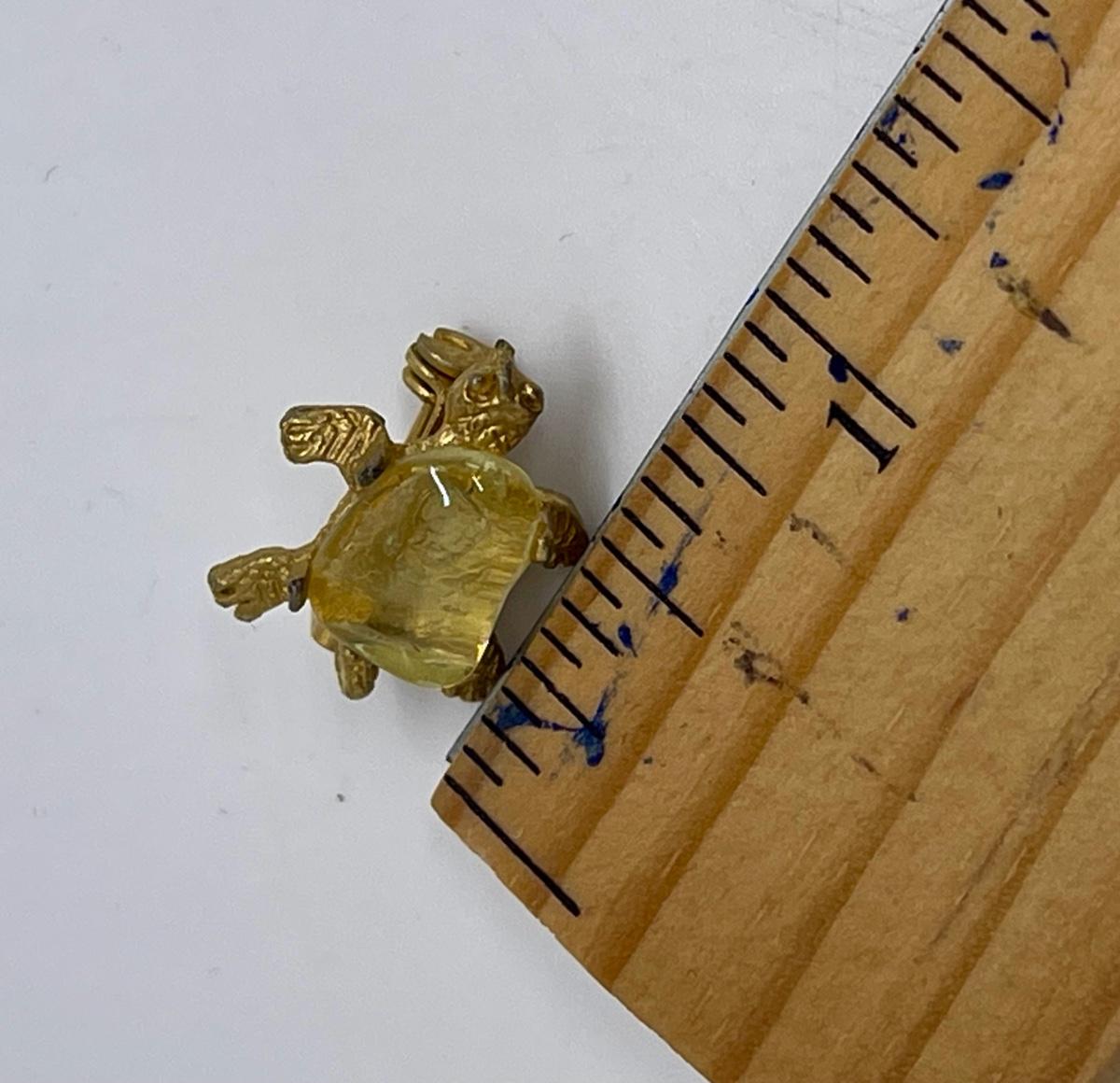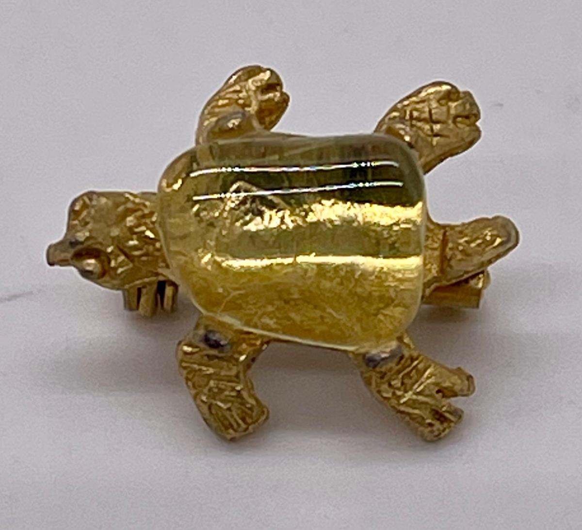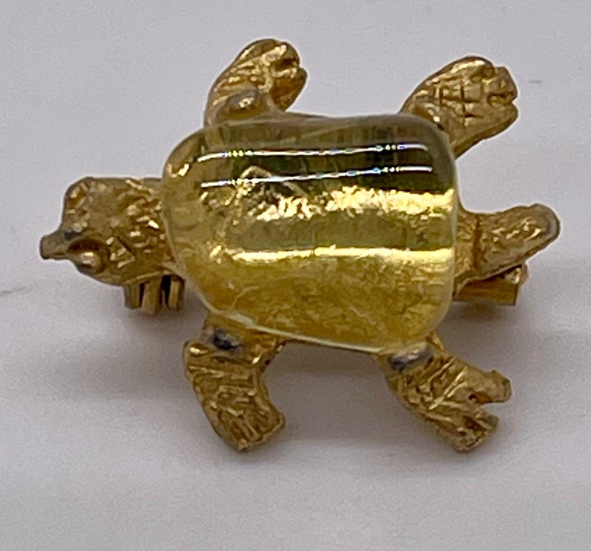 In good vintage condition. Measures approx. 1/2" long. It has a stone shell and gold tone body.