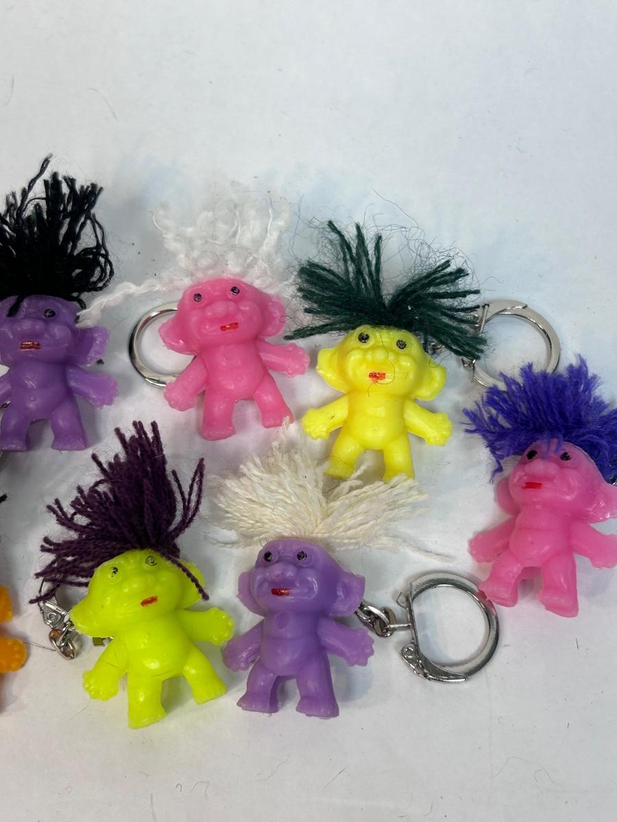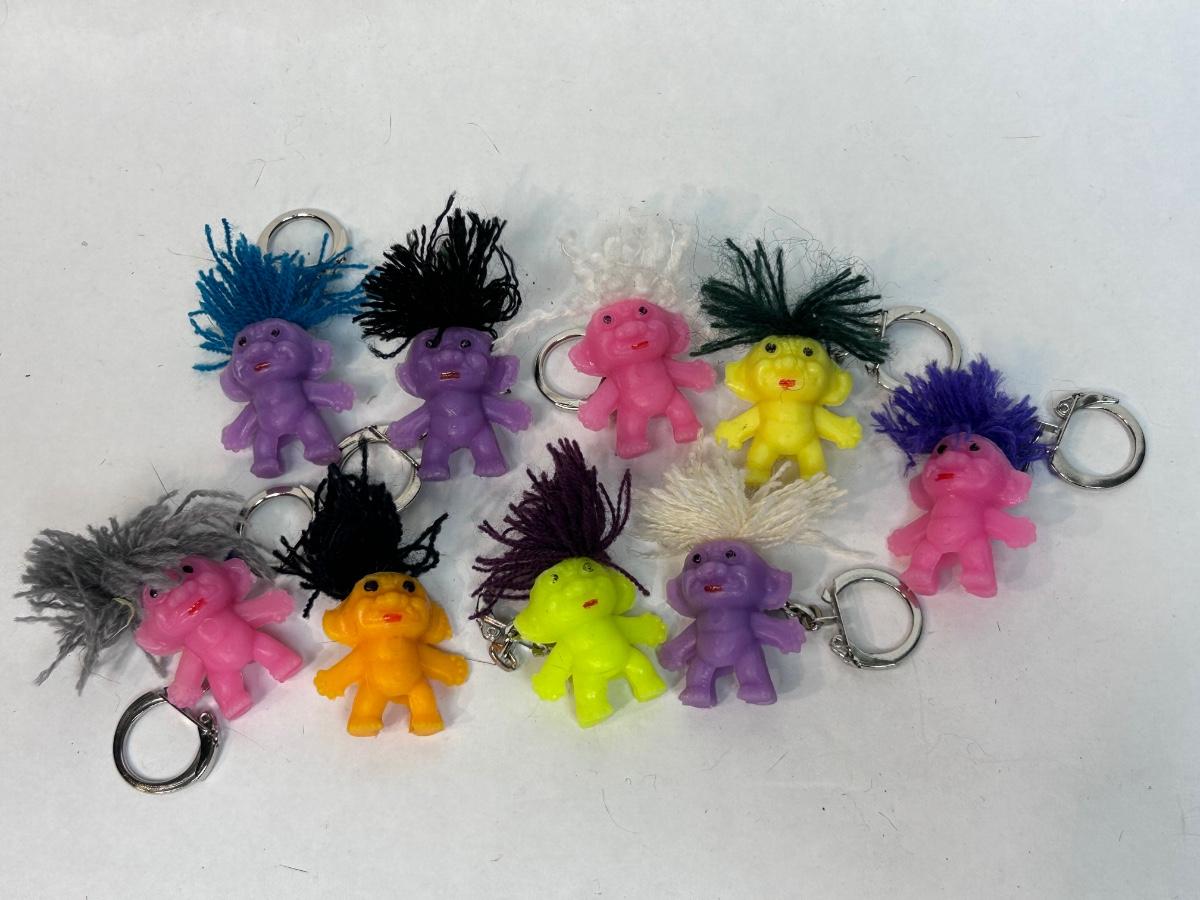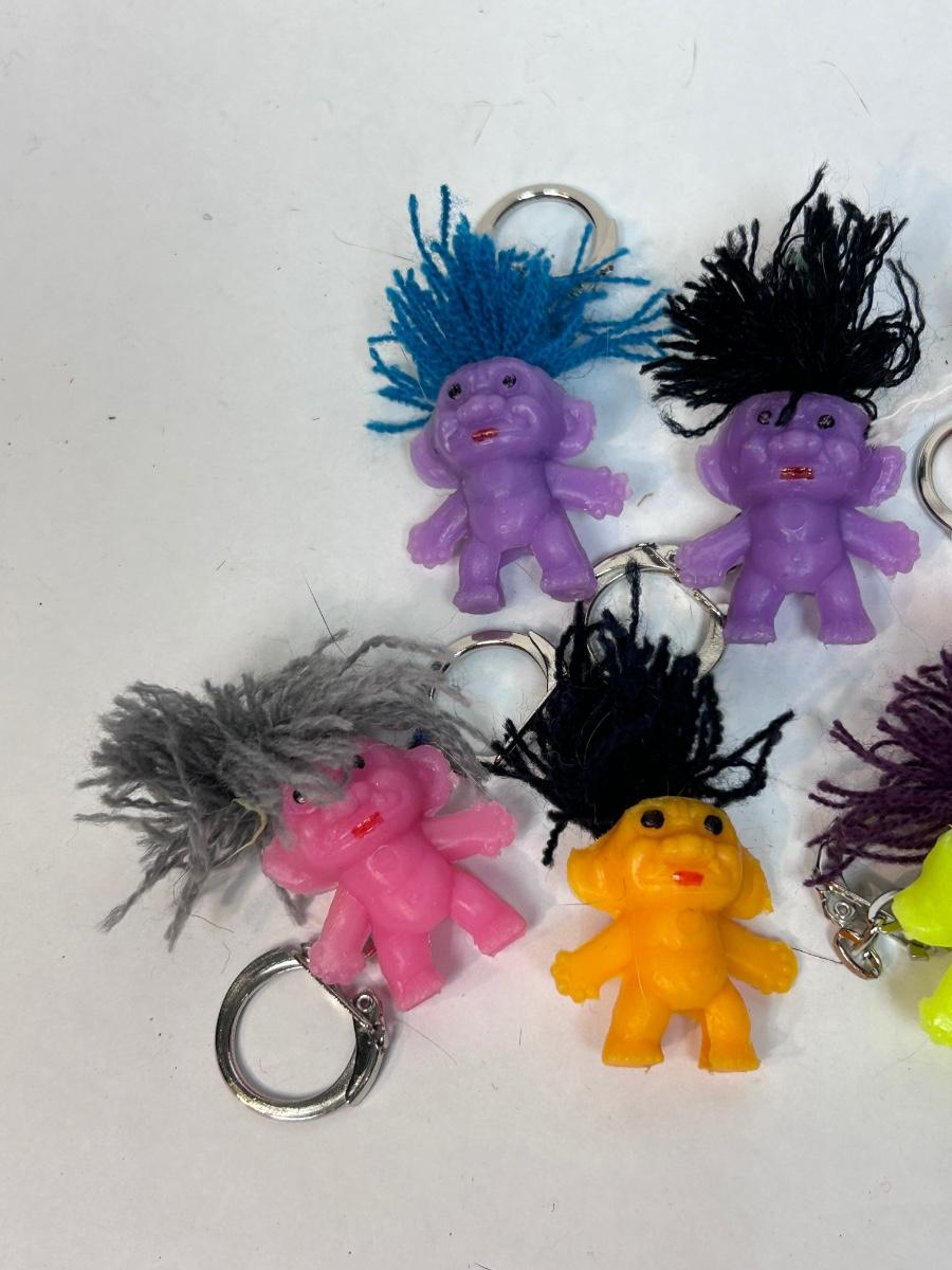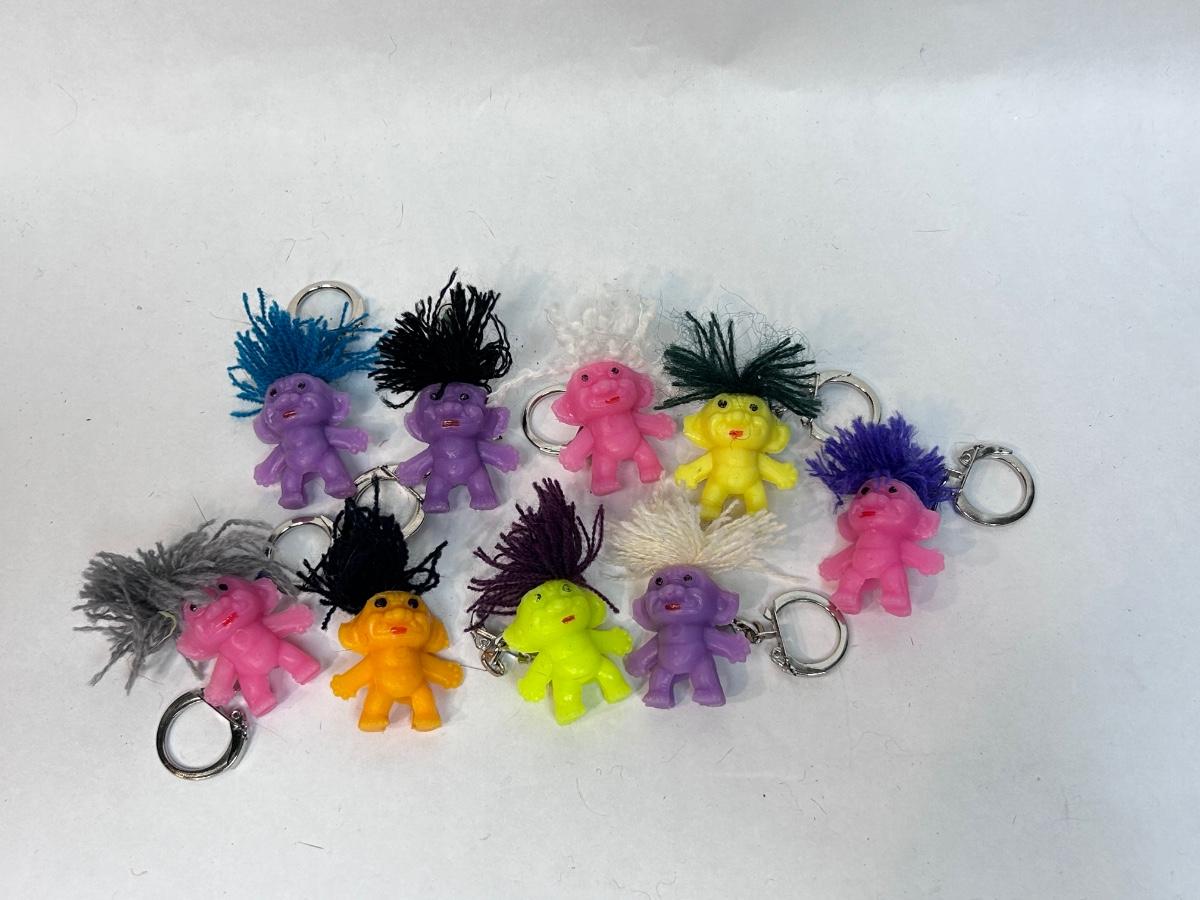 Retro Colorful Yarn Hair Troll Like Keychain Party Favors. Knock off troll party favors.