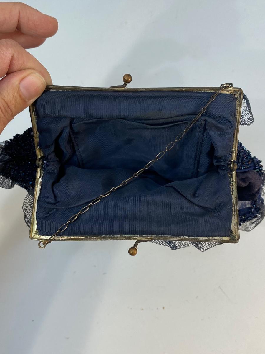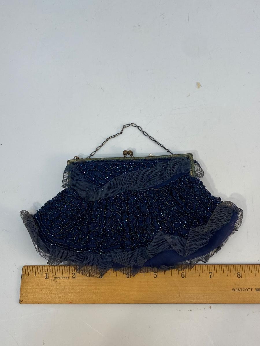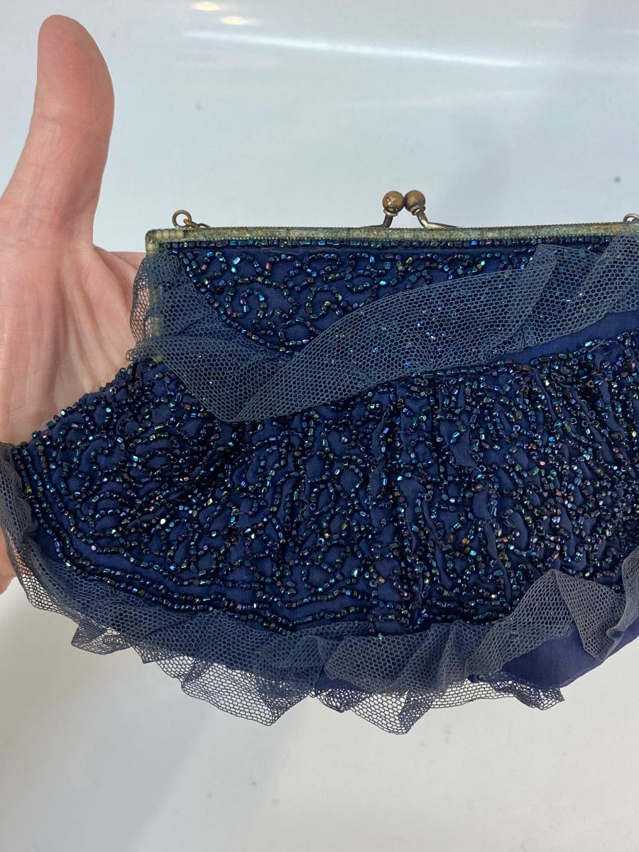 Vintage Antique Small Navy Blue Beaded & Ruffled Evening Bag Clutch Handbag. Good vintage condition. It is missing some bead work in the metal frame but in overall good vintage condition.